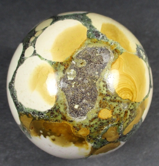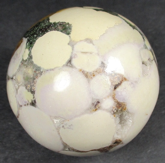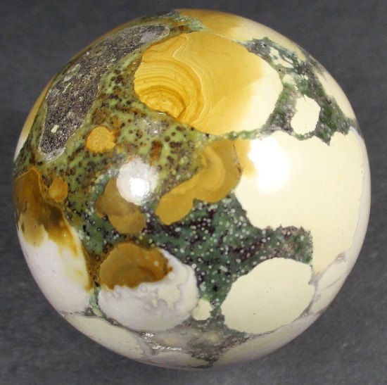 This material is a new find from Madagascar. The deposit formed as a rhyolite flow but has been completely silicified. The Rhyolitic eyes or orbs come in an astonishing array of colors and color combinations. The back ground can be white, pink, green, red, or yellow. Botryoidal formations as well as white and deep green druzy are also common. This deposit has been discovered at the edge of the ocean. It can only be seen and collected at low tide. The area has no road so the material must be transported to civilization by boat. This material is fast becoming a rarity in the Jasper ocean fields, so get one while it is still available.