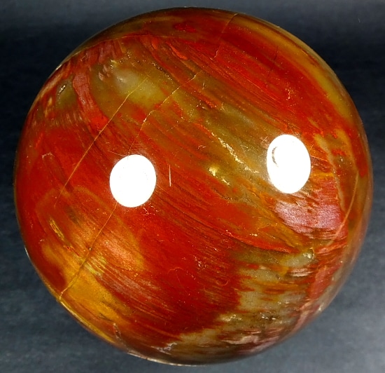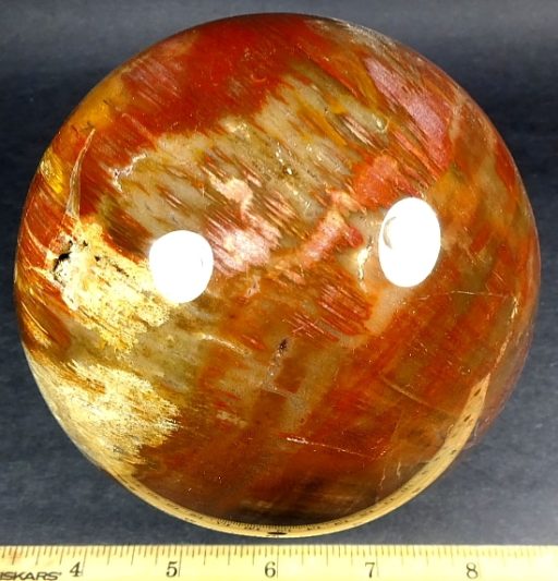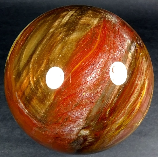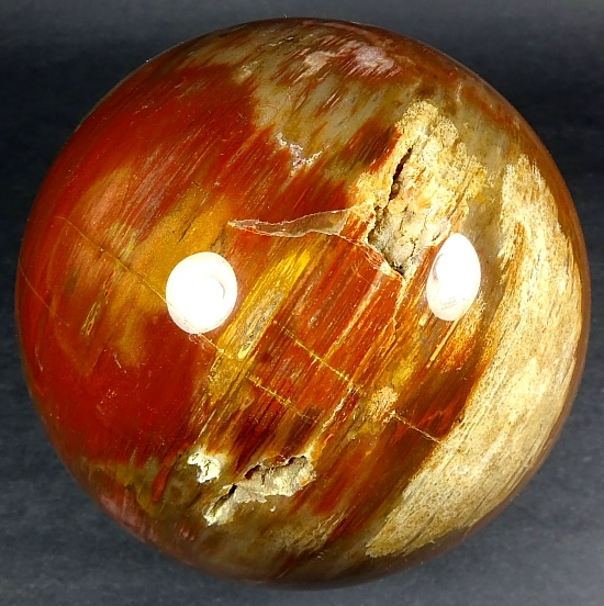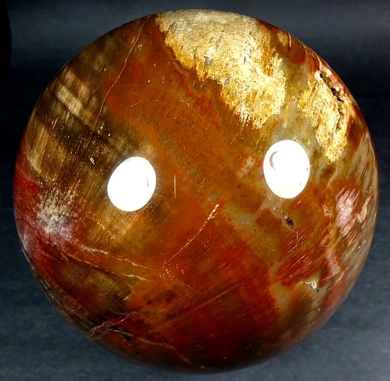 This is an exceptional larger sphere cut from Petrified Wood from Madagascar. The highly polished sphere has nice Brown, Red and Cream colors and shows the different grains of the wood. It has some crystal cavities that gives it that extra touch of class. This very nice sphere is 4 1/2″ in diameter and weighs nearly 5 pounds.  A superb sphere!