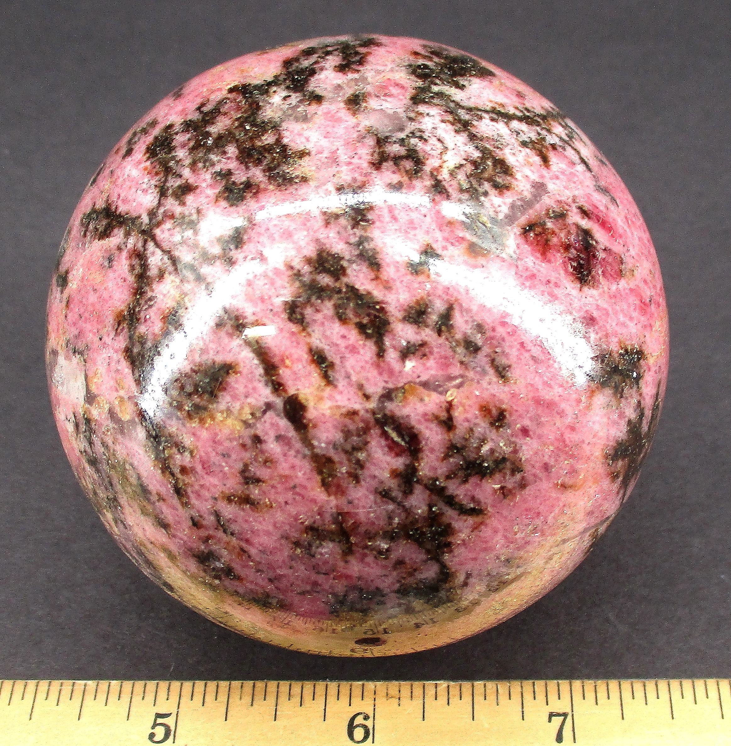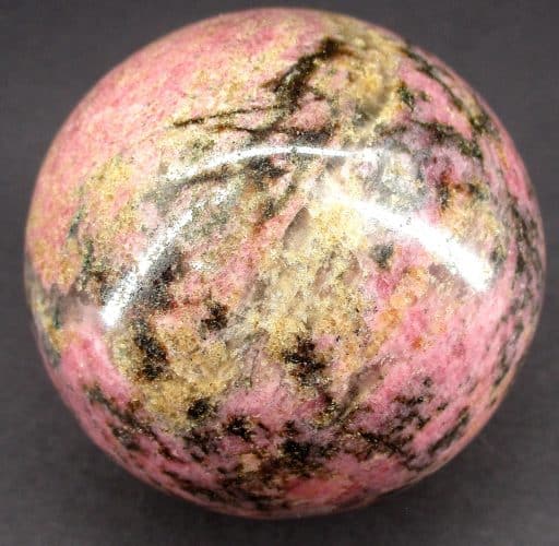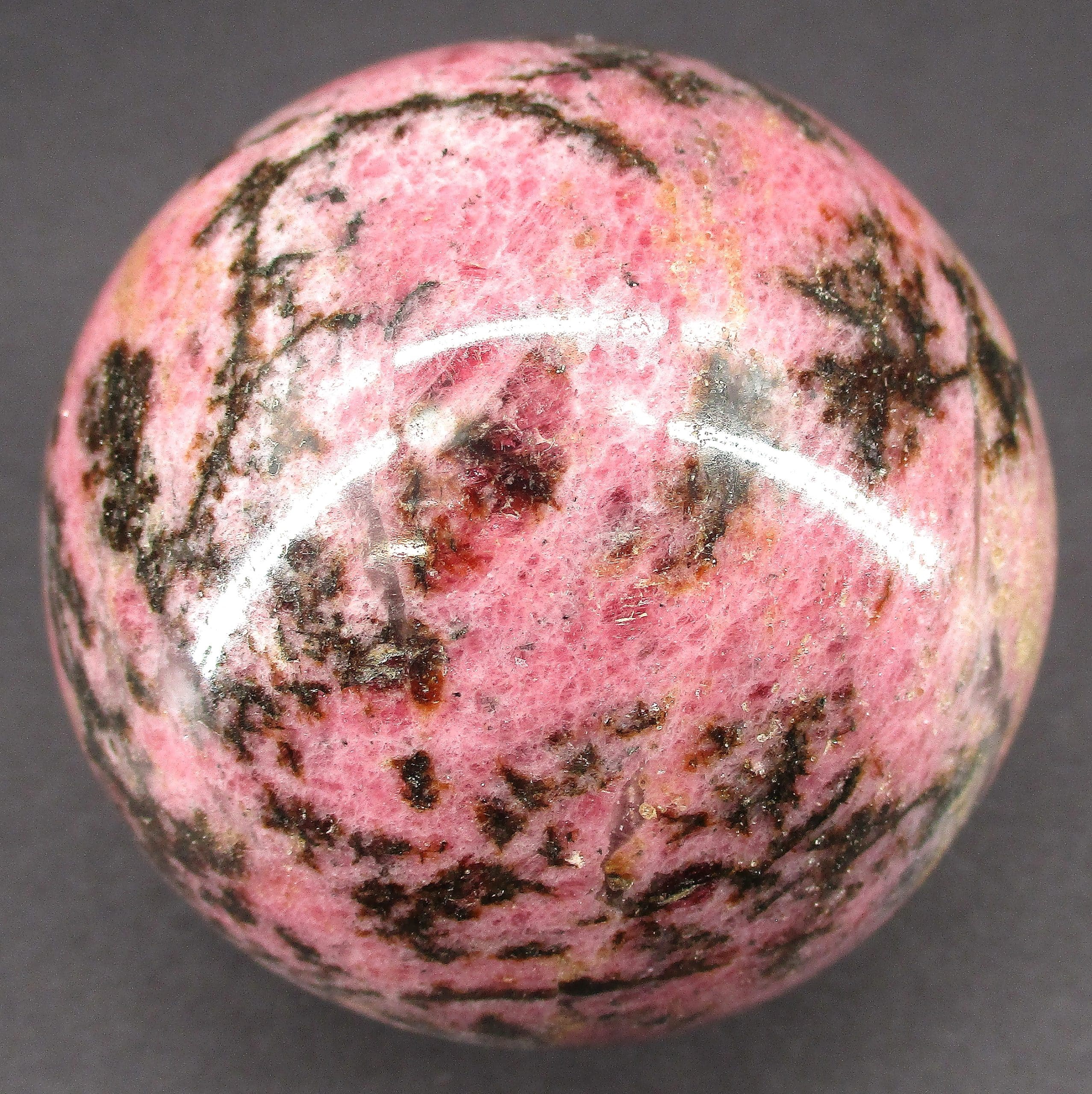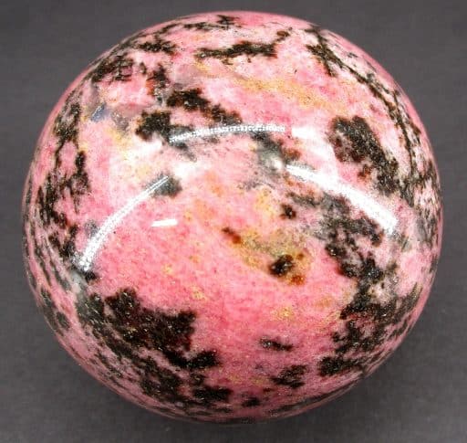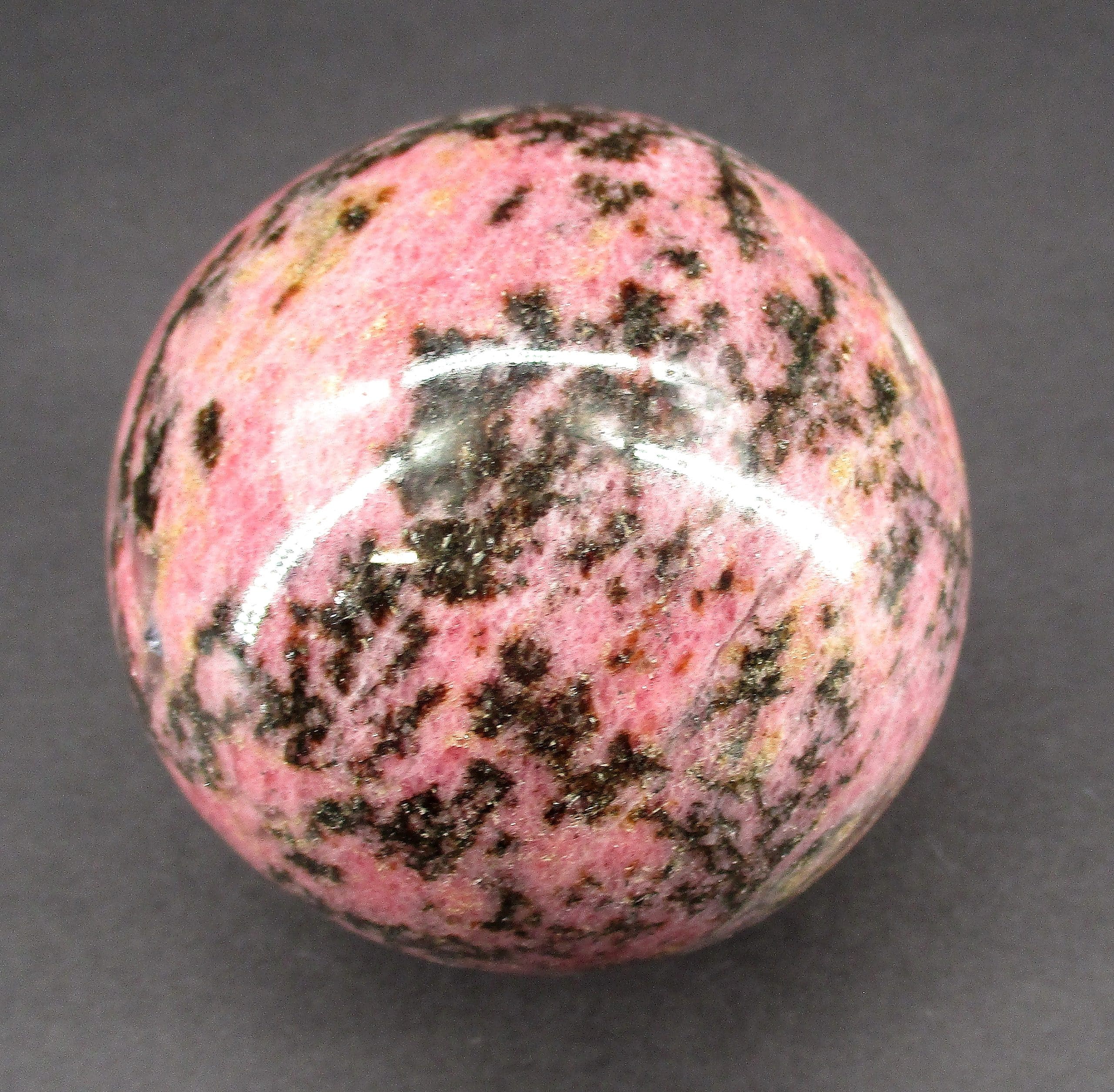 This is an amazing Rhodenite sphere. It has the pretty pink colors of Rhodenite with contrasting accents dispersed throughout. This nice quality sphere is 2 7/8 in diameter with a good polish. A unique sphere for a serious sphere collection or just to have.