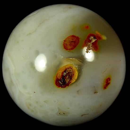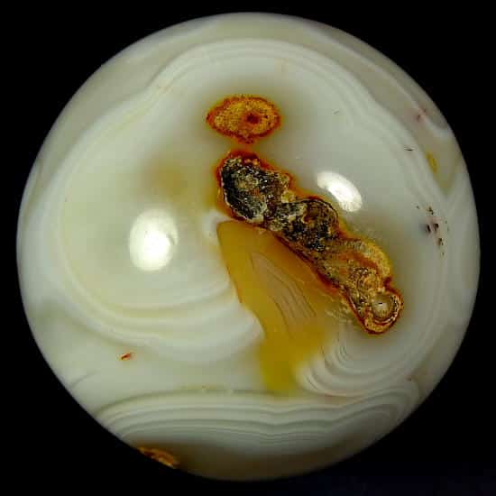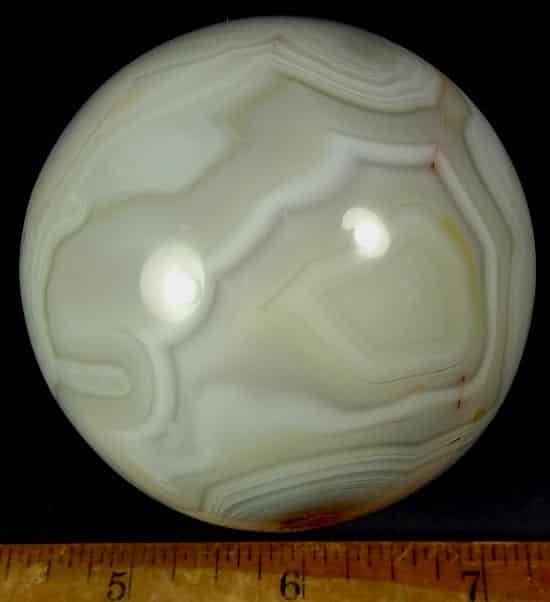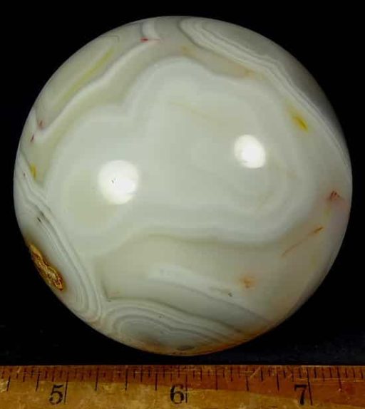 This is an exceptional Agate sphere from Uruguay. This sphere measures 2 1/2″ and has a good polish. It has an interesting combination of yellow, white and grey colors in a mesmerizing design as well as great banding. An interesting sphere that would complete any collection.
