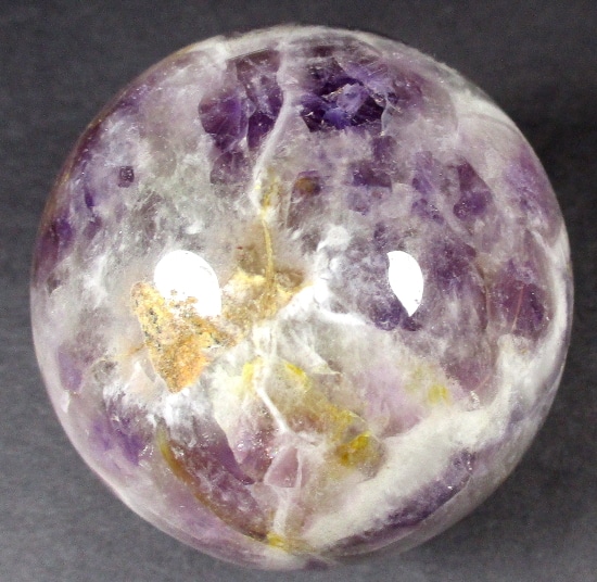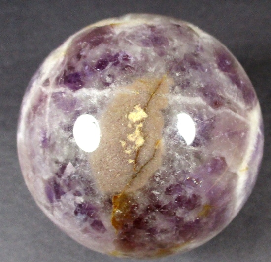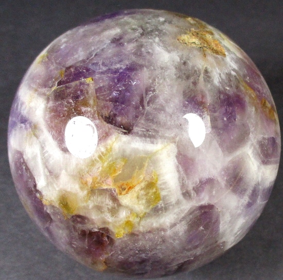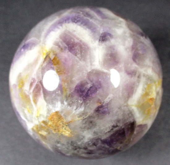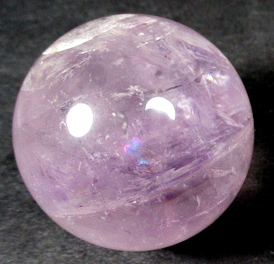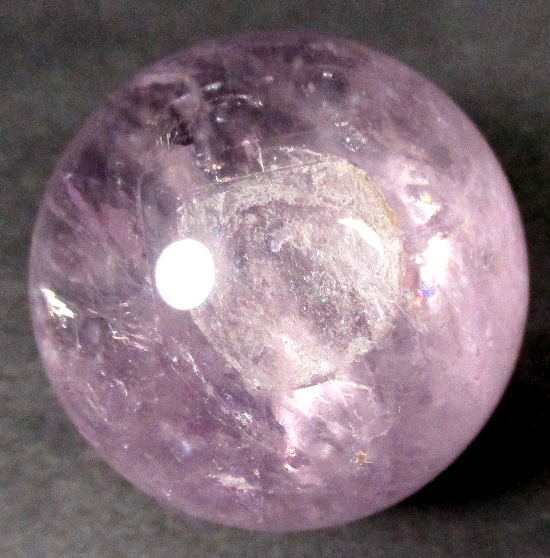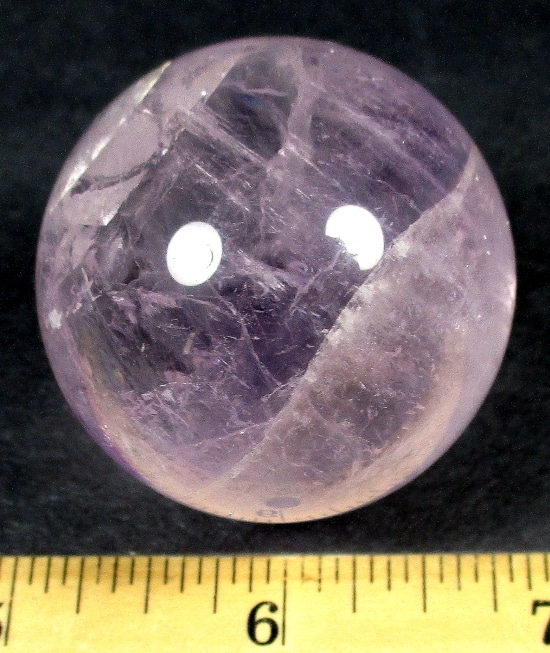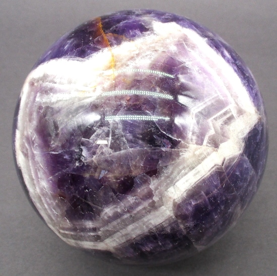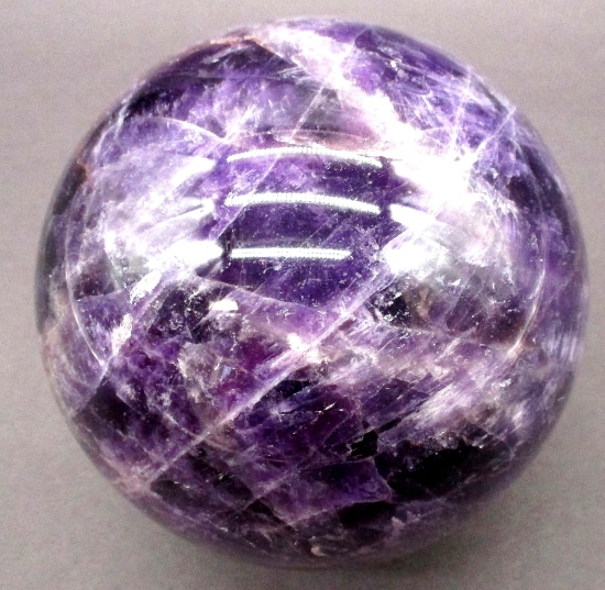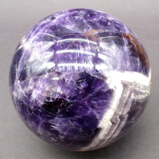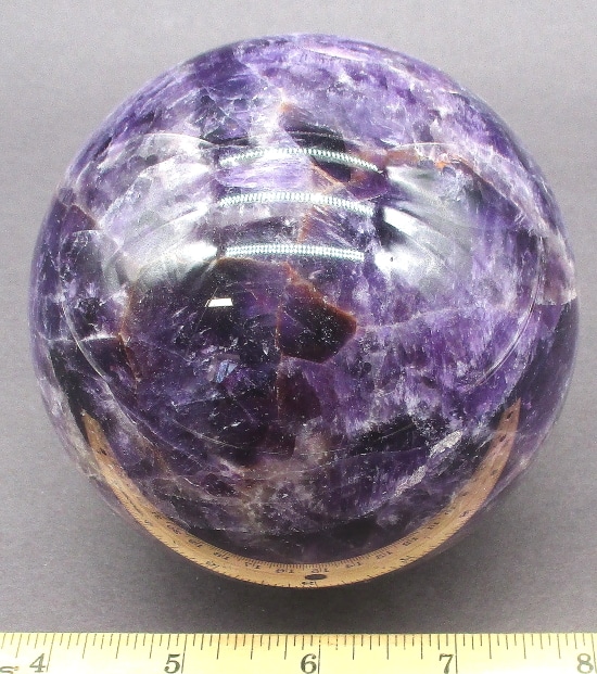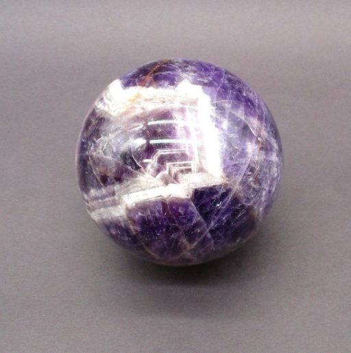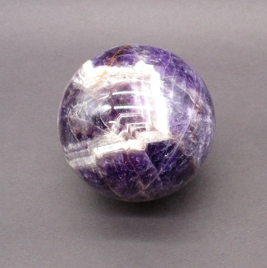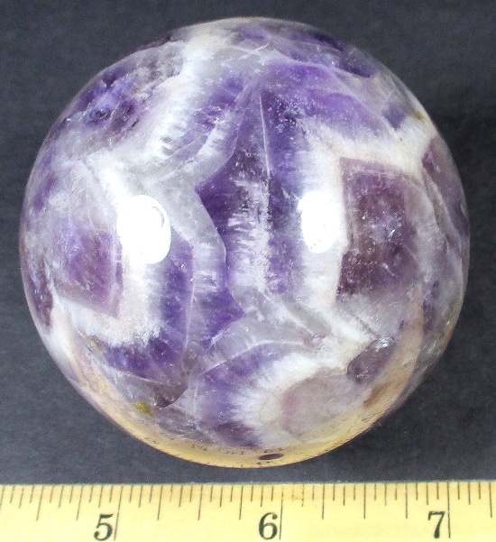Here’s an exceptional Chevron Amethyst sphere. This sphere measures 3 1/2″.  It has a nice polish with a great purple color, neat inclusions, good clarity and even subtle “rainbow” reflections. Very pretty!