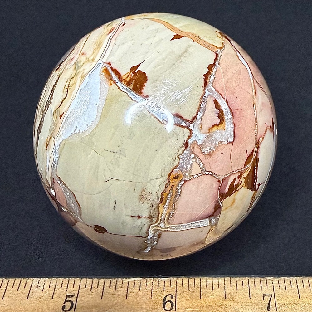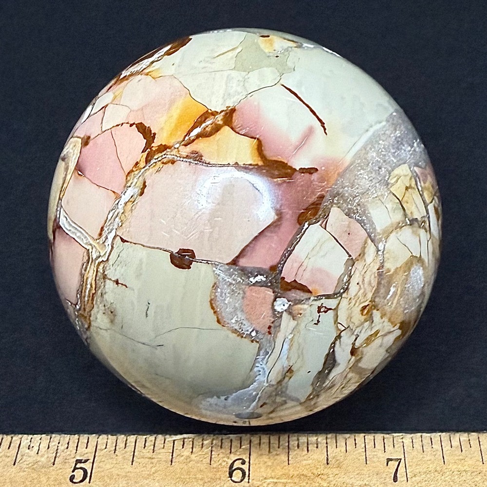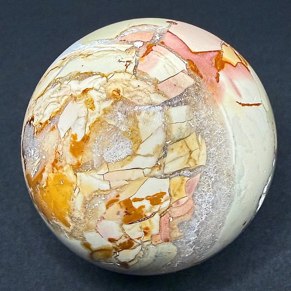 There are many types of jasper. Brecciated jasper is jasper that has been broken up internally and cemented together with chalcedony. The most common form is red or yellow jasper cemented with grey chalcedony, but there are many other color variations. The brecciation often leaves angular lines of jasper cut across the stone. Brecciated jasper can appear to be similar to breccia, a sedimentary rock composed of rock fragments in a cementing fine-grained matrix.