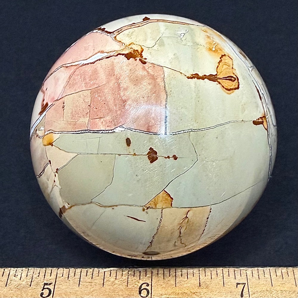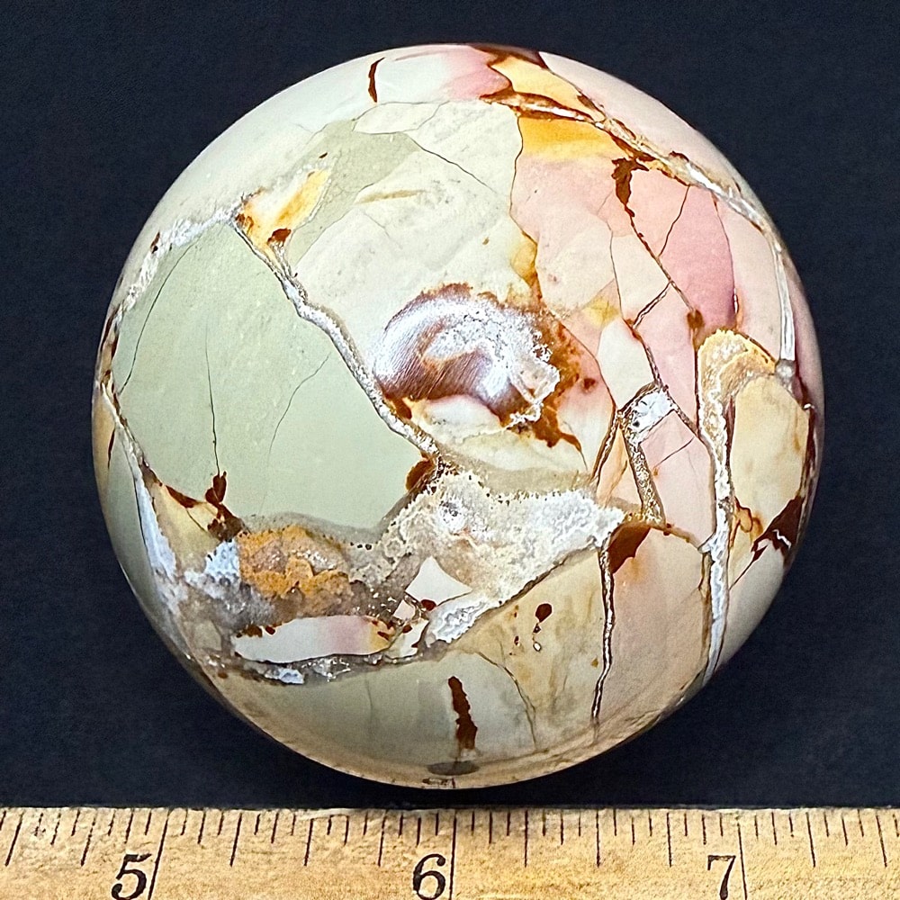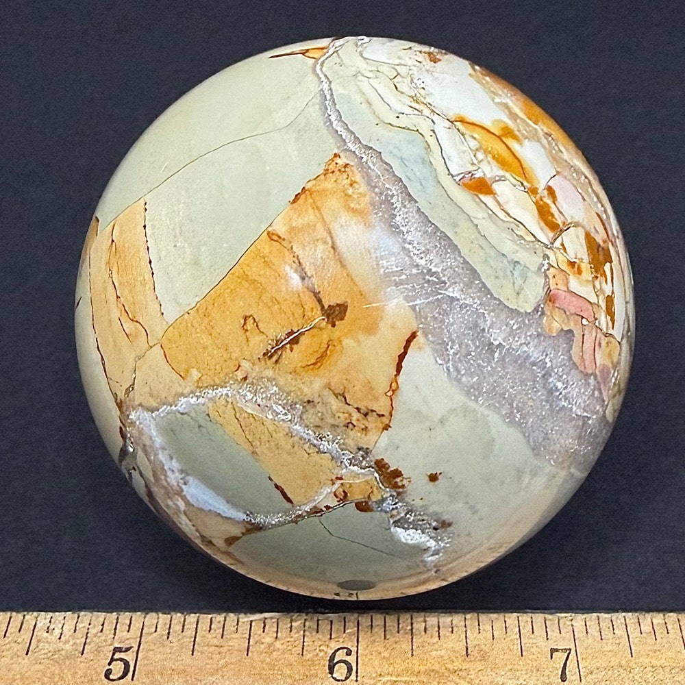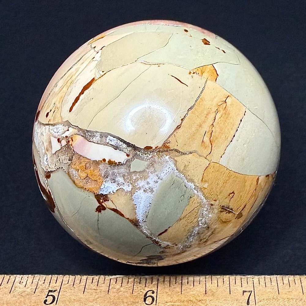 There are many types of jasper. Brecciated jasper is jasper that has been broken up internally and cemented together with chalcedony. The most common form is red or yellow jasper cemented with grey chalcedony, but there are many other color variations. The brecciation often leaves angular lines of jasper cut across the stone. Brecciated jasper can appear to be similar to breccia, a sedimentary rock composed of rock fragments in a cementing fine-grained matrix.