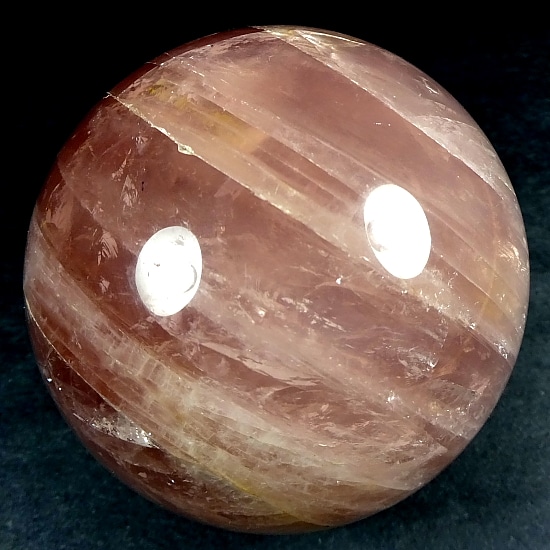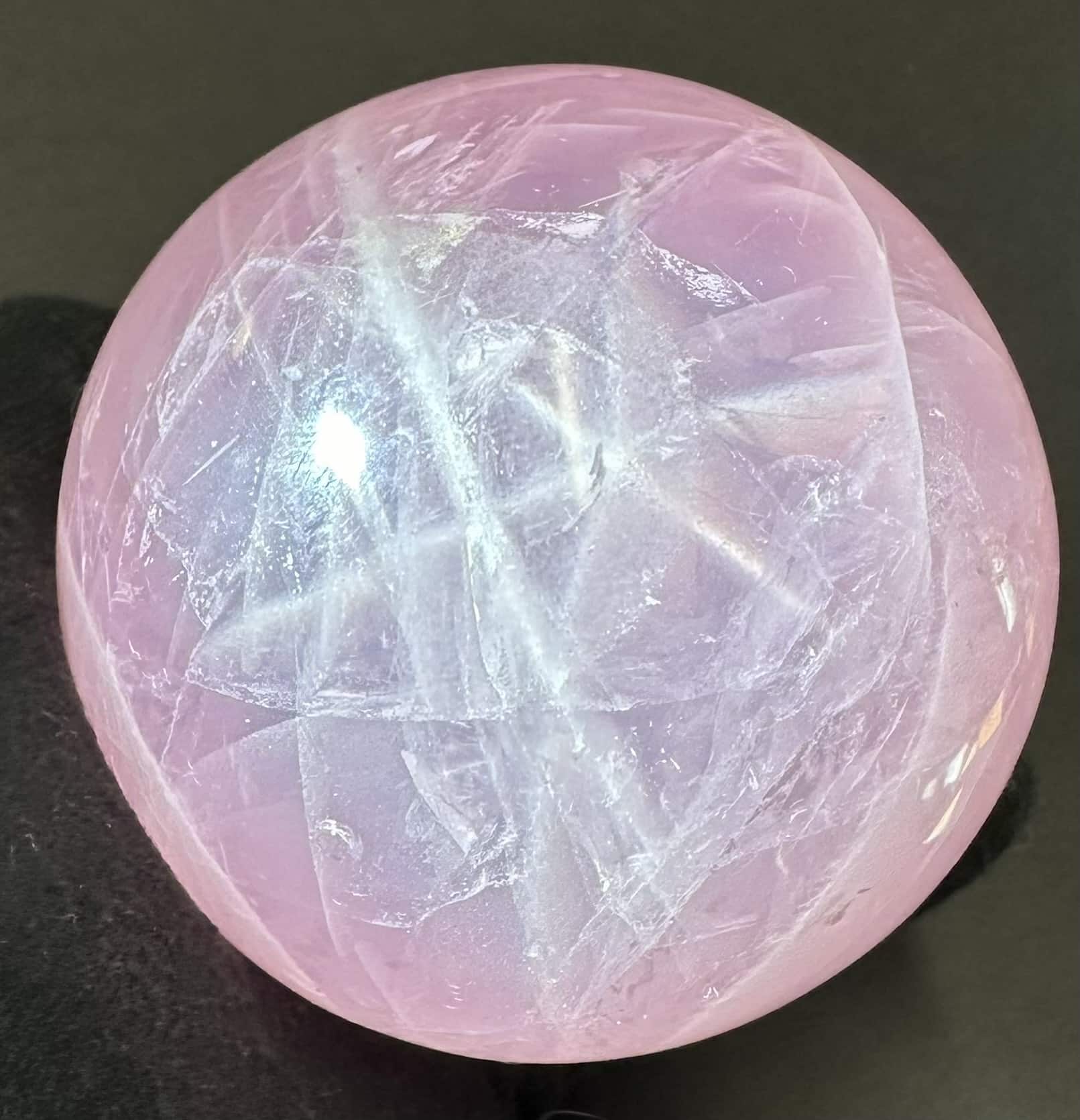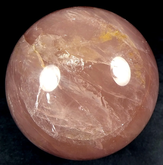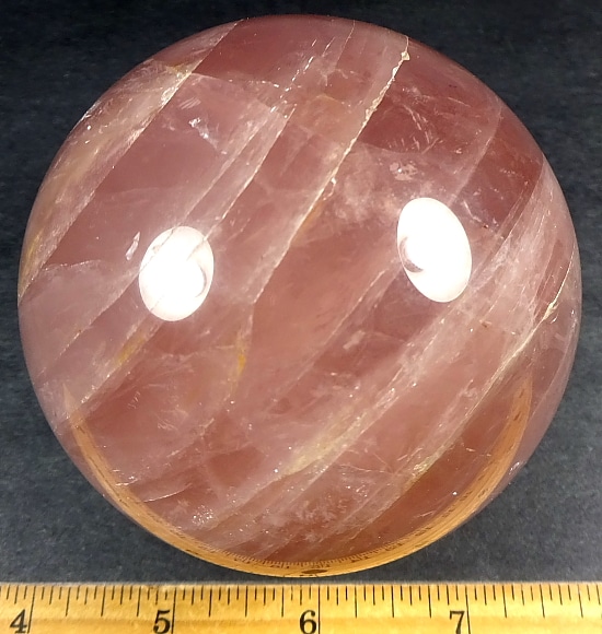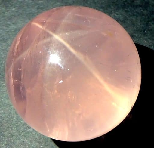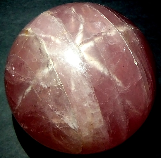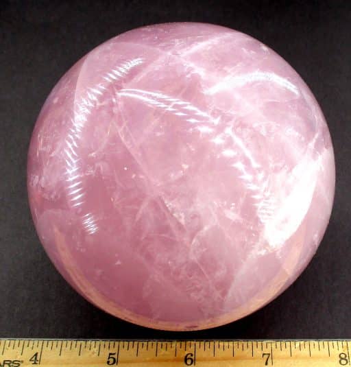 This is an exceptional Rose Quartz sphere from Madagascar.  It measures 3 3/8″ in diameter and has a very good polish.  It has great clarity, amazing inclusions, “rainbow” reflections and a spectacular 3-D “star” (when rotated in bright light).  Take note of the last photo below, this “star” was taken from a different sphere that gives a better representation of a “star” which is very difficult to capture in a photo. The sphere would make a nice gift for the sphere collector or just keep it for yourself.