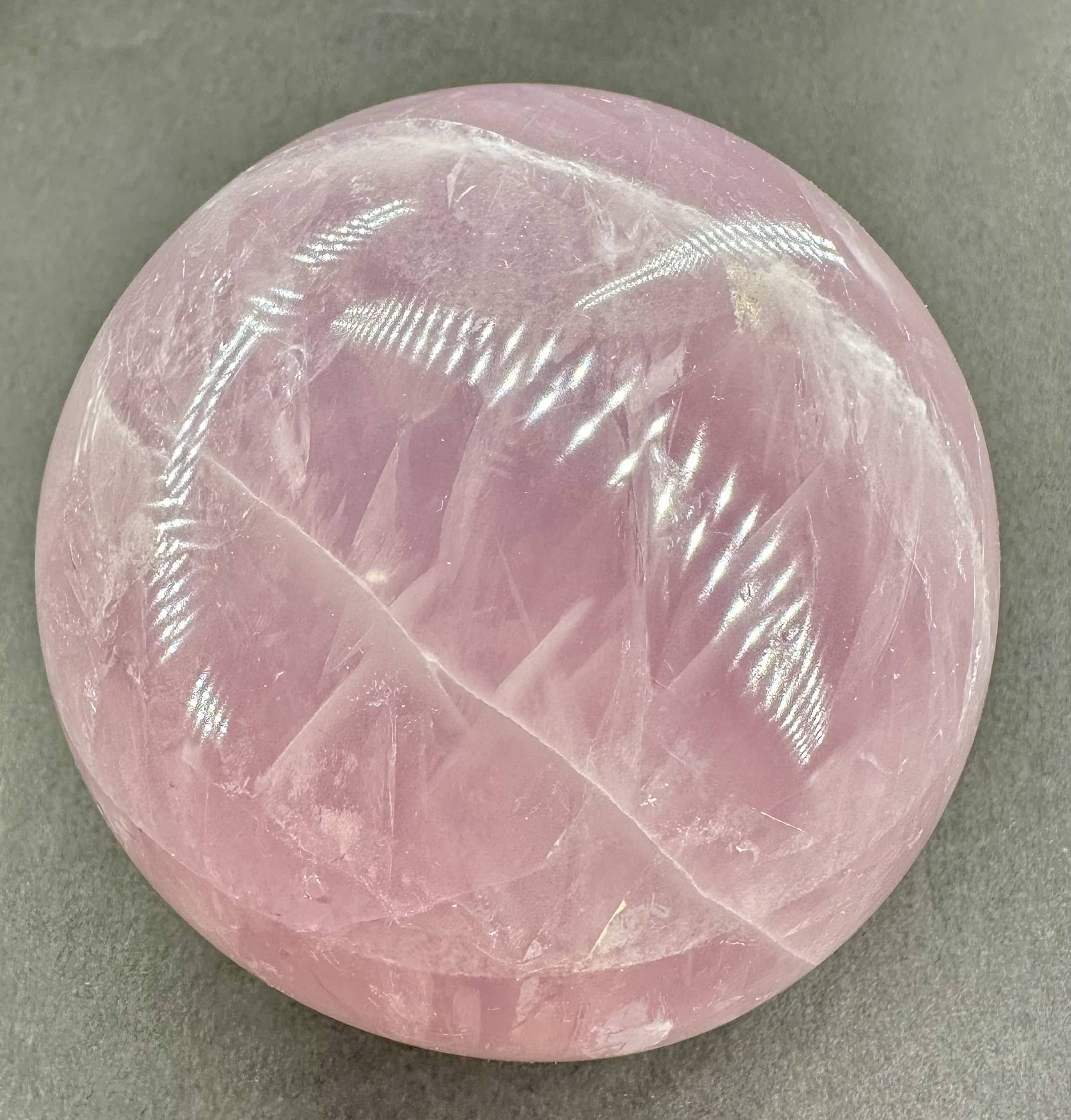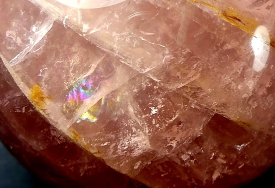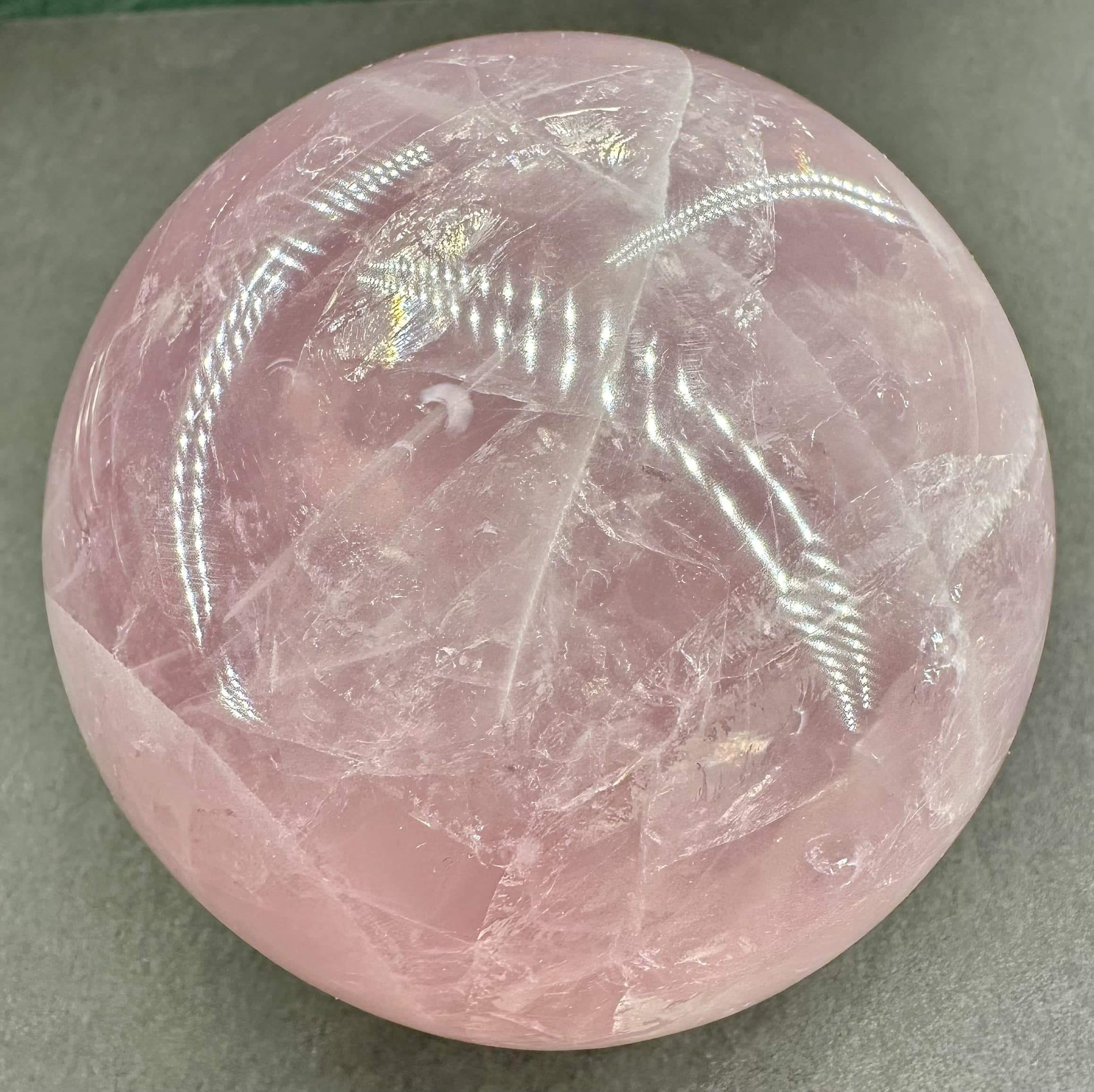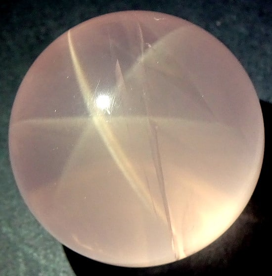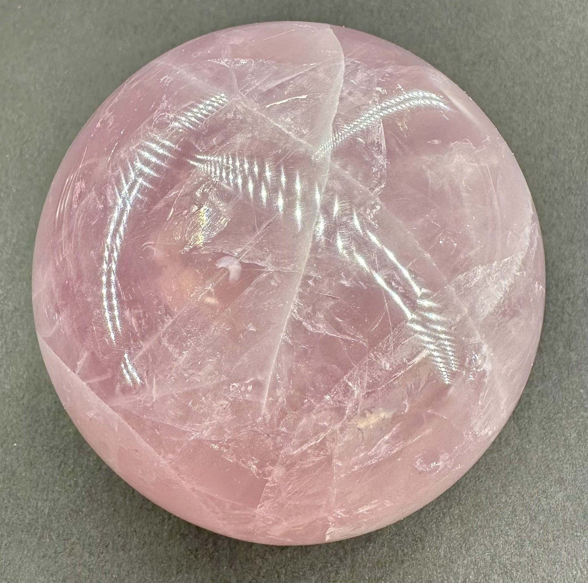 This is an exceptional Rose Quartz sphere from Madagascar.  It measures 3 3/8″ in diameter and has a very good polish.  It has great clarity, amazing inclusions, “rainbow” reflections and a spectacular 3-D “star” (when rotated in bright light).  Take note of the last photo below, this “star” was taken from a different sphere that gives a better representation of a “star” which is very difficult to capture in a photo. The sphere would make a nice gift for the sphere collector or just keep it for yourself.