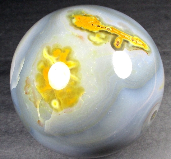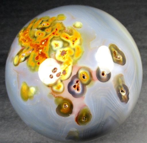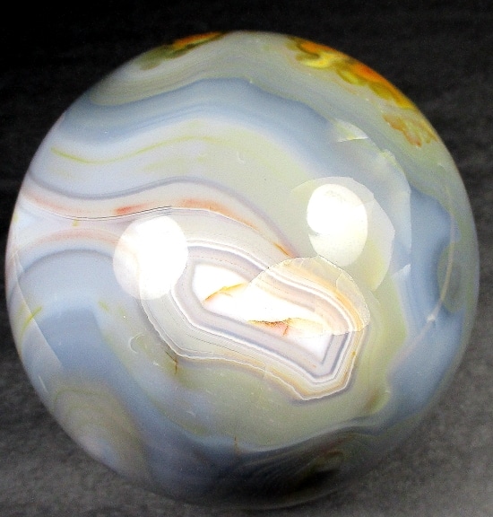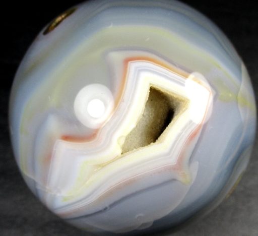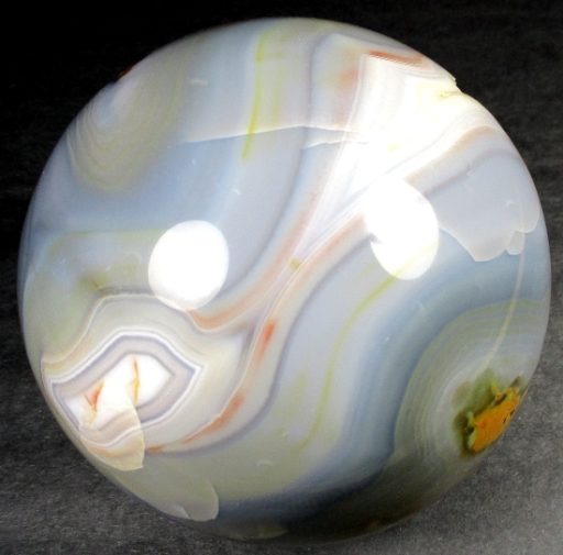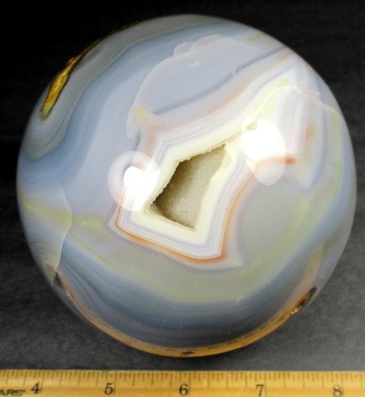 Here is a very unique sphere!  This is a very nice Agate sphere from Madagascar.  The sphere measures 3 7/8″ in diameter and has a highly polished finish.  The sphere has a soft Blue, White and Grey colors with lots of neat accents, surprising crystal cavity and amazing banding. It does have a few fractures which does not affect it’s stability and is reflected in the reduced price. This sphere is truly unique and a one-of-a-kind beauty.