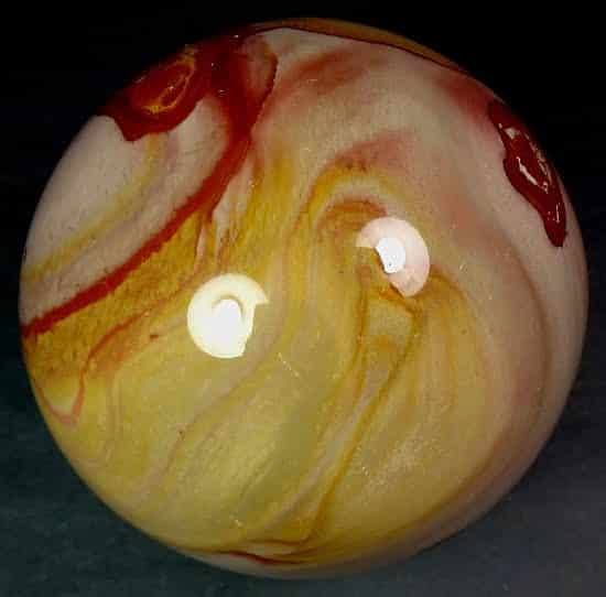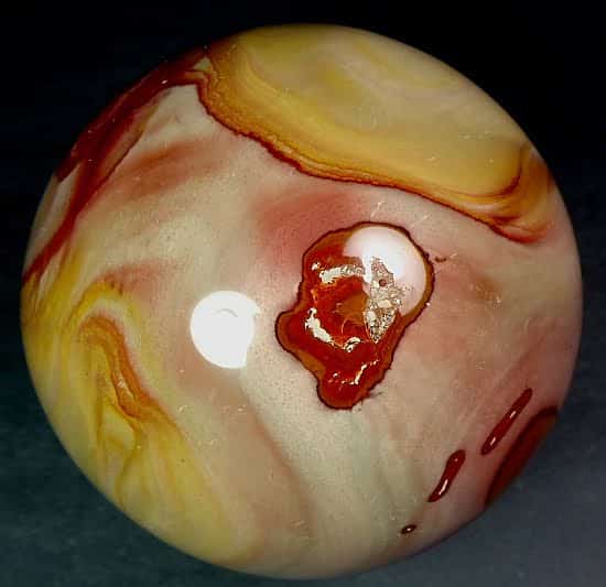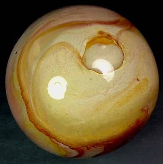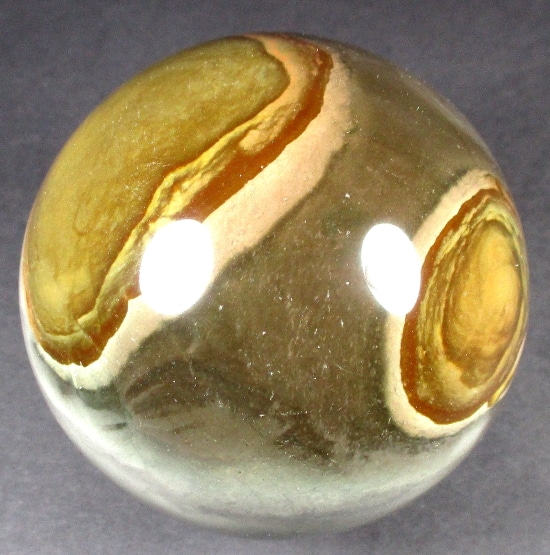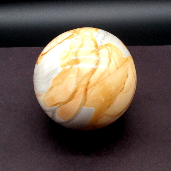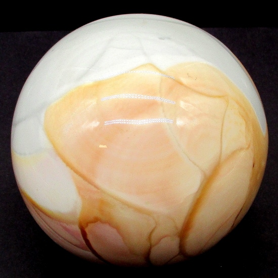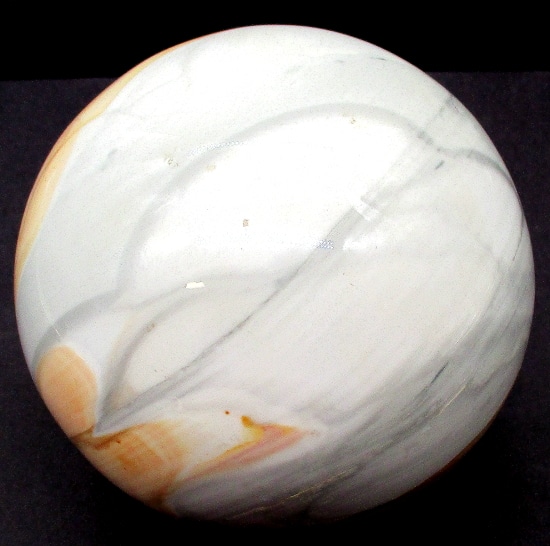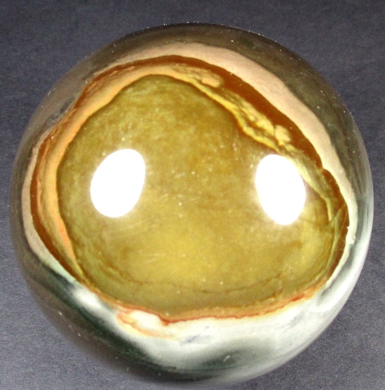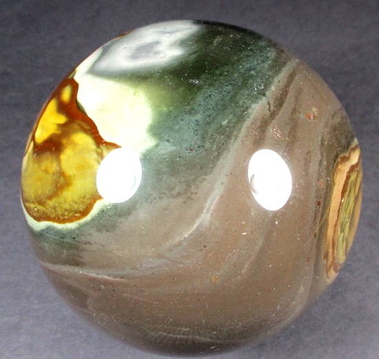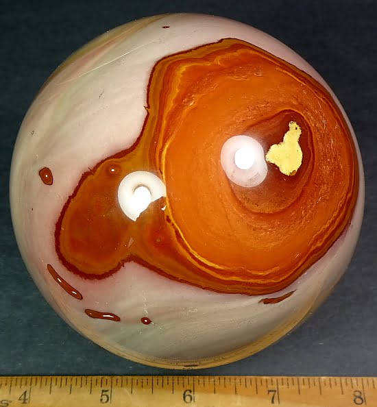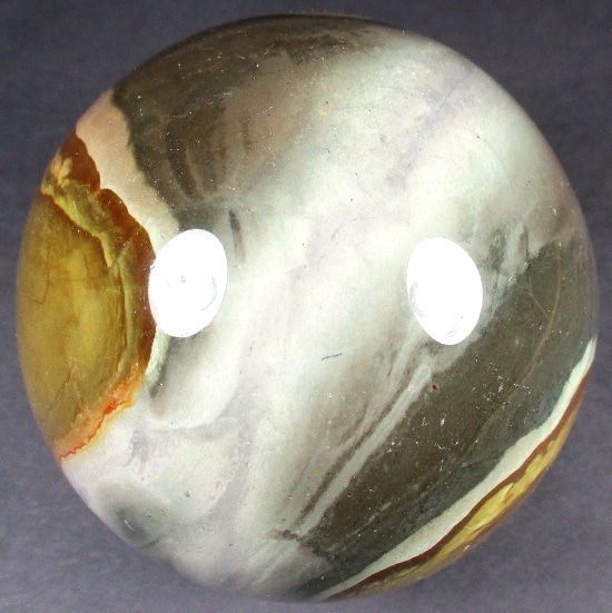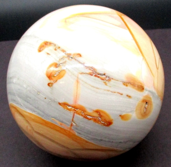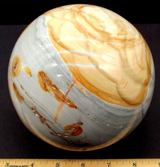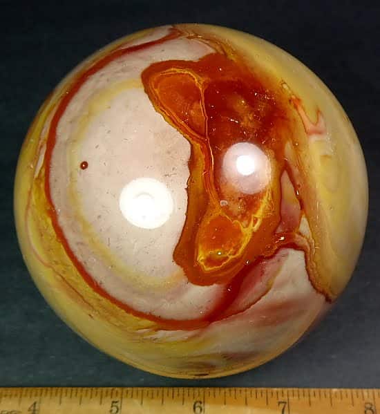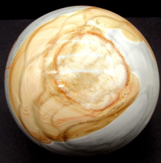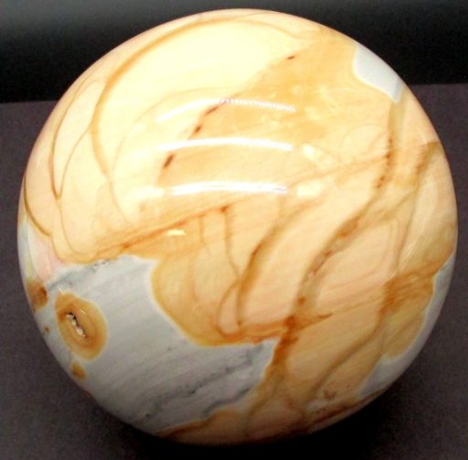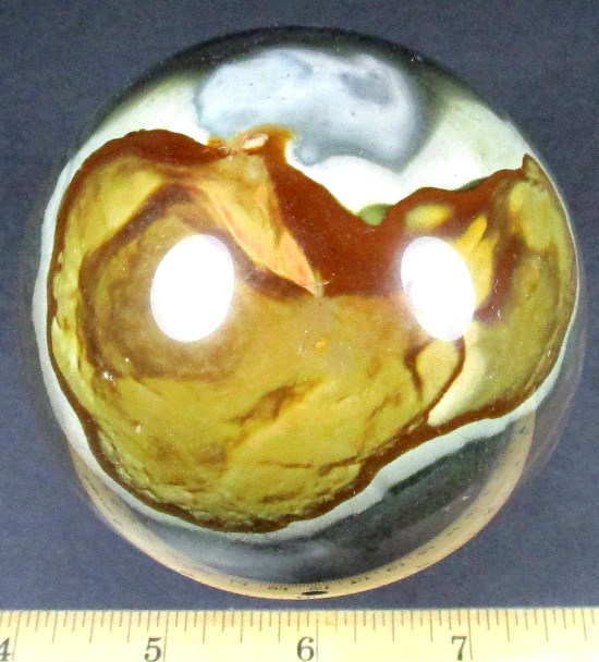Here is something different for the sphere collector.  This is a very beautiful larger Poly Chrome Jasper sphere that measures 5 1/8″ in diameter and has a nice polish.  It has a neat blend of contrasting colors all in a fabulous design!