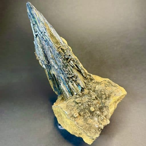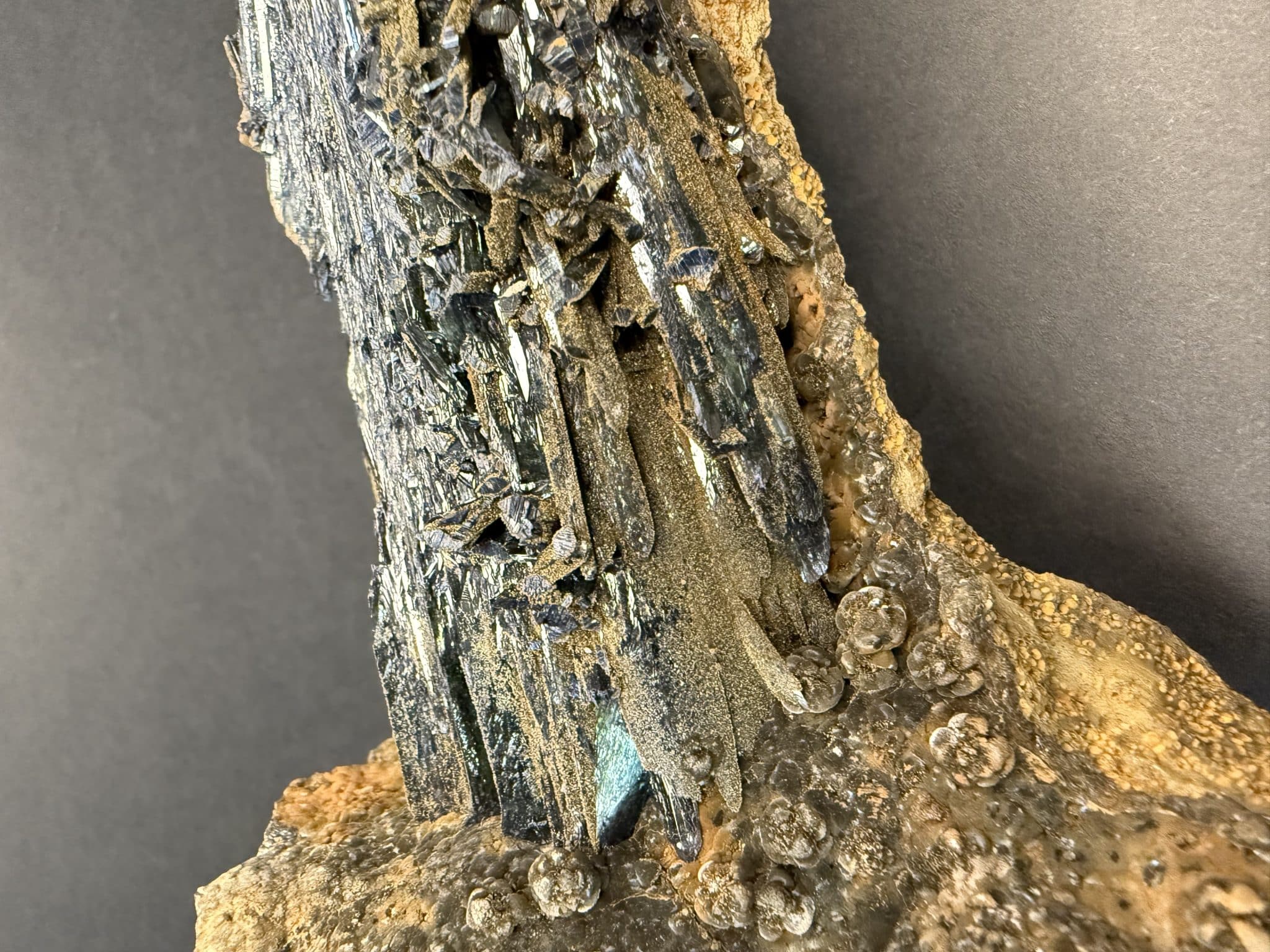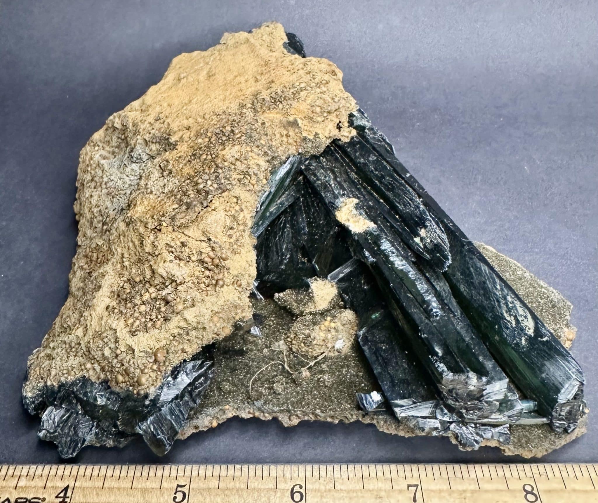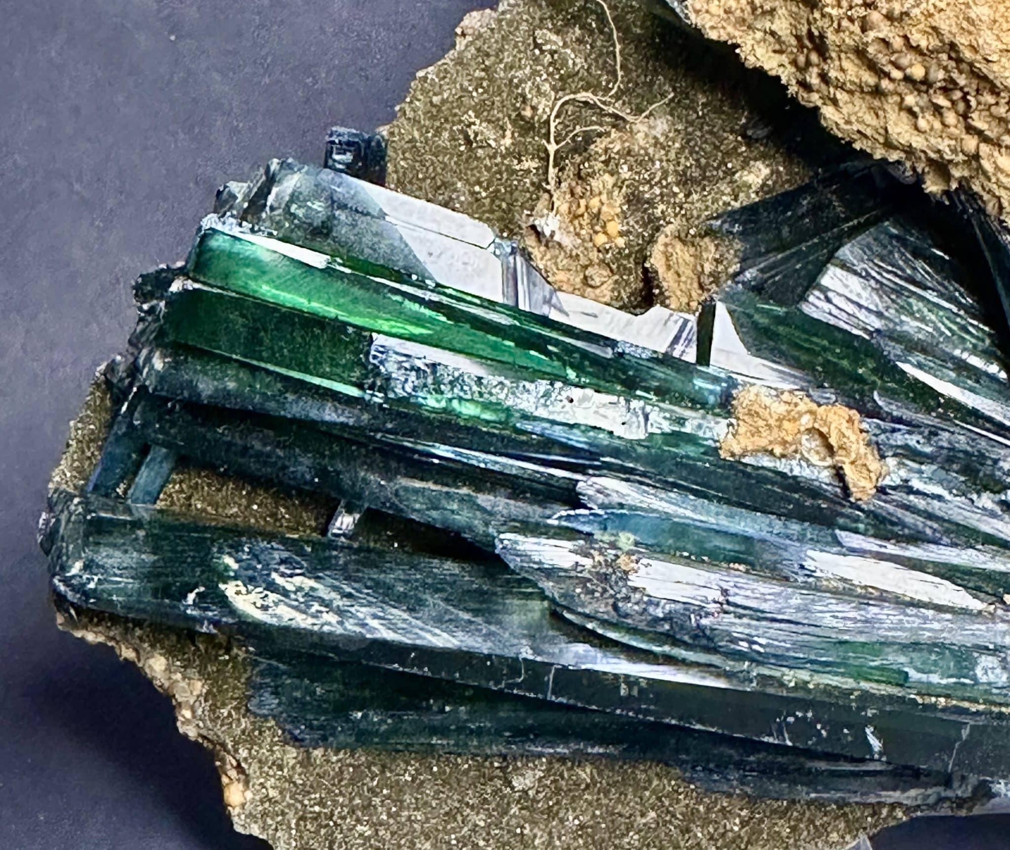 Vivianite is a hydrated iron phosphate mineral found in a number of geological environments. Small amounts of manganese, magnesium and calcium may substitute for iron in the structure. Colorless, very pale green, becoming dark blue, dark greenish blue, indigo-blue, then black with oxidation.