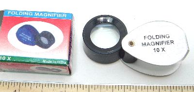 This folding loupe magnifies gemstones and other jewelry-making components to ten times their actual size. The loupe is travel size, making it ideal for tradeshows and markets.