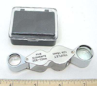 This folding loupe features two lenses: a 12mm 20x magnification lens and an 18mm 10x magnification lens. The loupe is travel size, making it ideal for tradeshows and markets.