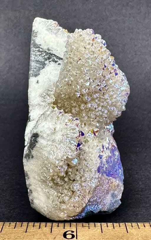 Angel Aura is a metallic light red and gold tint on Clear Quartz from an electrical infusion of gold powder. They are created by a special process treating the natural Quartz crystals with vaporized, finely powdered pure gold. This results in a stunning iridescent rainbow flash on the brilliant crystals. Angel Aura is said to have many positive effects in the metaphysical world.