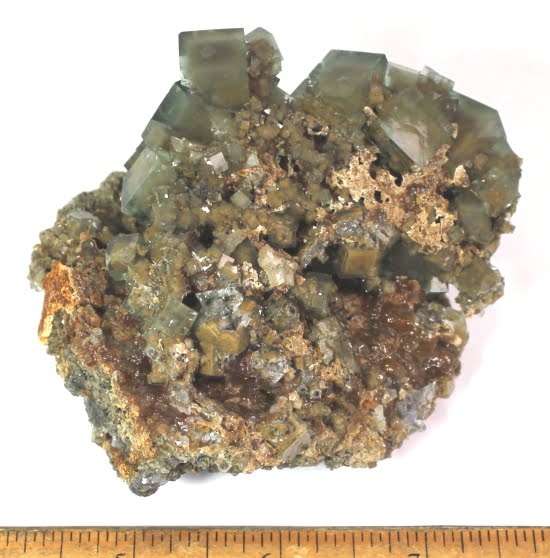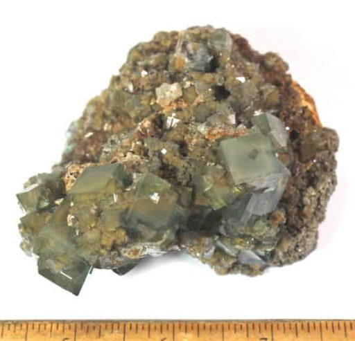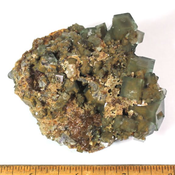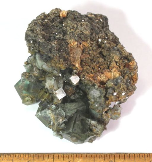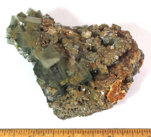 Here is something very different at the Rock Shed.  This is a high quality specimen of Fluorite in a matrix from China.  The pretty Aqua Green Fluorite crystals of various sizes are scattered about the matrix.  The lovely specimen measures almost 3 5/8″ x nearly 2 7/8″ x almost 2 1/8″ and has its own natural shine in areas.  This all natural mineral has an unique character and makes a great addition to your collection.