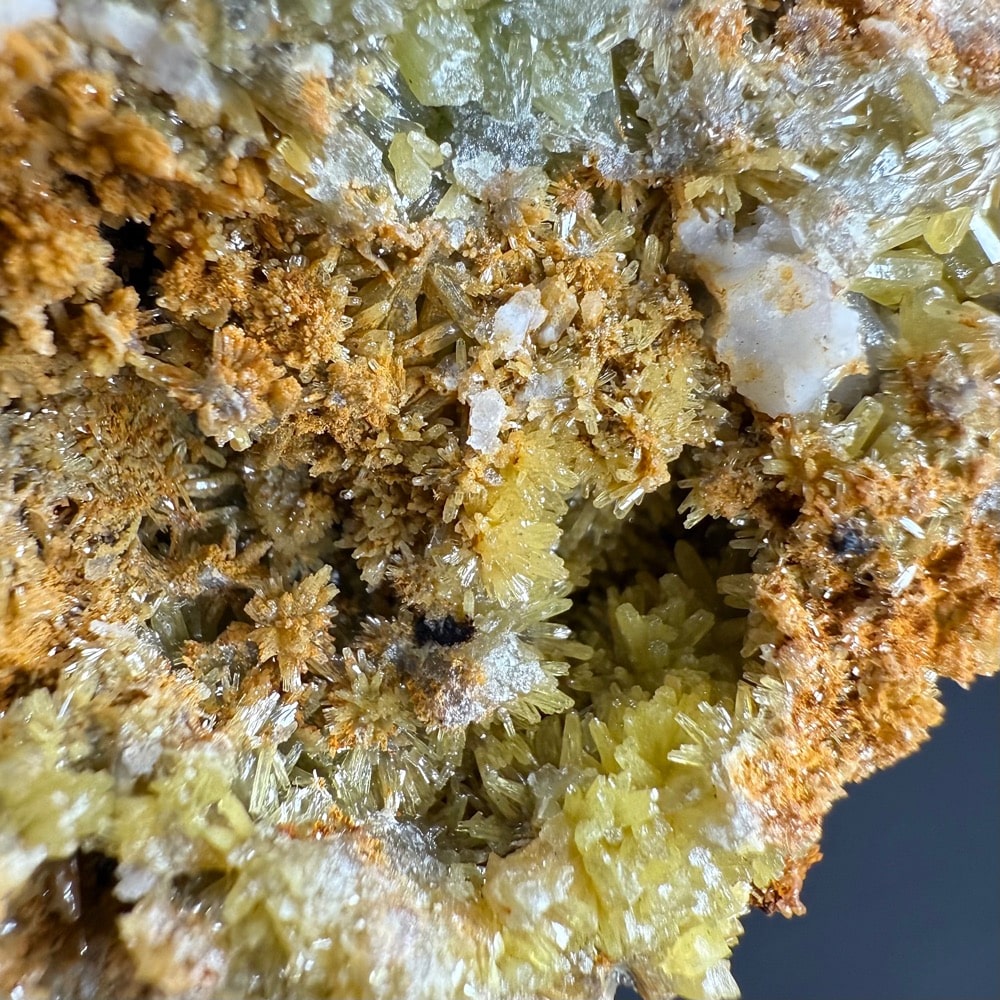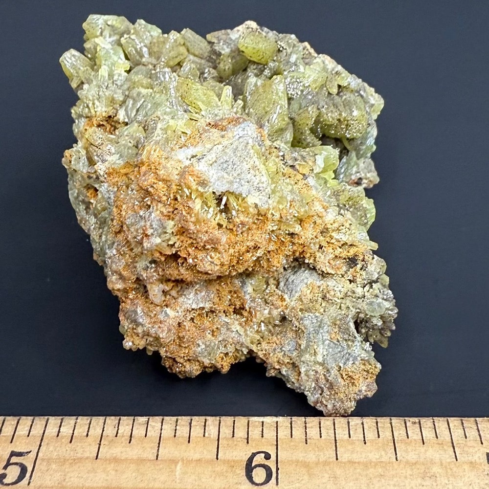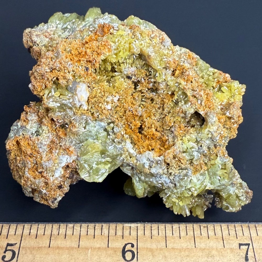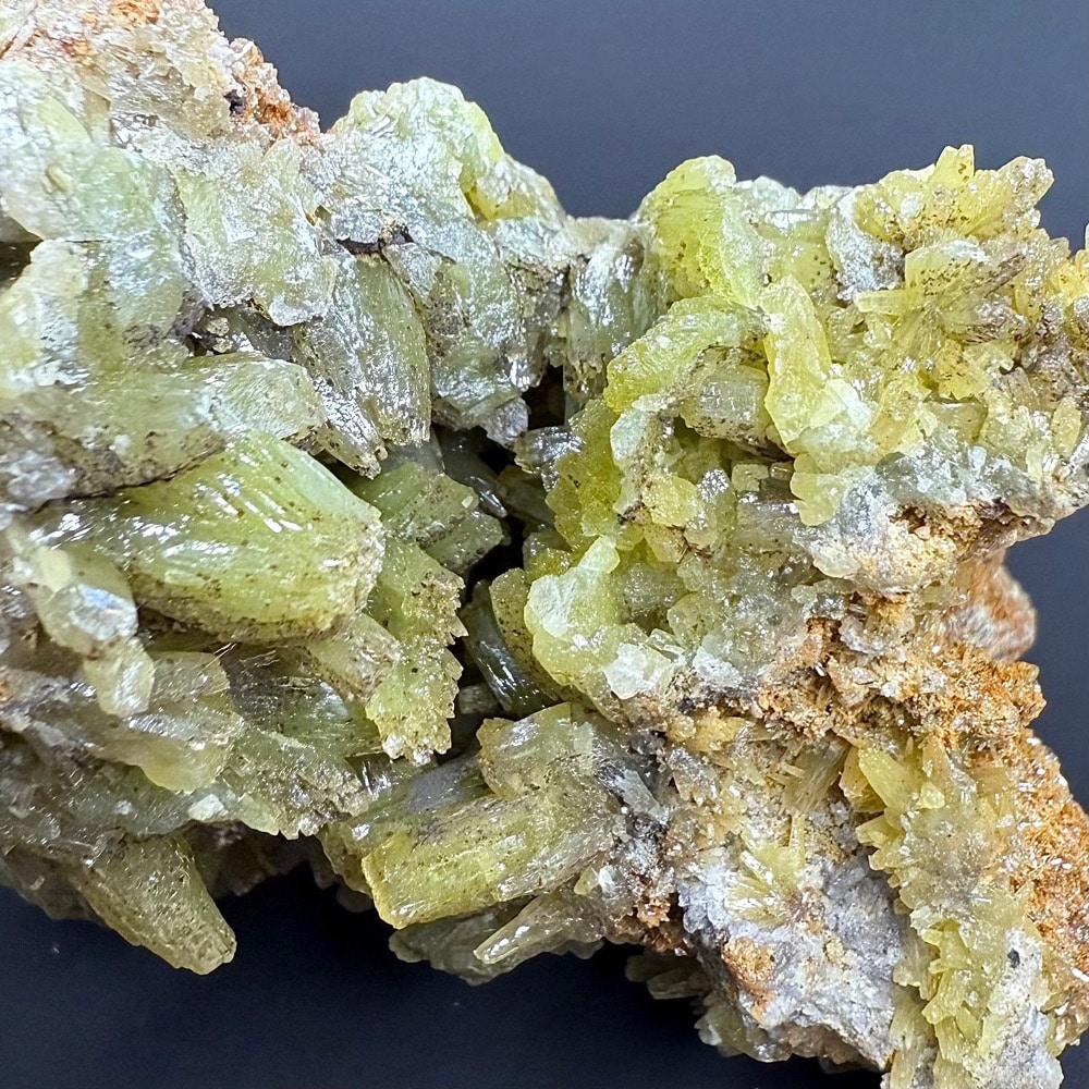 Pyromorphite is mineral species composed of lead chlorophosphite. sometimes occurring in sufficient abundance to be mined as an ore of lead. Crystals are common and have the form of a hexagonal prism terminated by the basal planes, sometimes combined with narrow faces of a hexagonal pyramid. Crystals with a barrel-like curvature are not uncommon. Globular and reniform masses are also found. It is part of a series with two other minerals; mimetite and vanadinite, the resemblance in external characters is so close that, as a rule, it is only possible to distinguish between them by chemical tests. They were formerly confused under the names green lead ore and brown lead ore.