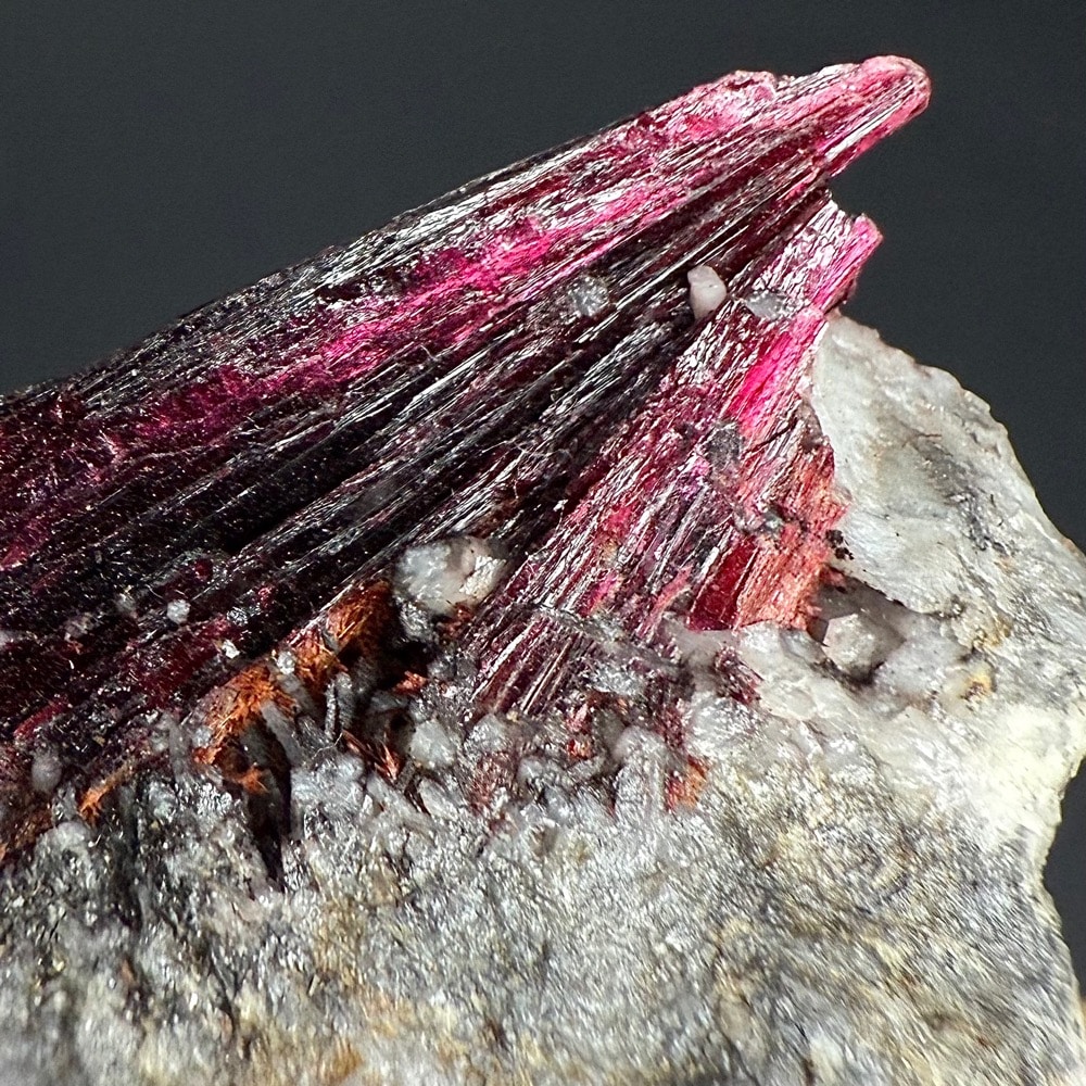 Erythrite occurs as a secondary coating on arsenide minerals and is a bright crimson, pink in color. The bright color or “Cobalt Bloom” was used to spot cobalt veins of ore. Most Erythrite is found in the form of crusts but specimens from Morocco have larger crystals of the unique and attractive red-purple color.