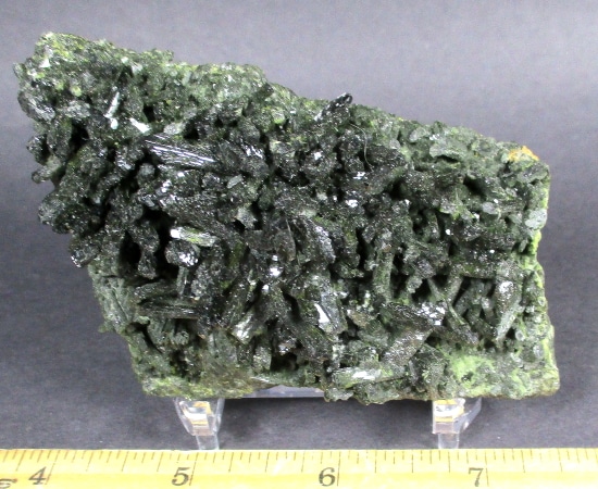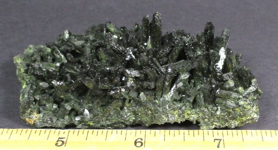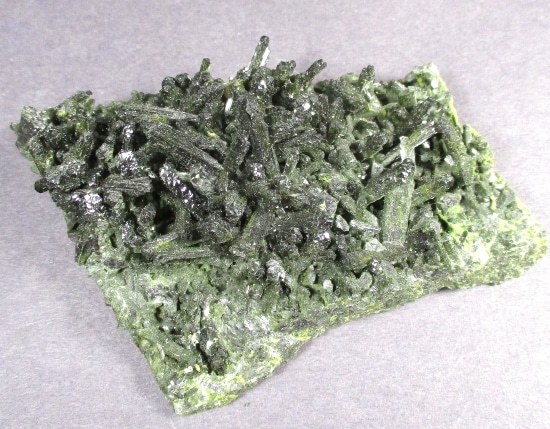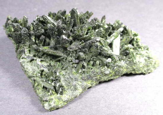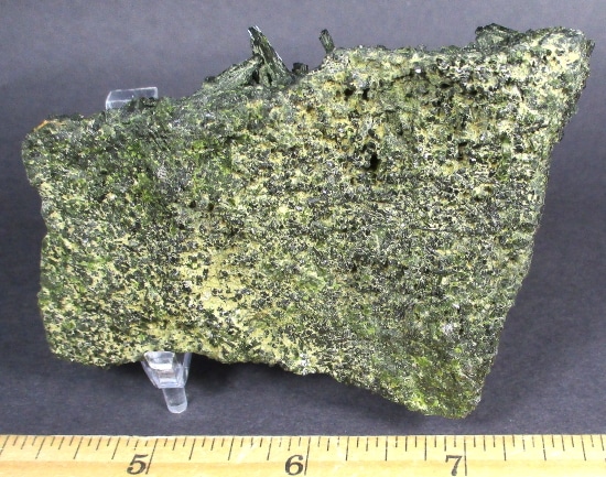 Epidote is an abundant rock-forming mineral, but one of the secondary origin. Many of the characters of the mineral vary with the amount of iron present. Prismatic, columnar crystals, often shiny, finely striated faces. The color is green, gray, brown or nearly black but usually a characteristic shade of yellowish-green or pistachio green.