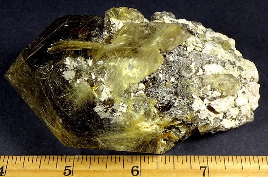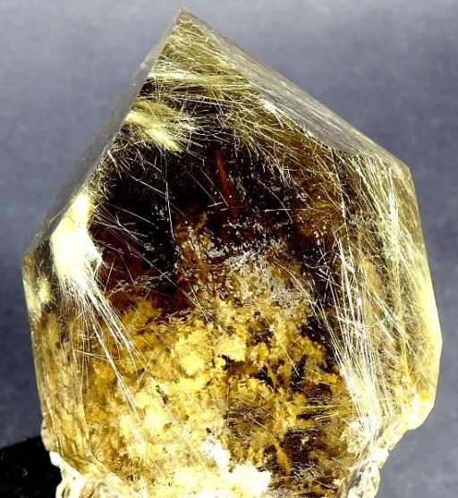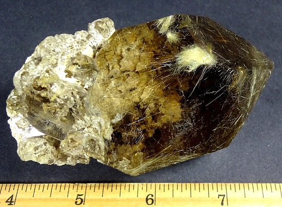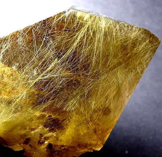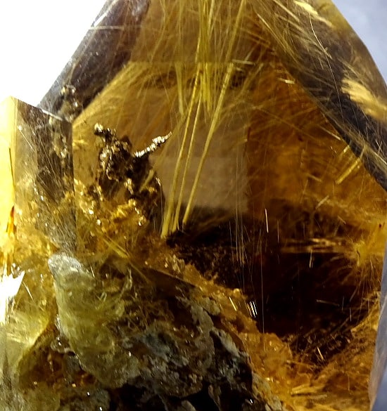 Rutile is a mineral composed primarily of Titanium Dioxide. Rutile has among the highest refractive indices of any known mineral and also exhibits high dispersion. Rutile is known to contain up to 10% Iron as well as significant amounts of Niobium and Tantalum. Rutile creates small needles within crystals that can be seen when held up to light.