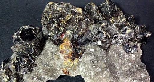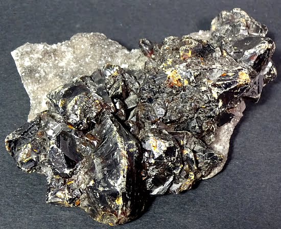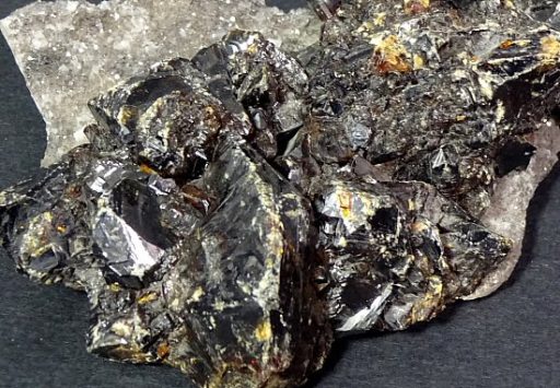 Sphalerite is a mineral that is the chief ore of Zinc. It consists mainly of Zinc Sulfide in crystalline form but almost always contains valuable Iron. When the Iron content is high, it is an opaque black variety called Marmatite. It is usually found in association with Galena, Pyrite, Calcite, Dolomite and Fluorite. It is usually yellow, brown or gray to gray-black in color and may have a shiny or dull luster or sheen.