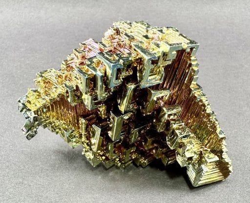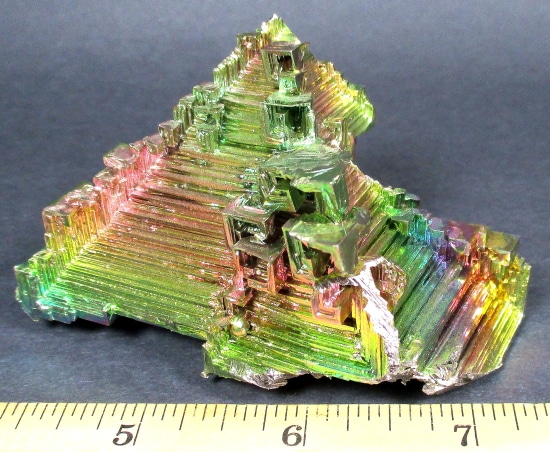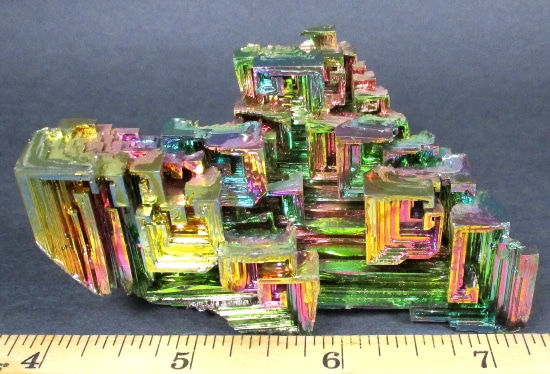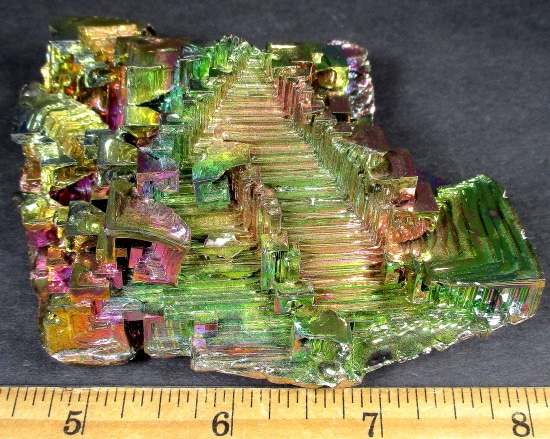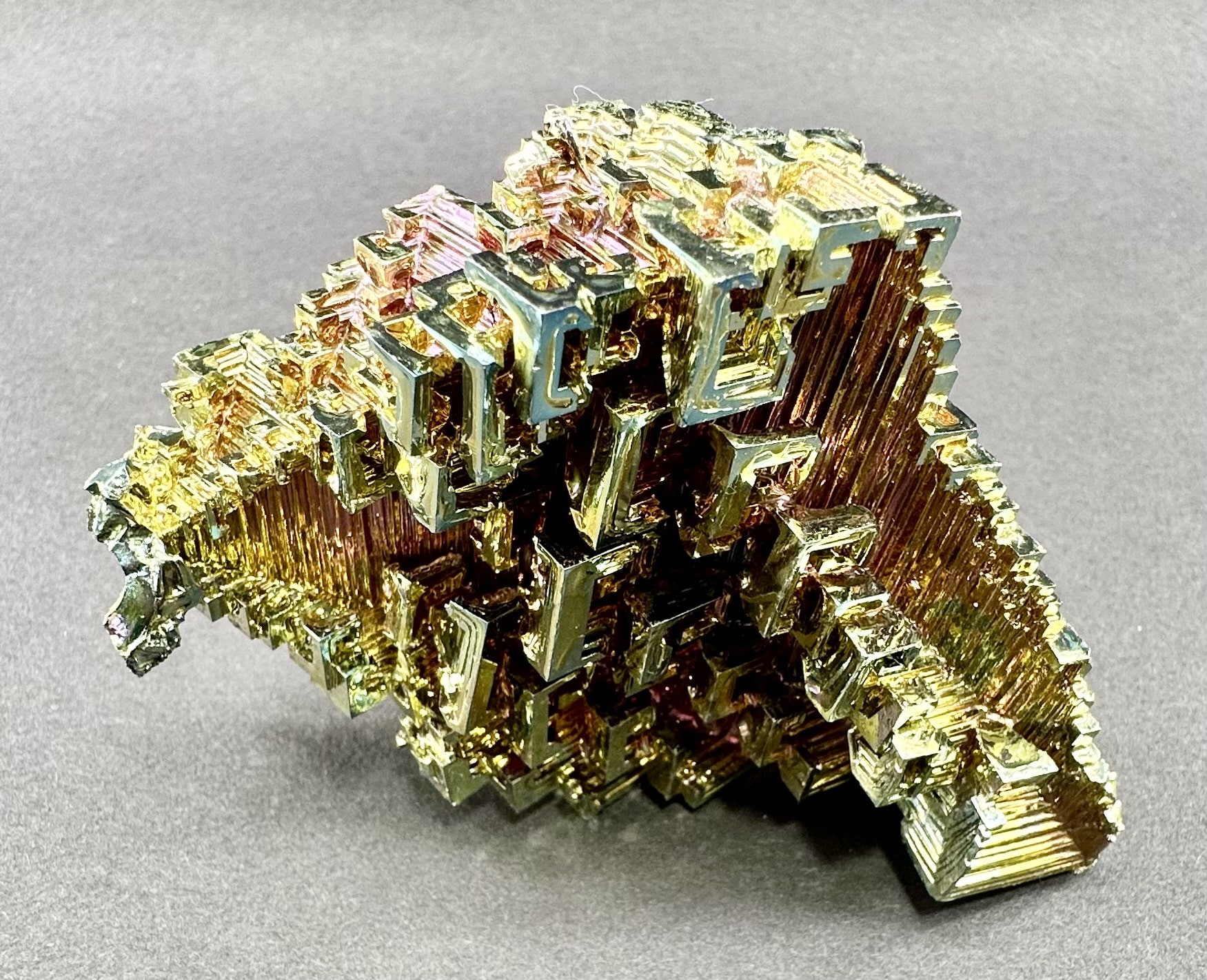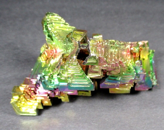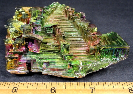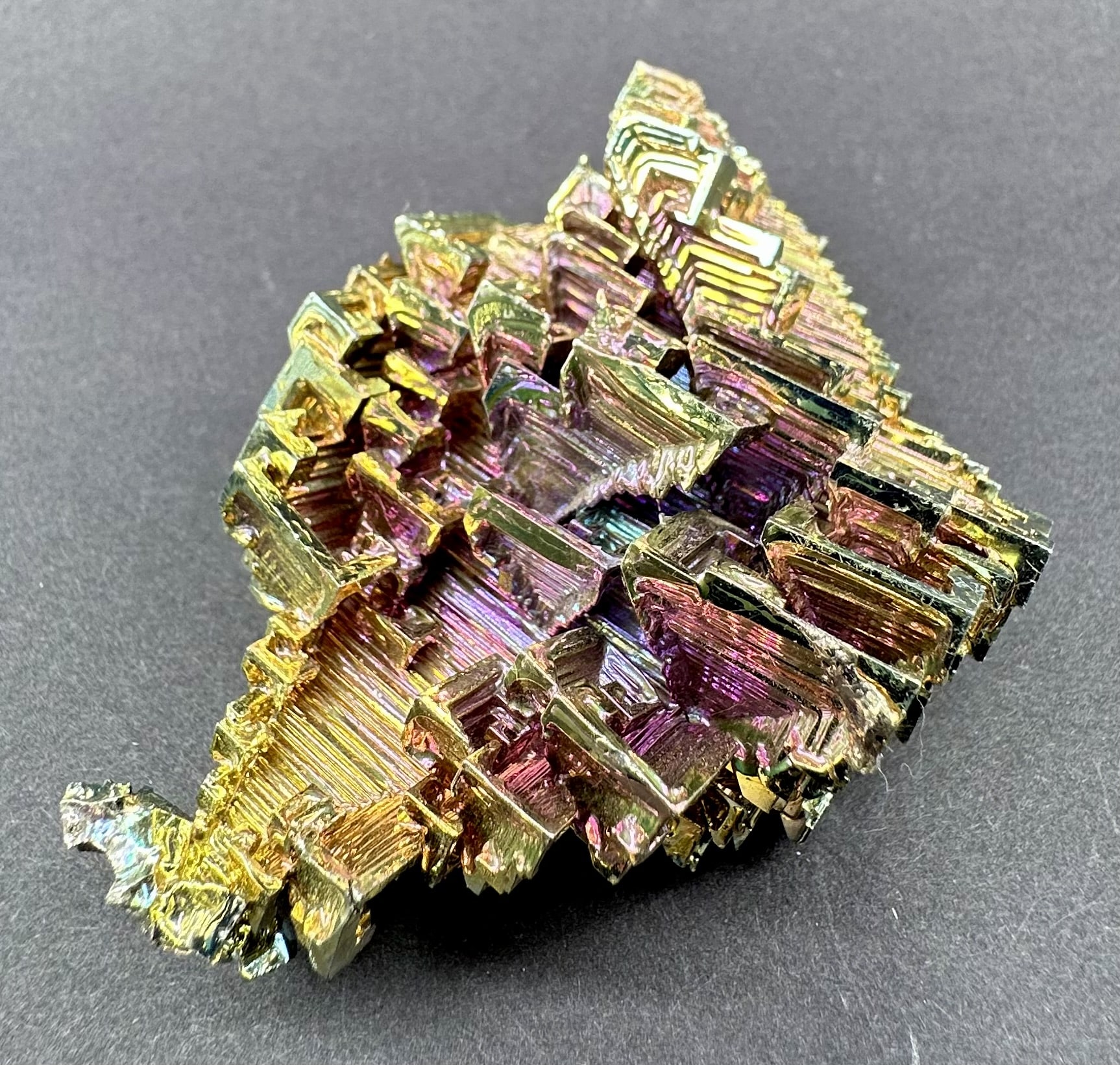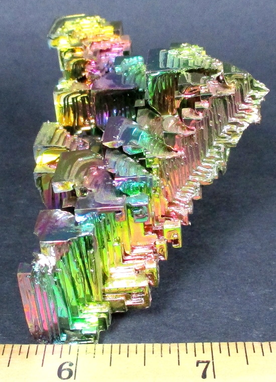 Bismuth is a native element, but native crystals are extremely rare. Peru is one of the world’s major sources. These crystals are grown in laboratories in the United States. Bismuth is scarce as Silver, heavier than Lead and is classified as a semi-precious semi-metal. It is non-toxic to humans. It is used in medicine and cosmetics, applications in inks, paints, free-machining steels and fire sprinklers.