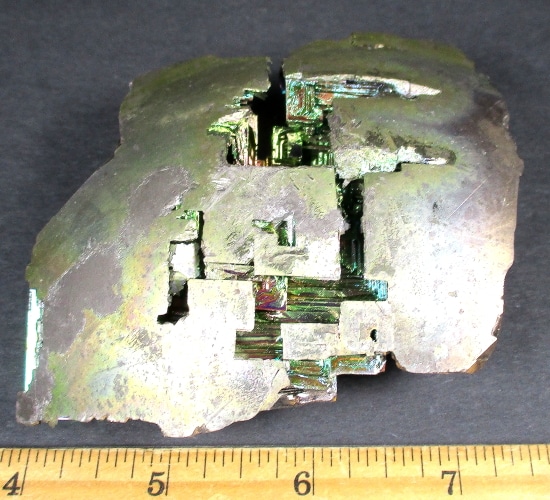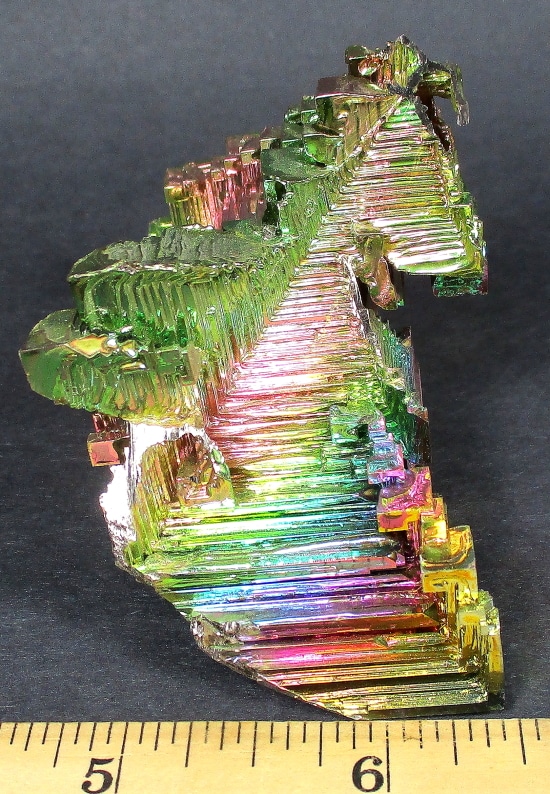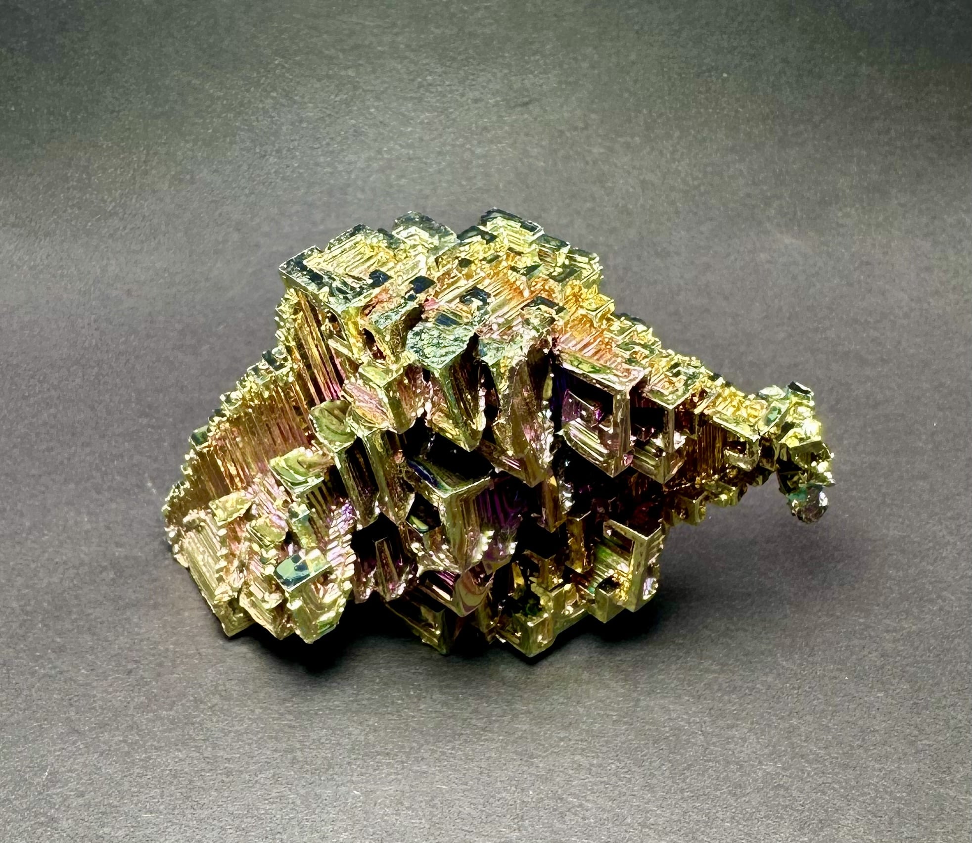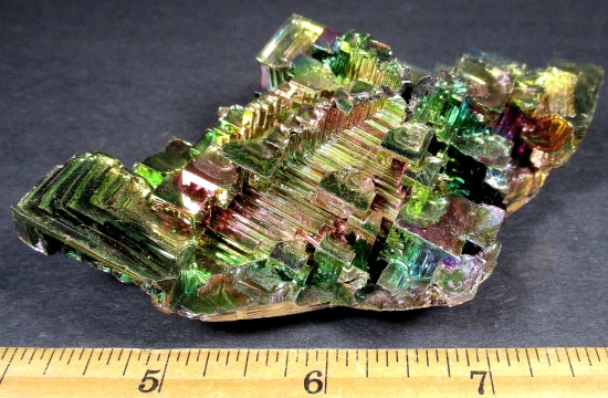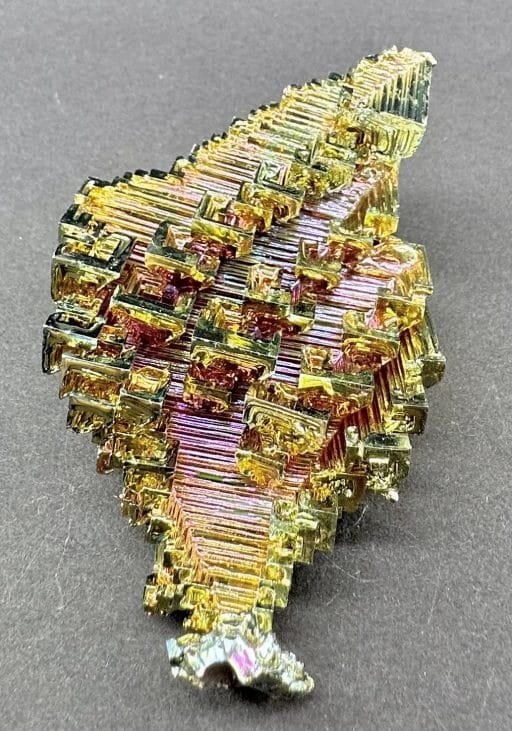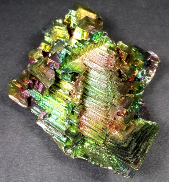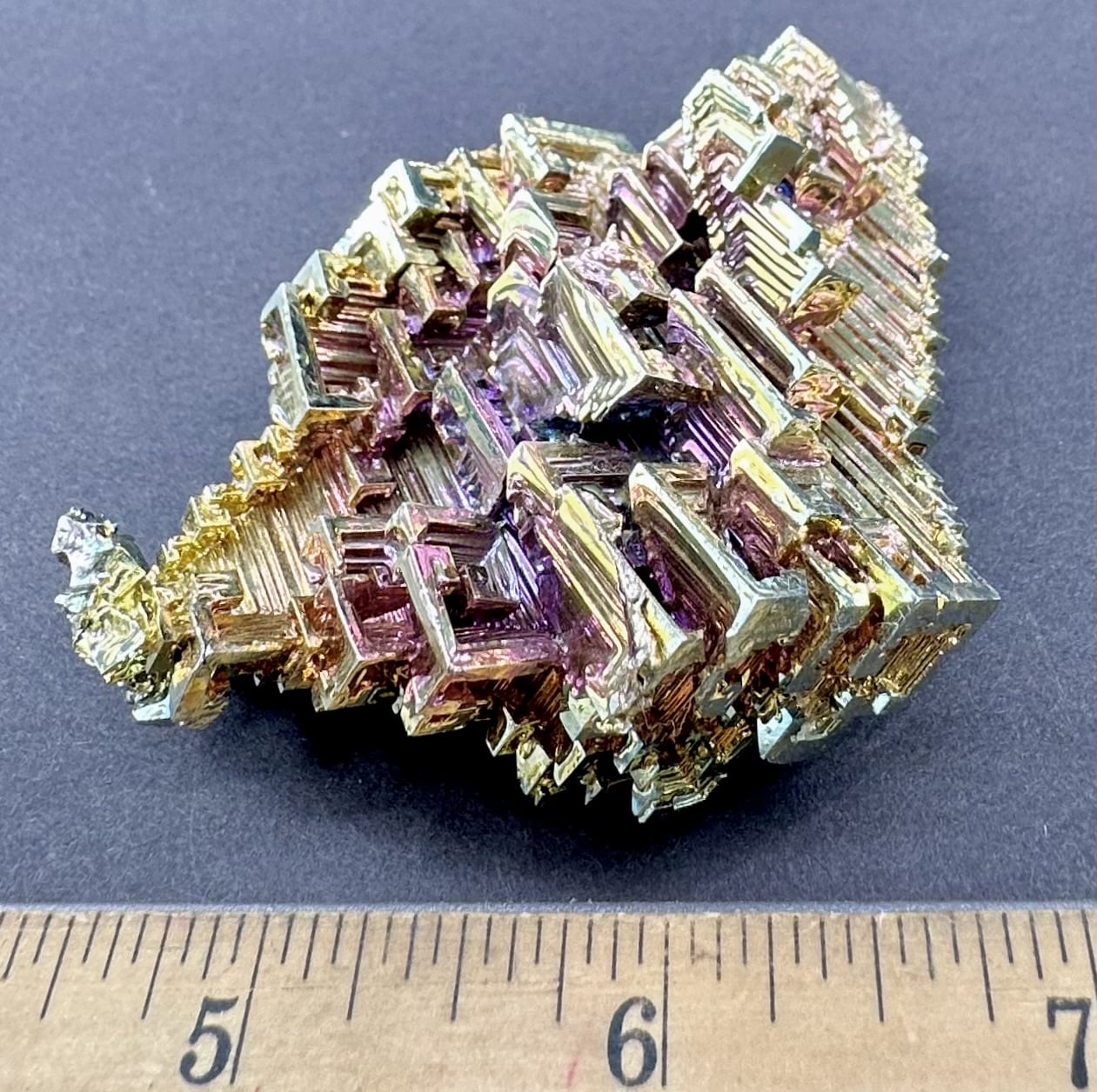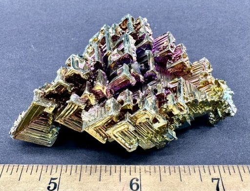 Bismuth is a native element, but native crystals are extremely rare. Peru is one of the world’s major sources. These crystals are grown in laboratories in the United States. Bismuth is scarce as Silver, heavier than Lead and is classified as a semi-precious semi-metal. It is non-toxic to humans. It is used in medicine and cosmetics, applications in inks, paints, free-machining steels and fire sprinklers.