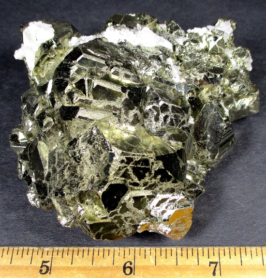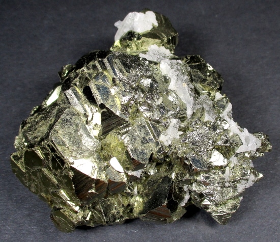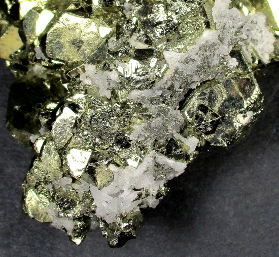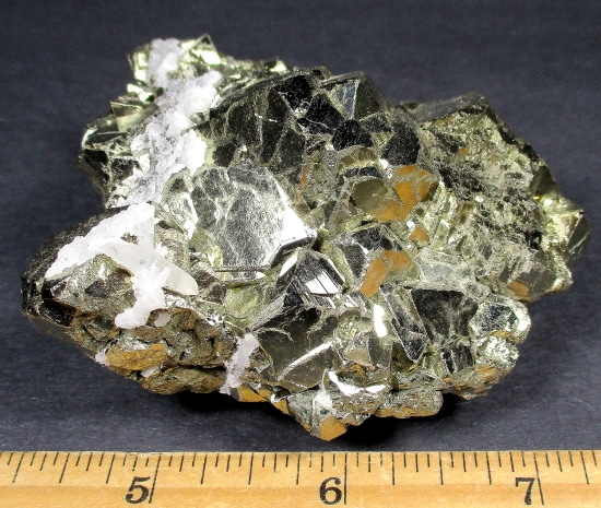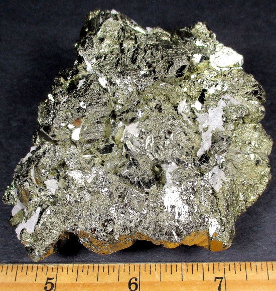 Pyrite, or Iron Pyrite, is an Iron sulfide with isometric Crystals that usually appear as cubes.  It is brittle and can break or powder easily.  Its metallic luster and brass yellow hue have earned it the nickname of “fool’s gold” due to many miners mistaken it for the real thing.  Ironically, small quantities of actual gold are sometimes found in Pyrite.  It is the most common of the sulfide minerals and is usually found with other sulfides or oxides in Quartz veins, sedimentary or metamorphic rocks.