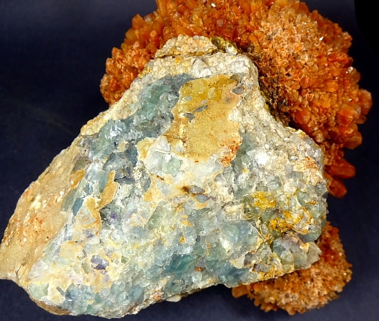 Fluorite, also referred to as fluor-spar, is a mineral composed of Calcium Fluoride. It is a widely occurring mineral found worldwide and is often found with metallic minerals such as Galena, Sphalerite, Barite, Quartz and Calcite. Fluorite may fluoresce strongly in ultraviolet light which may be due to the presence of some impurities such as Yttrium. Blue is the most common color but red, purple, green, yellow and white are also frequent. It can be used in high performance telescopes, camera lens, enamels and in the making of opalescent glass.