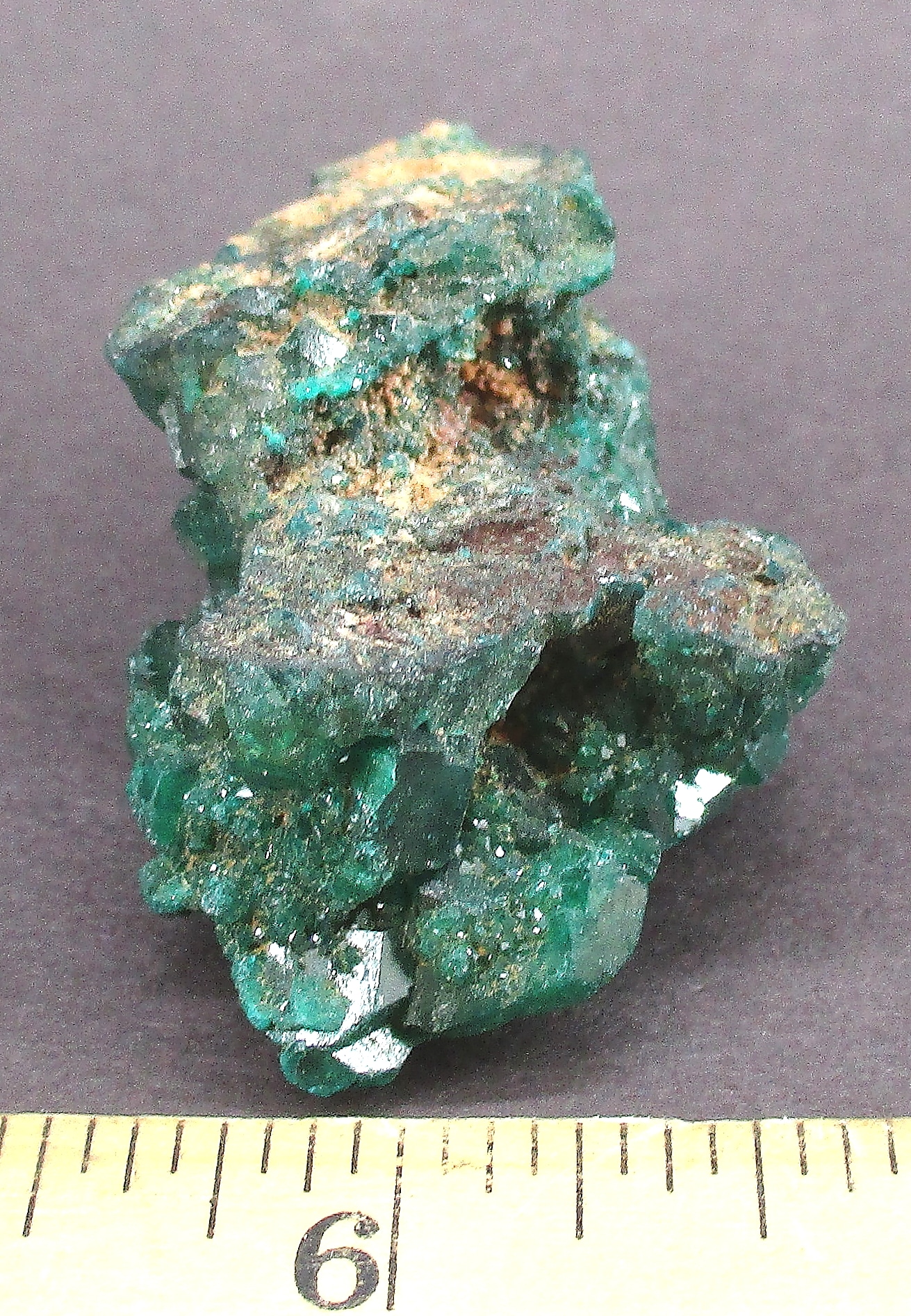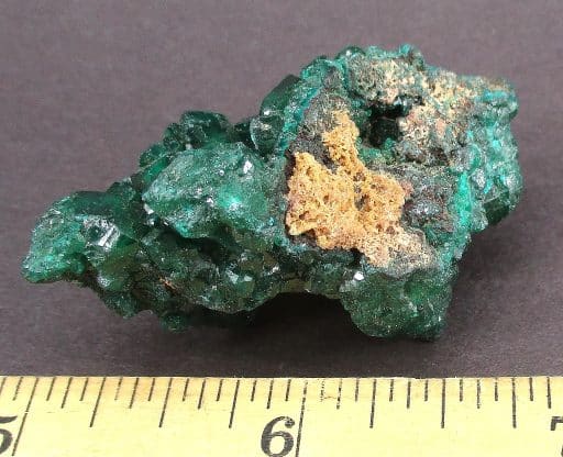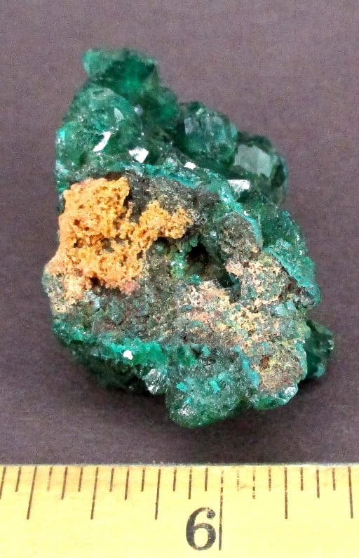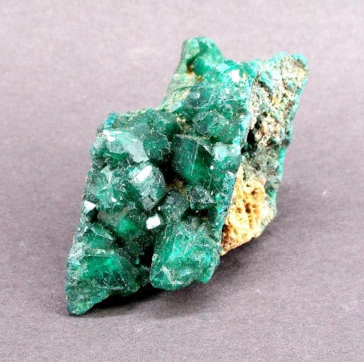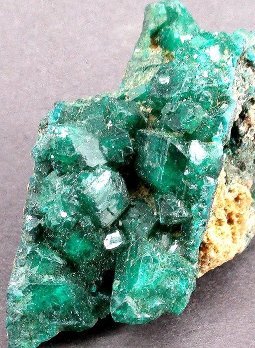 Dioptase is an intense emerald-green to bluish-green copper cyclosilicate mineral. It is transparent to translucent. Dioptase is an uncommon mineral found mostly in desert regions where it forms as a secondary mineral in the oxidized zone of copper sulfide mineral deposits. However, the process of its formation is not simple, the oxidation of copper sulfides should be insufficient to crystallize dioptase as silica is normally minutely soluble in water except at highly alkaline pH. The oxidation of sulfides will generate highly acidic fluids rich in sulfuric acid that should suppress silica solubility. However, in dry climates and with enough time, especially in areas of a mineral deposit where acids are buffered by carbonate, minute quantities of silica may react with dissolved copper forming dioptase and chrysocolla.