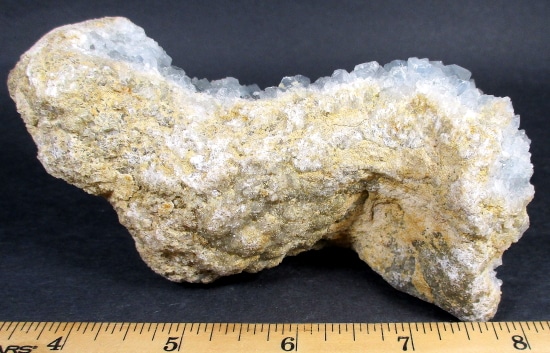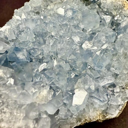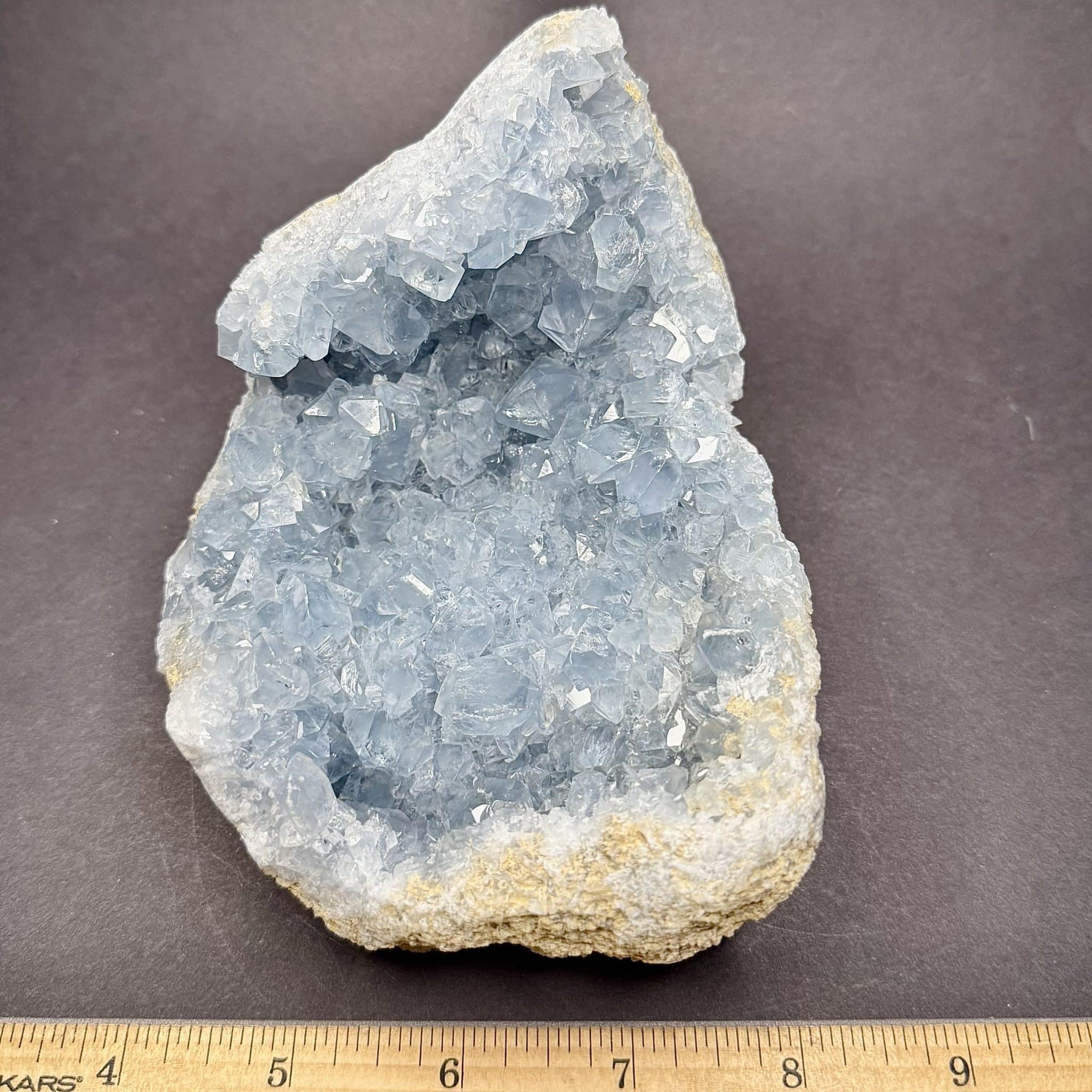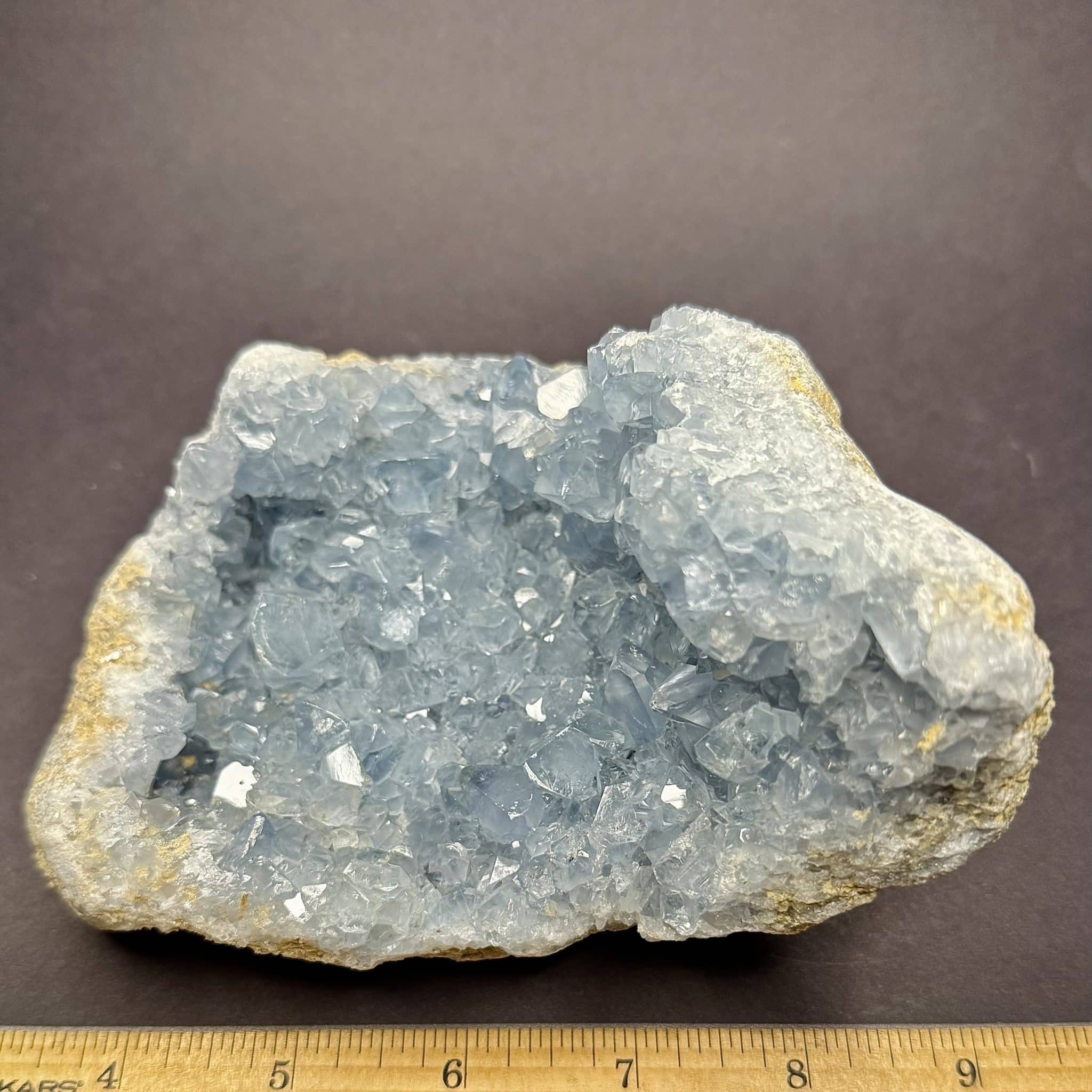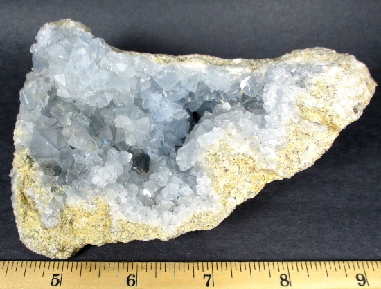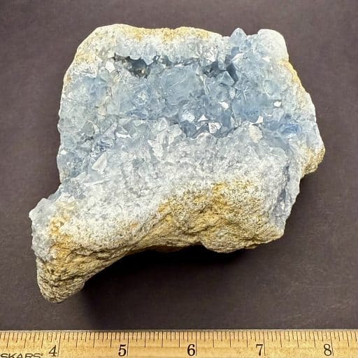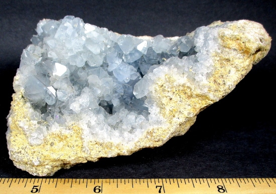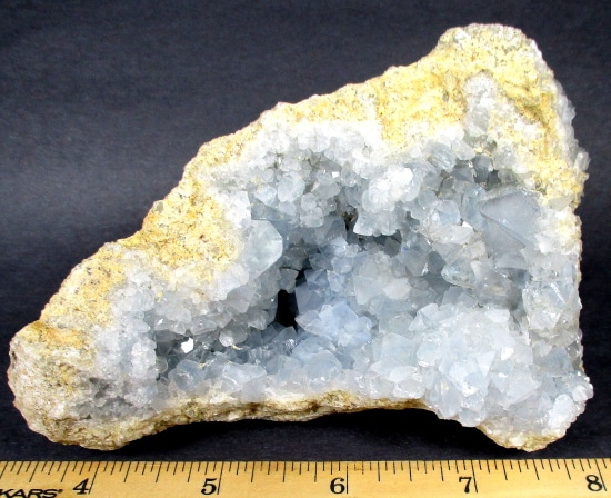 Celestite is a mineral form of Strontium Sulfate which is a metal. The metal is mixed with Carbon and Sulfur which is used for the red “fire” in fireworks, flares and road signals. Celestite occurs as Crystals and in compact massive and fibrous forms. It is mostly found in sedimentary rocks and is often associated with Gypsum, Anhydrite and Halite. Pale blue Crystal specimens are found in Madagascar.