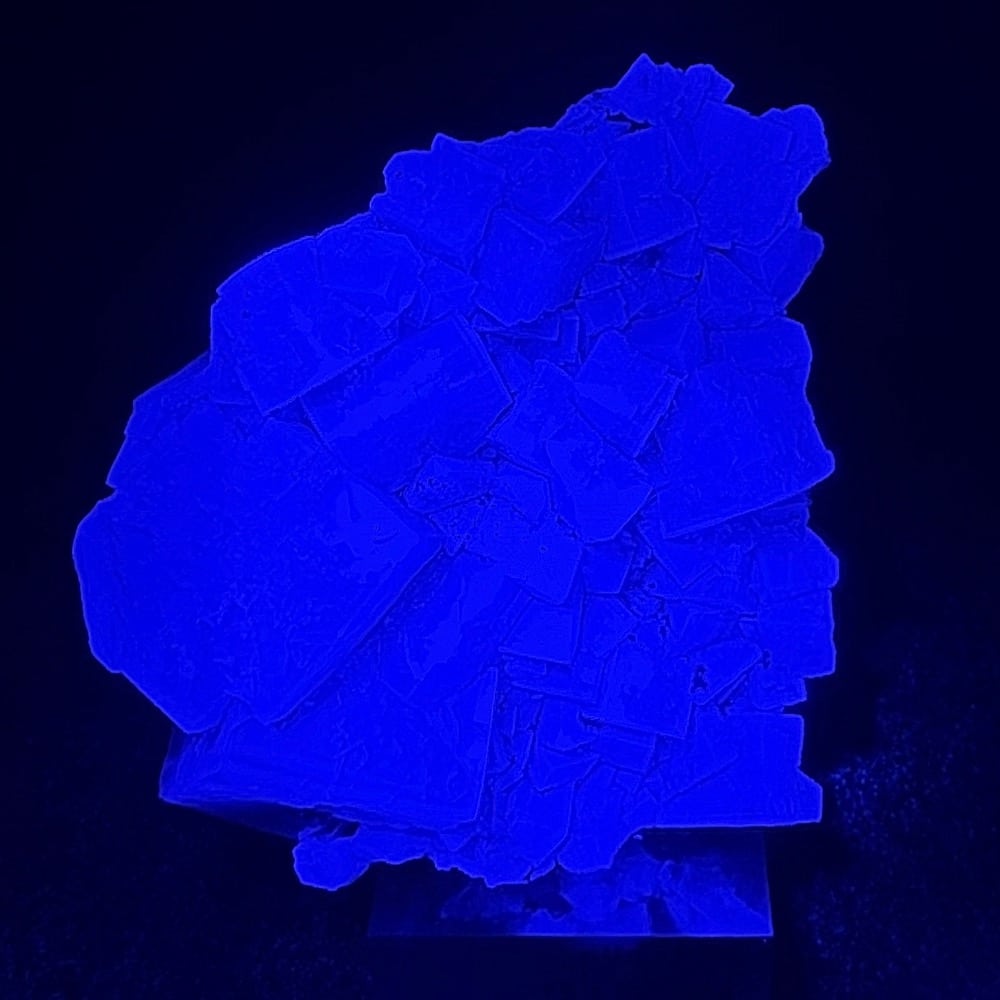Appearance: Gorgeous cube shaped crystal in a mesmerizing design. Comes on a plastic display stand. It also will fluoresce a bluish purple under a LW/UV light. UV fluorescent (shot with uvBeast 365nm(nanometer) Black Light UV flashlight).