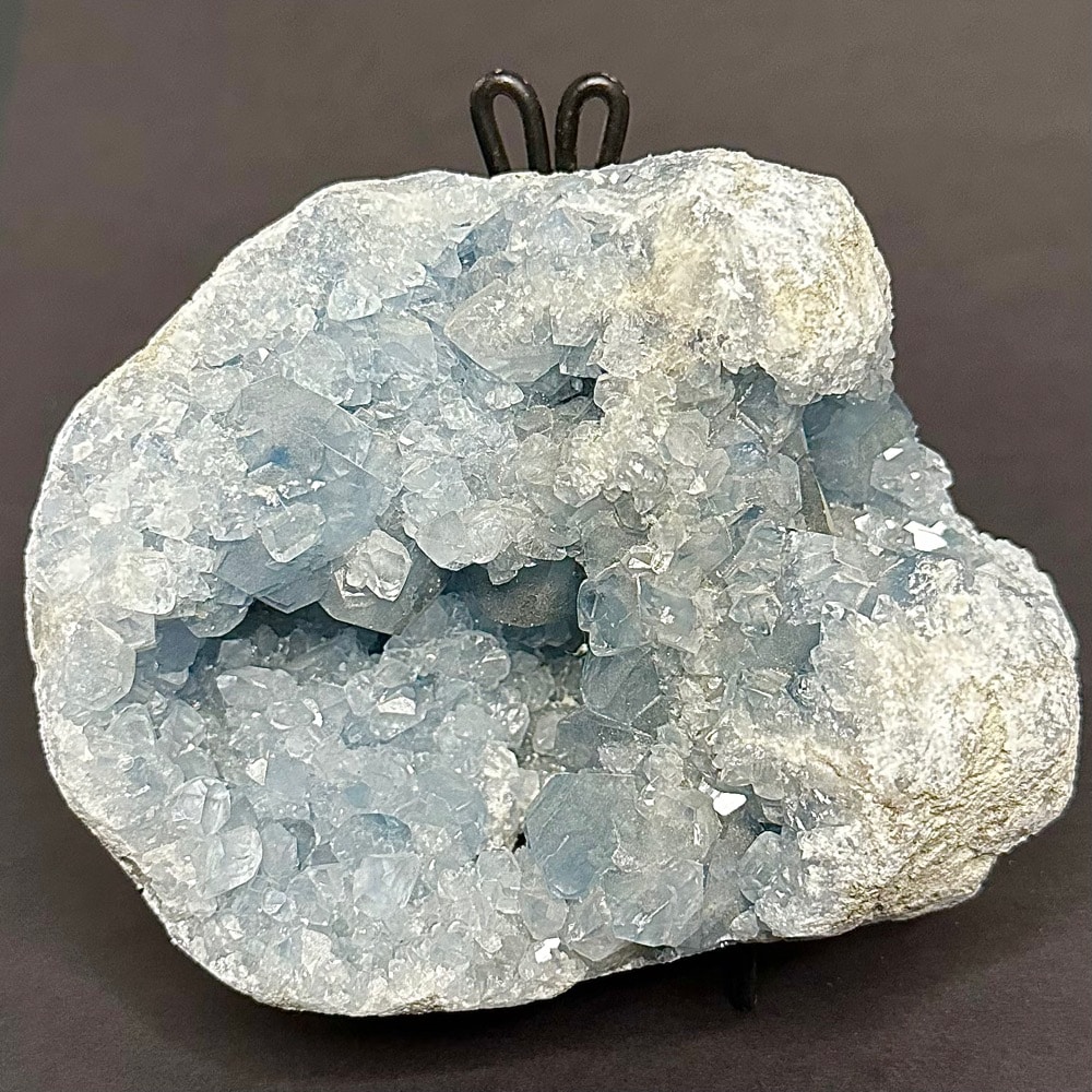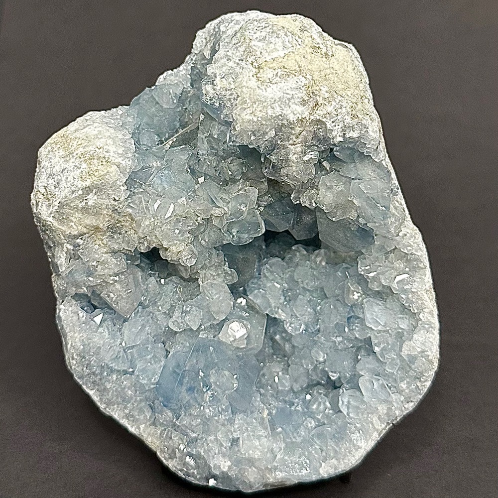 Appearance: Carved rough back and sides, with front facing crystal cluster center. Has many, many very nicely defined and sparkly icy blue crystals some of which has pretty “rainbow” reflections.