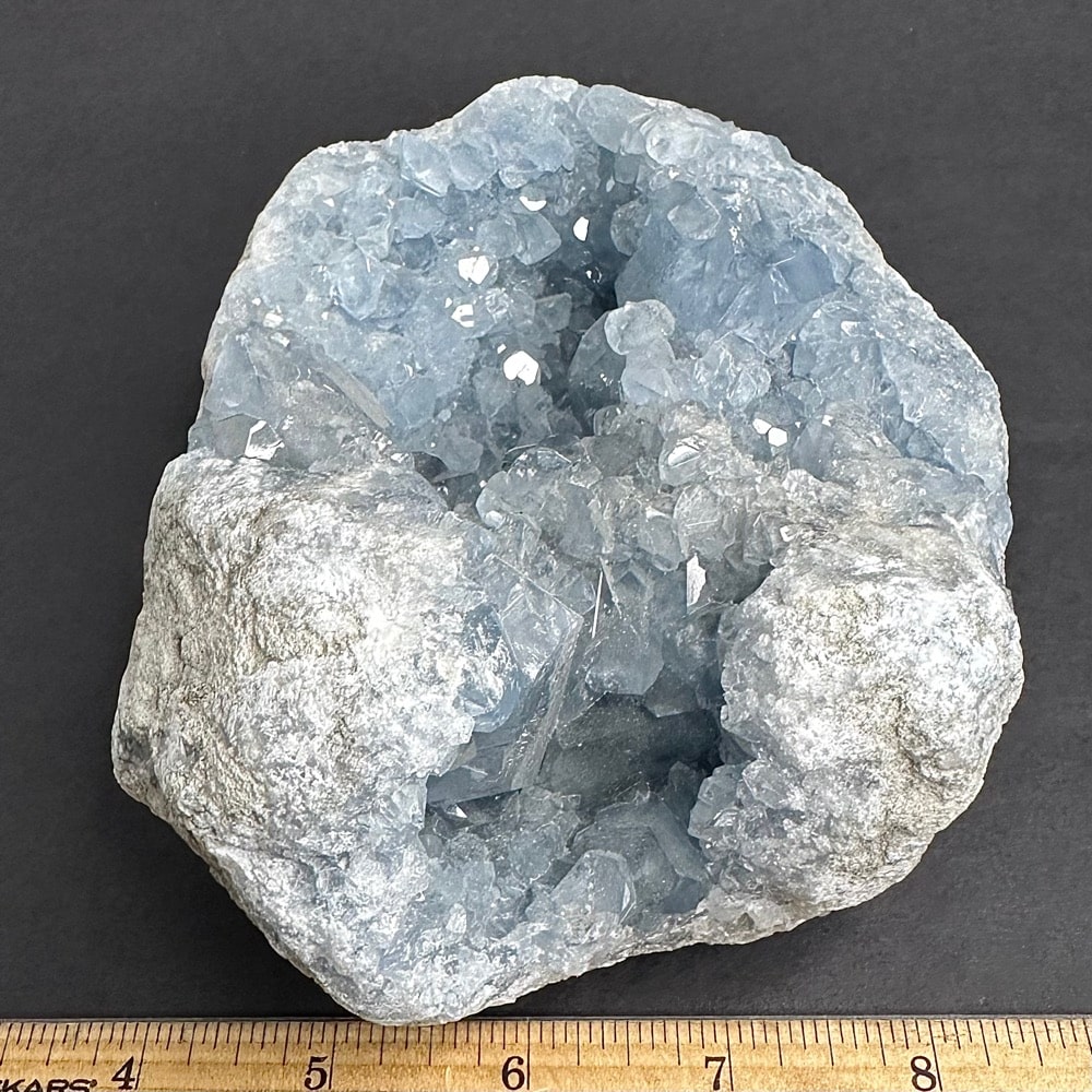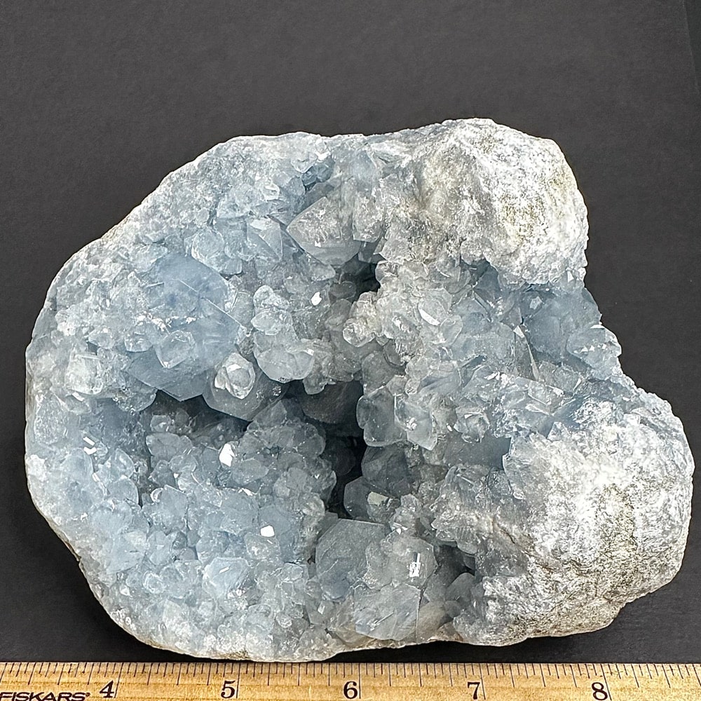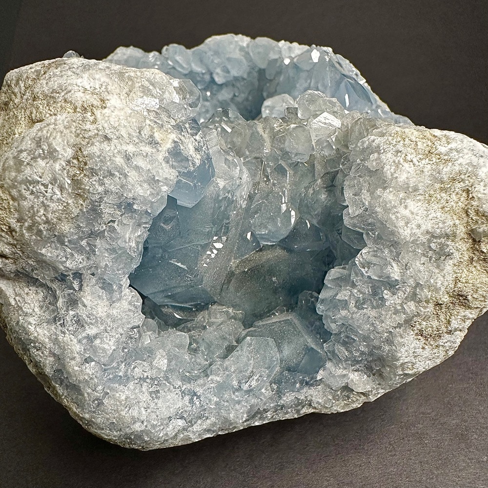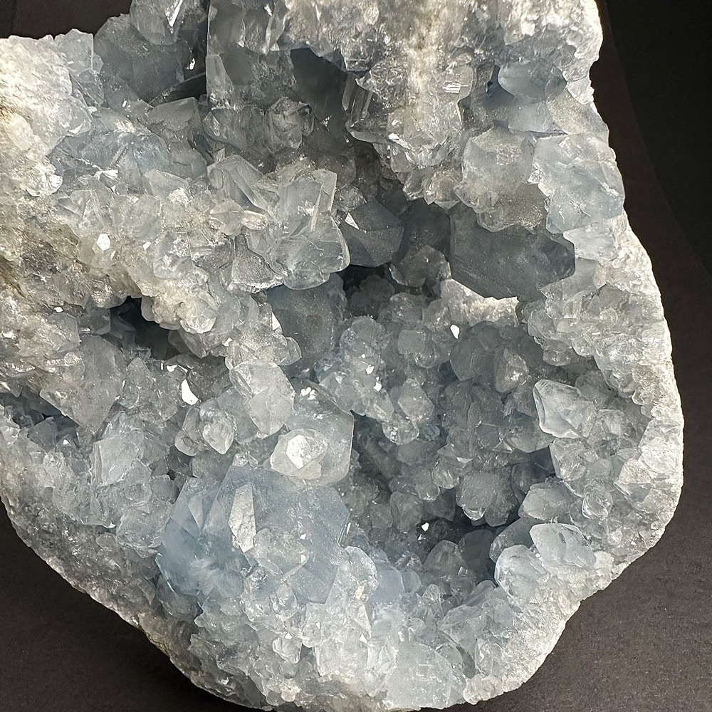 Celestite is a mineral form of Strontium Sulfate which is a metal. The metal is mixed with Carbon and Sulfur which is used for the red “fire” in fireworks, flares and road signals. Celestite occurs as Crystals and in compact massive and fibrous forms. It is mostly found in sedimentary rocks and is often associated with Gypsum, Anhydrite and Halite. Pale blue Crystal specimens are found in Madagascar.