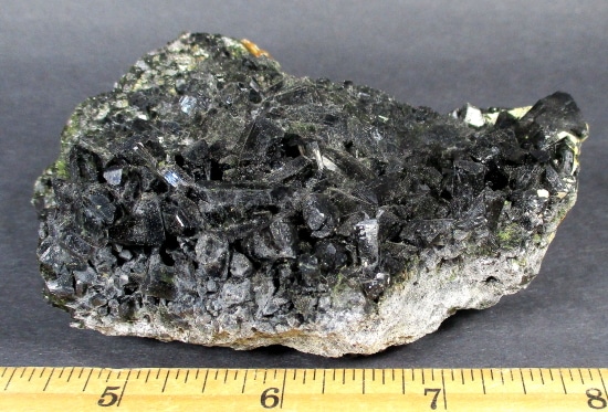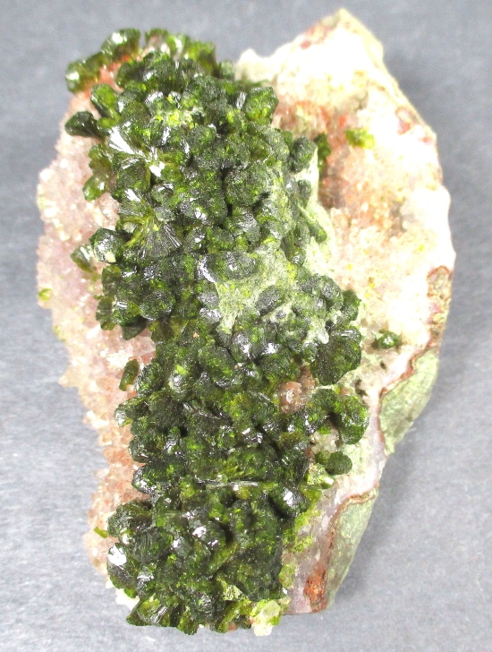 Epidote is an abundant rock-forming mineral, but one of the secondary origin. Many of the characters of the mineral vary with the amount of iron present. Prismatic, columnar crystals, often shiny, finely striated faces. The color is green, gray, brown or nearly black but usually a characteristic shade of yellowish-green or pistachio green.