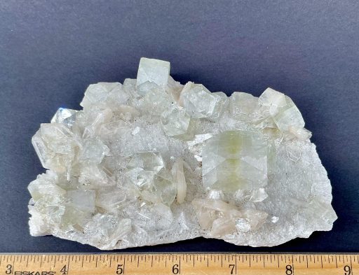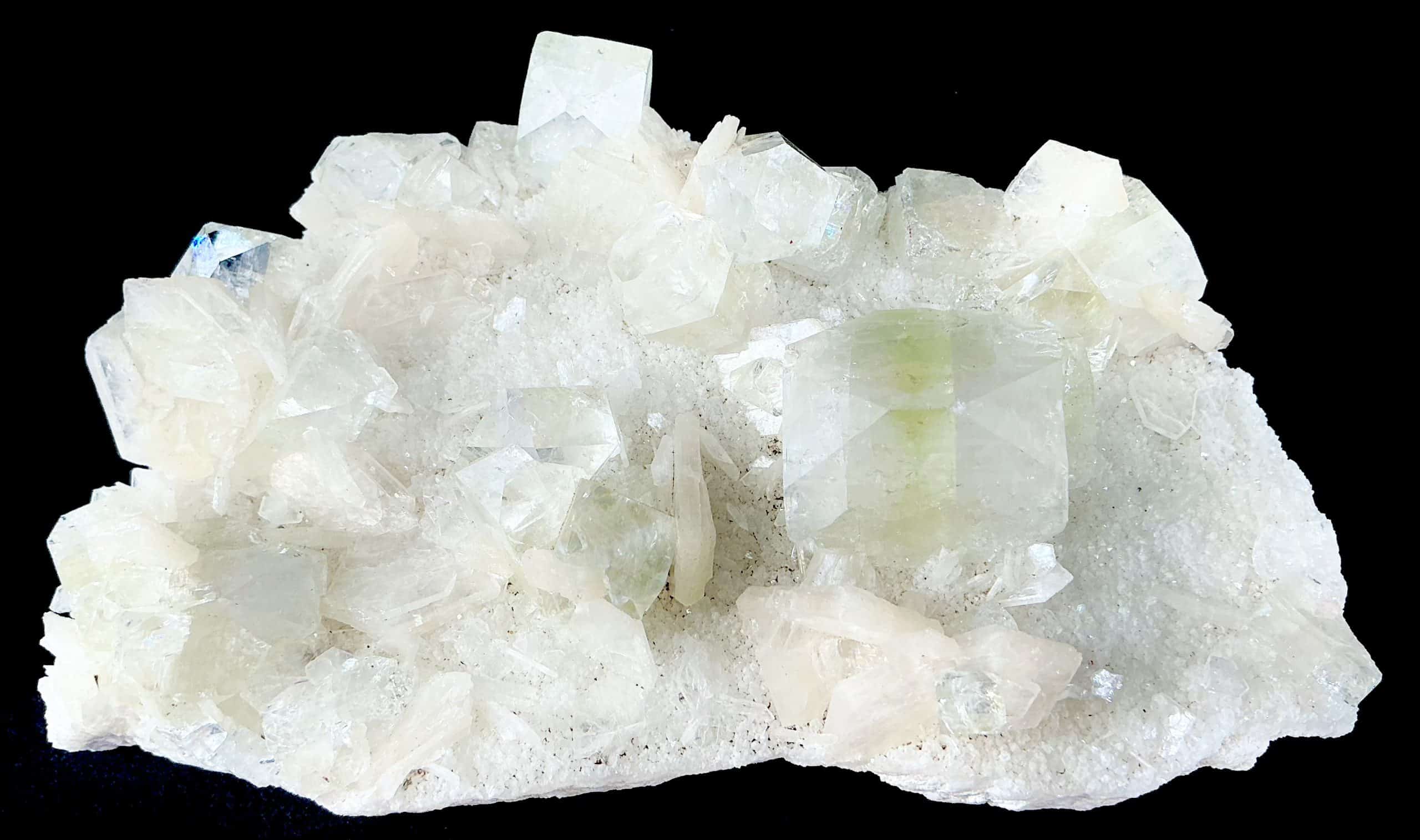 Appearance: Pale Stilbite spread out over a thin crust, with larger Apophyllite crystals in between.