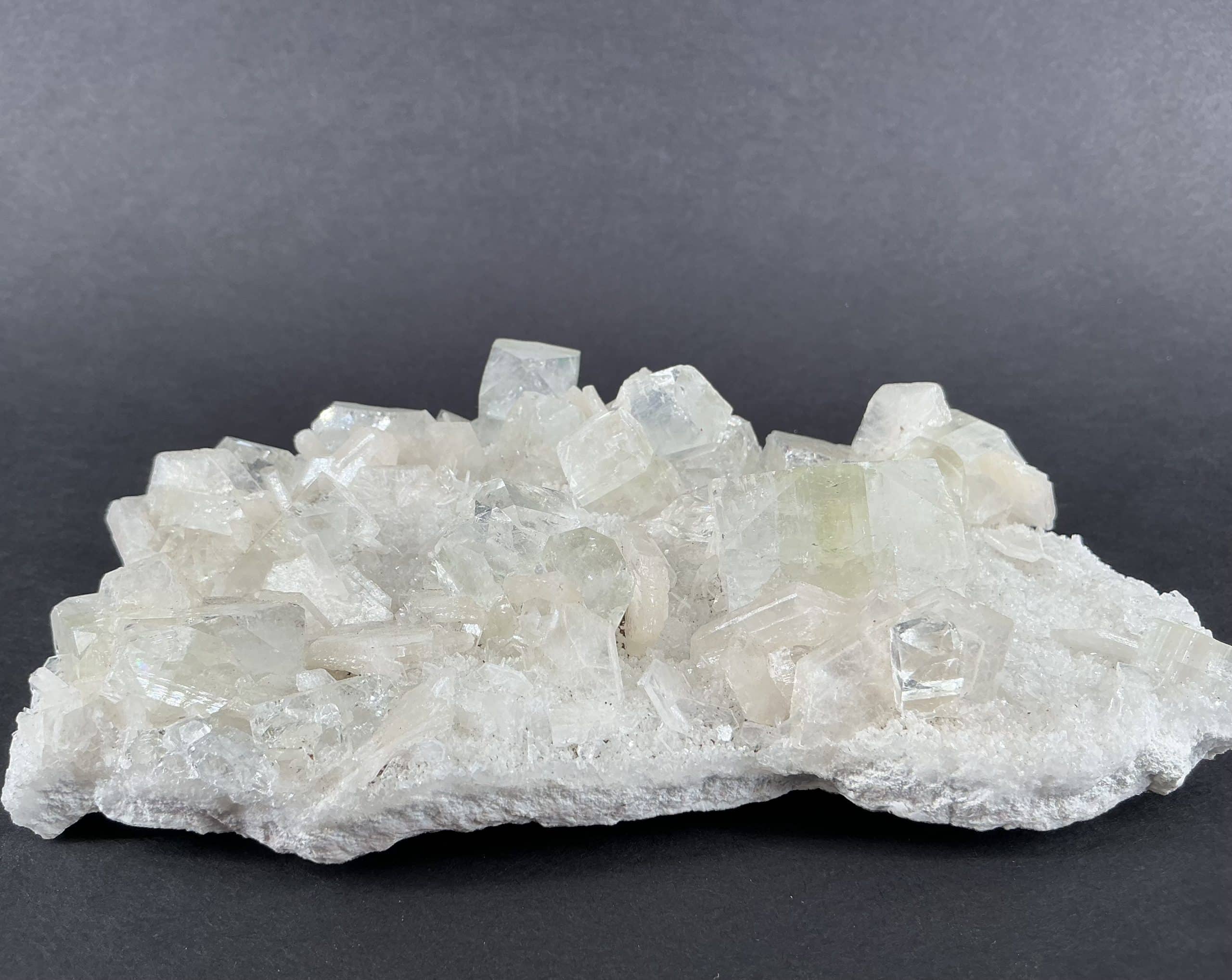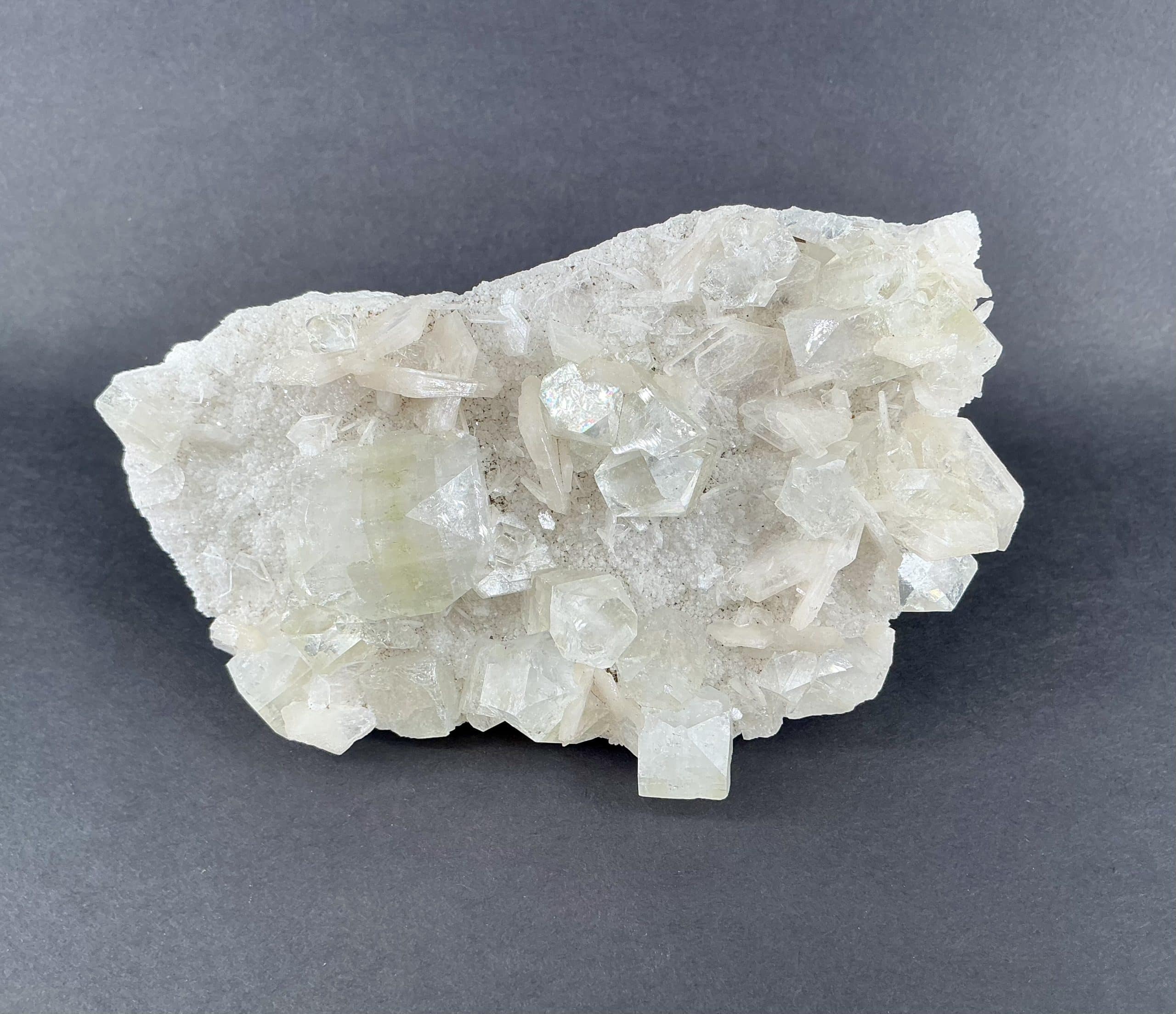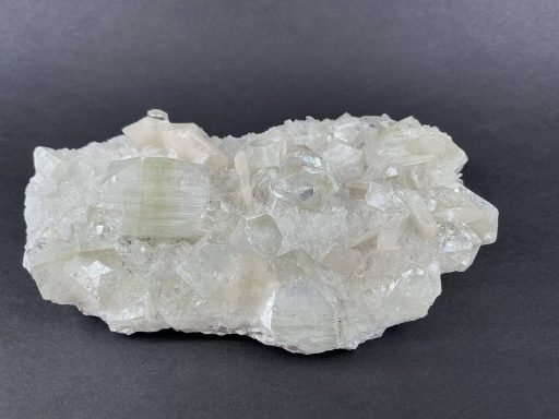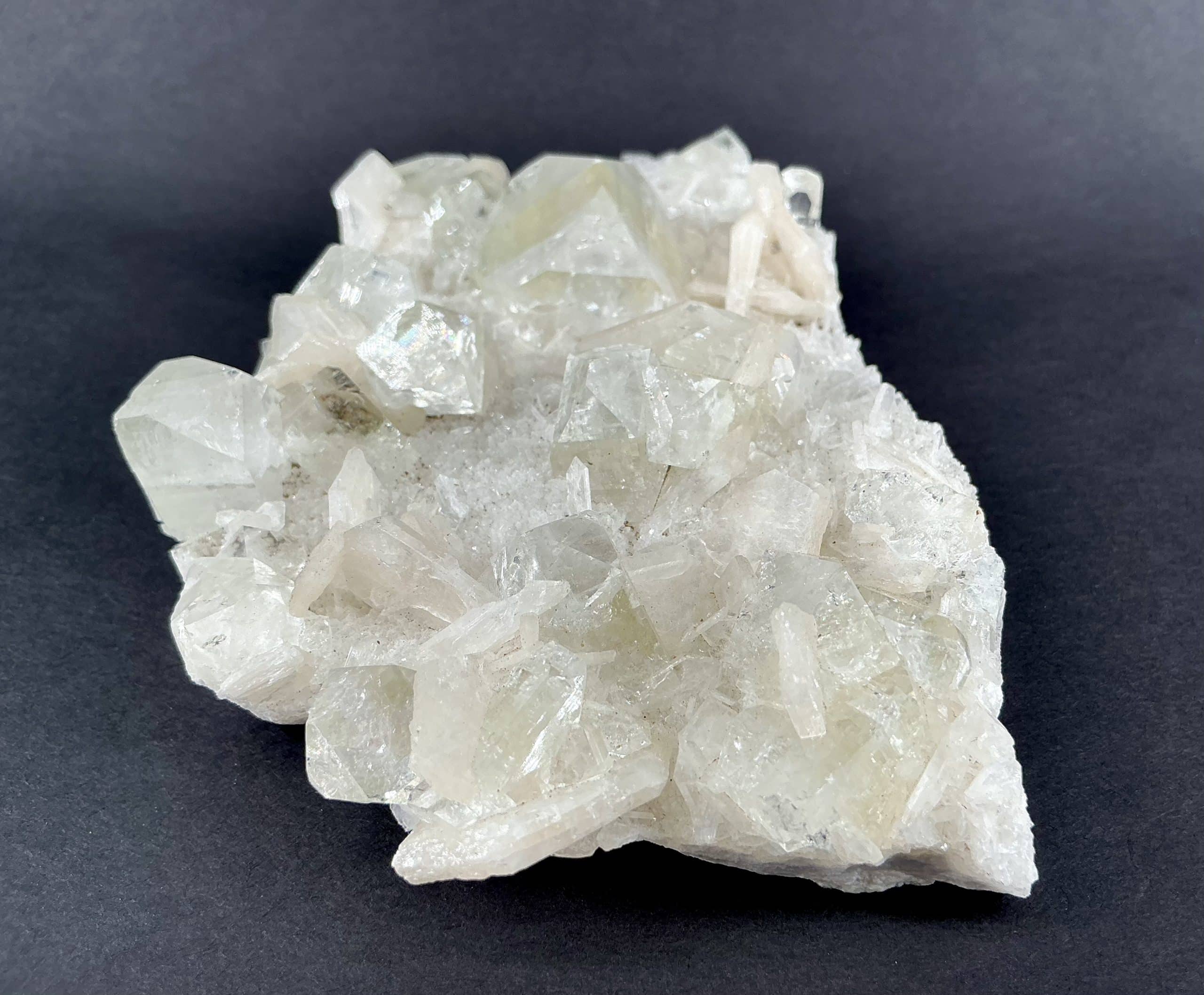Apophyllite, a Zeolite, is Silicate mineral with very well-defined clear Crystals and is very popular as a collector’s mineral.  The Crystal structure will refract like in obvious rainbows and can form “natural pyramids” when tumbled.