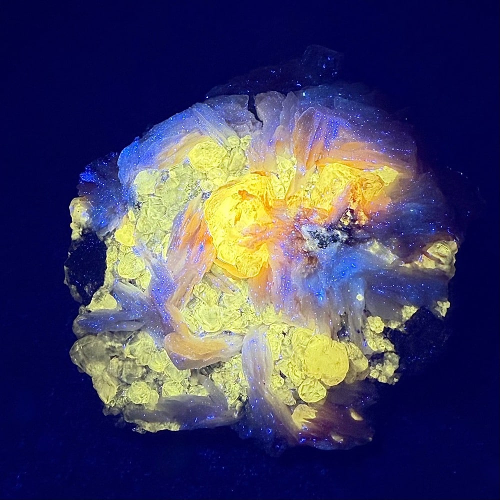 Appearance: Has a natural shiny appearance on all sides.  This unique and gorgeous specimen has a great variety of the three different minerals in a spectacular design. UV Fluorescent.