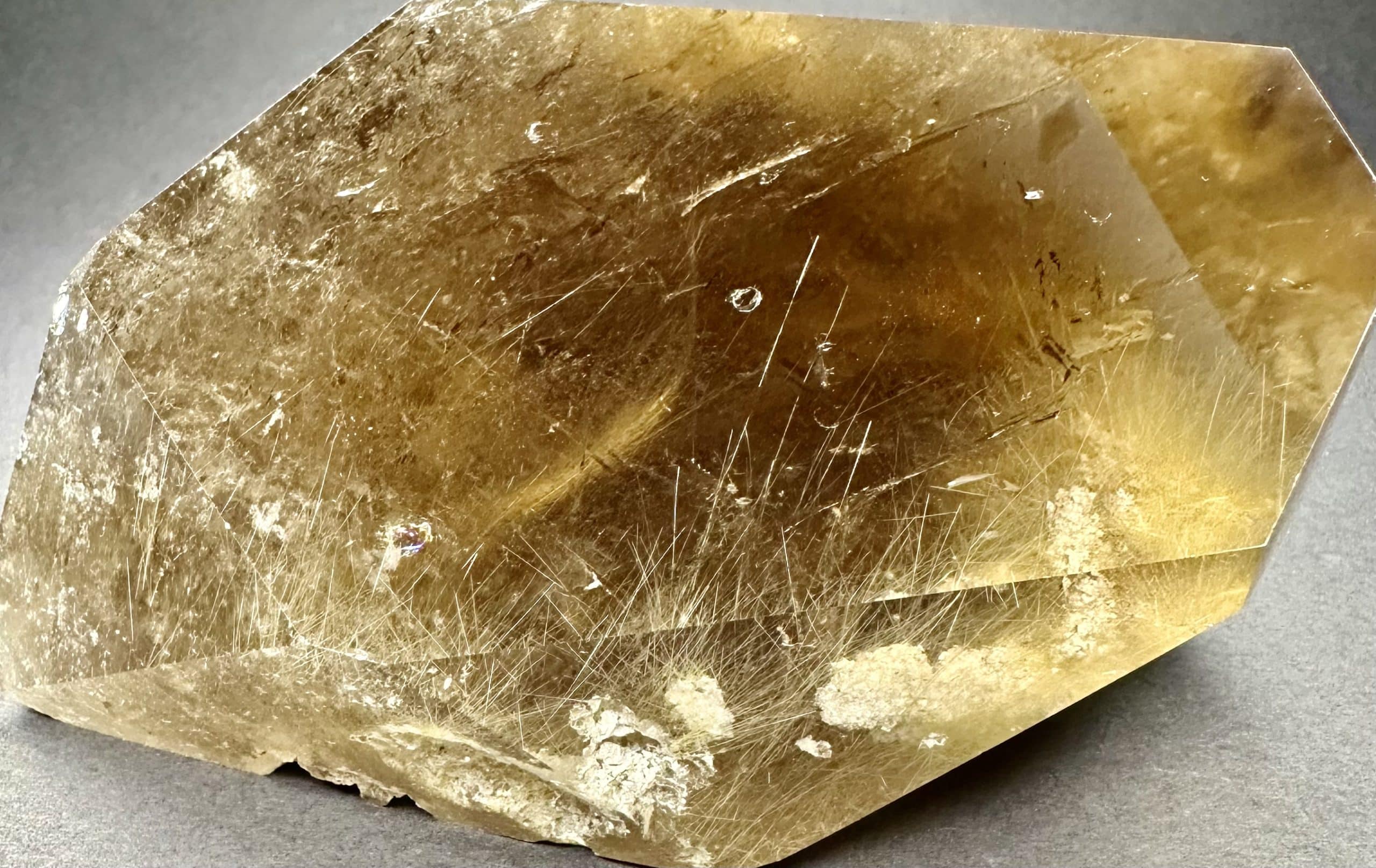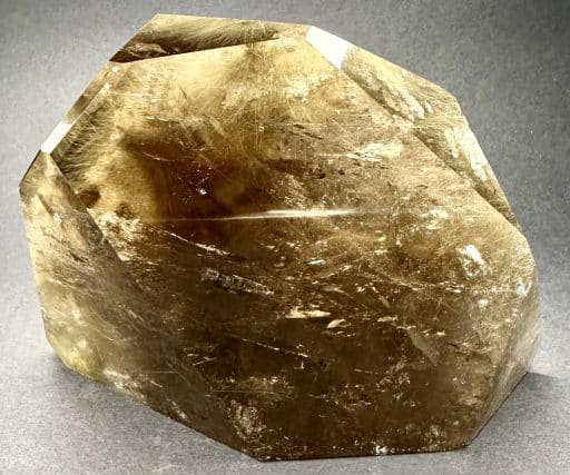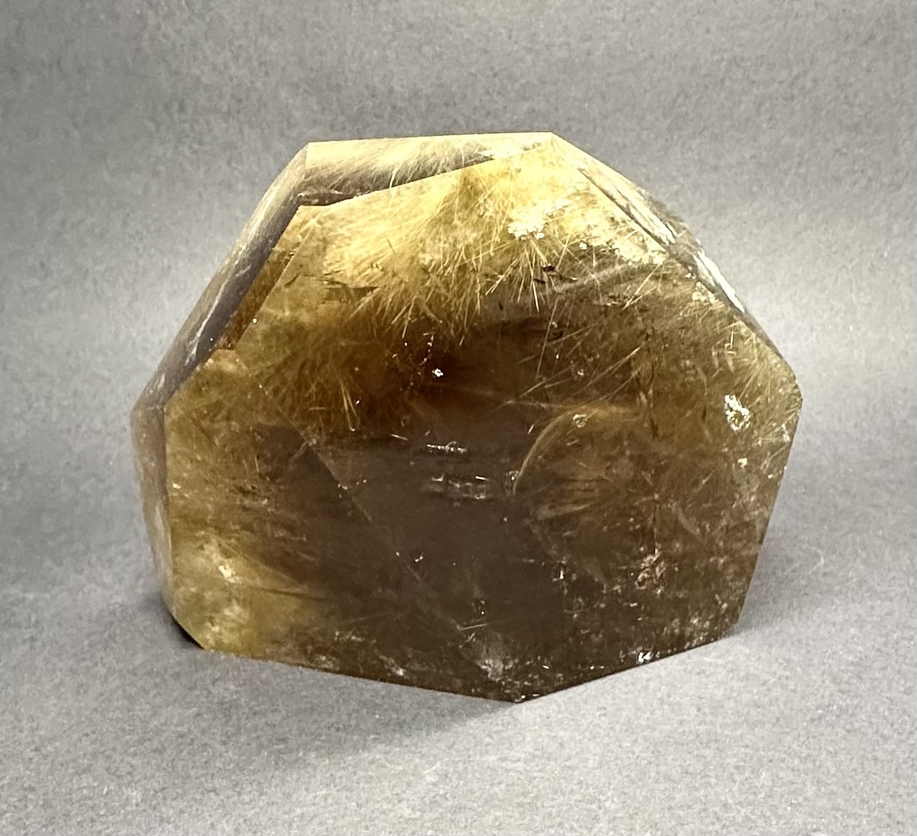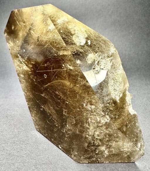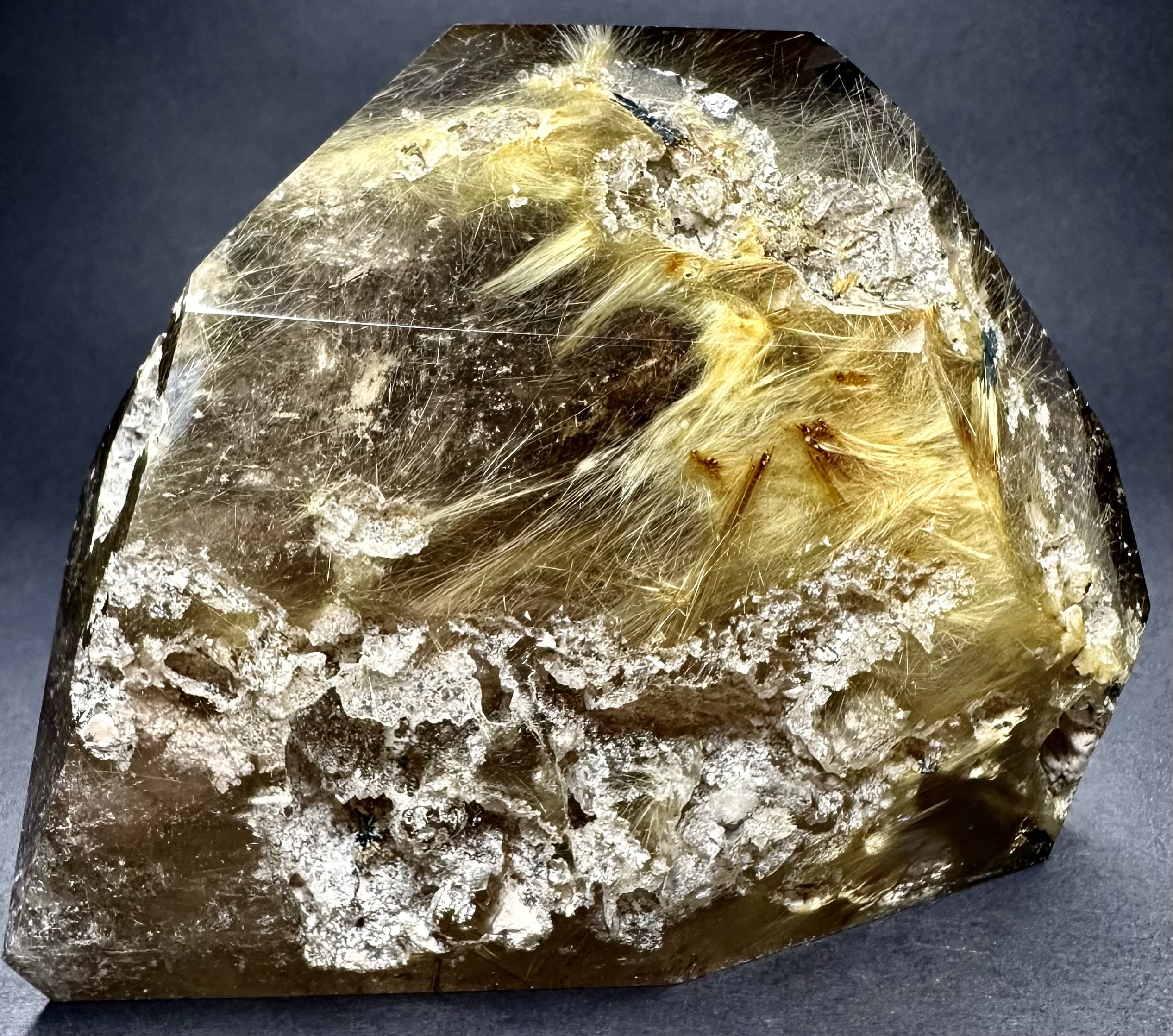 Appearance: Single high polished crystal with exceptional clarity, inclusions, subtle “rainbow” reflections and loaded with golden Rutiles.