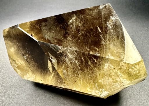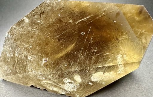 Rutile is a mineral composed primarily of Titanium Dioxide. Rutile has among the highest refractive indices of any known mineral and also exhibits high dispersion. Rutile is known to contain up to 10% Iron as well as significant amounts of Niobium and Tantalum. Rutile creates small needles within crystals that can be seen when held up to light.