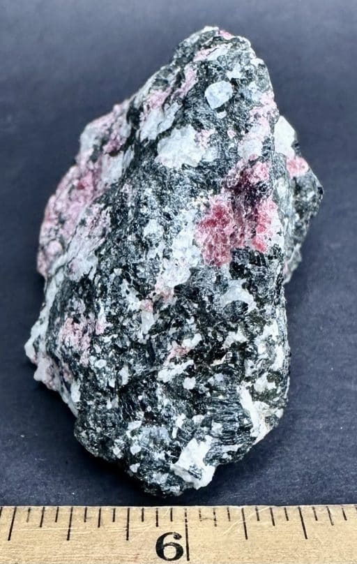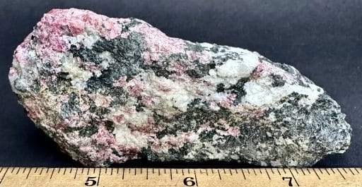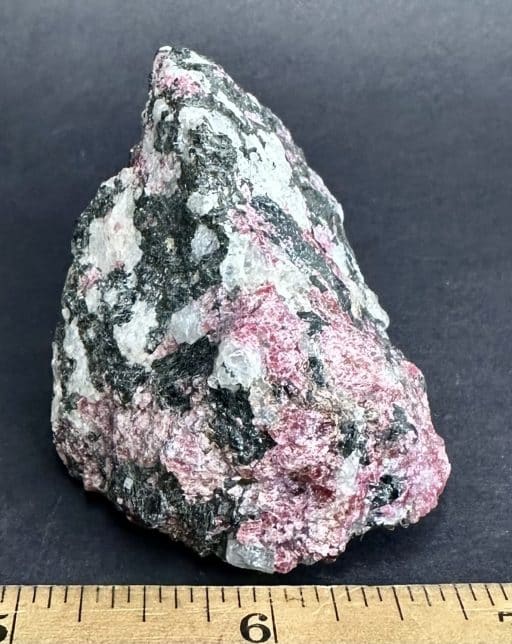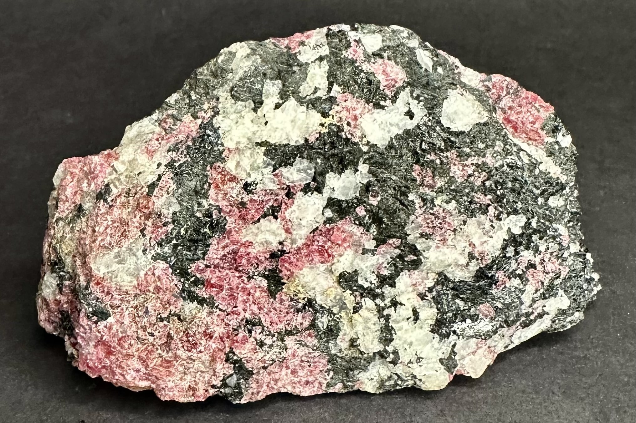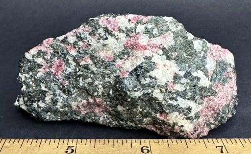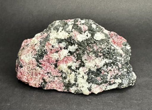 Eudialyte, also spelled Eudialite, is a complex material consisting chiefly of the silicates of iron, zirconium, and lime. Some samples of Eudialyte have been found to have up to 46 different elements. The zirconium has many uses from the production of synthetic fibers, in construction materials for aircraft and space vehicles and in the manufacture of super-hard alloys. Eudialyte is found in Arkansas, Greenland, Russia, Norway, Canada and Madagascar.