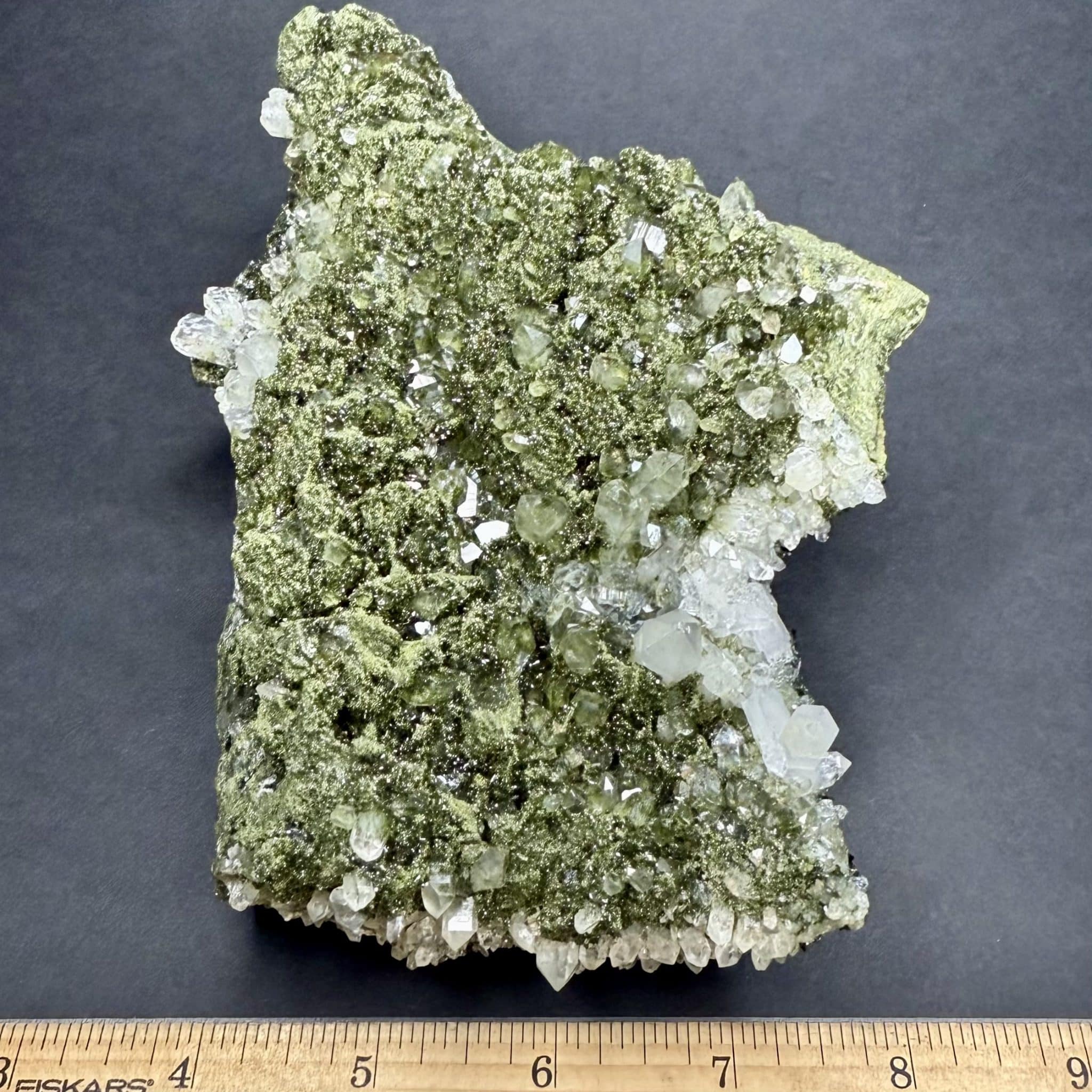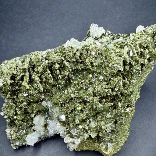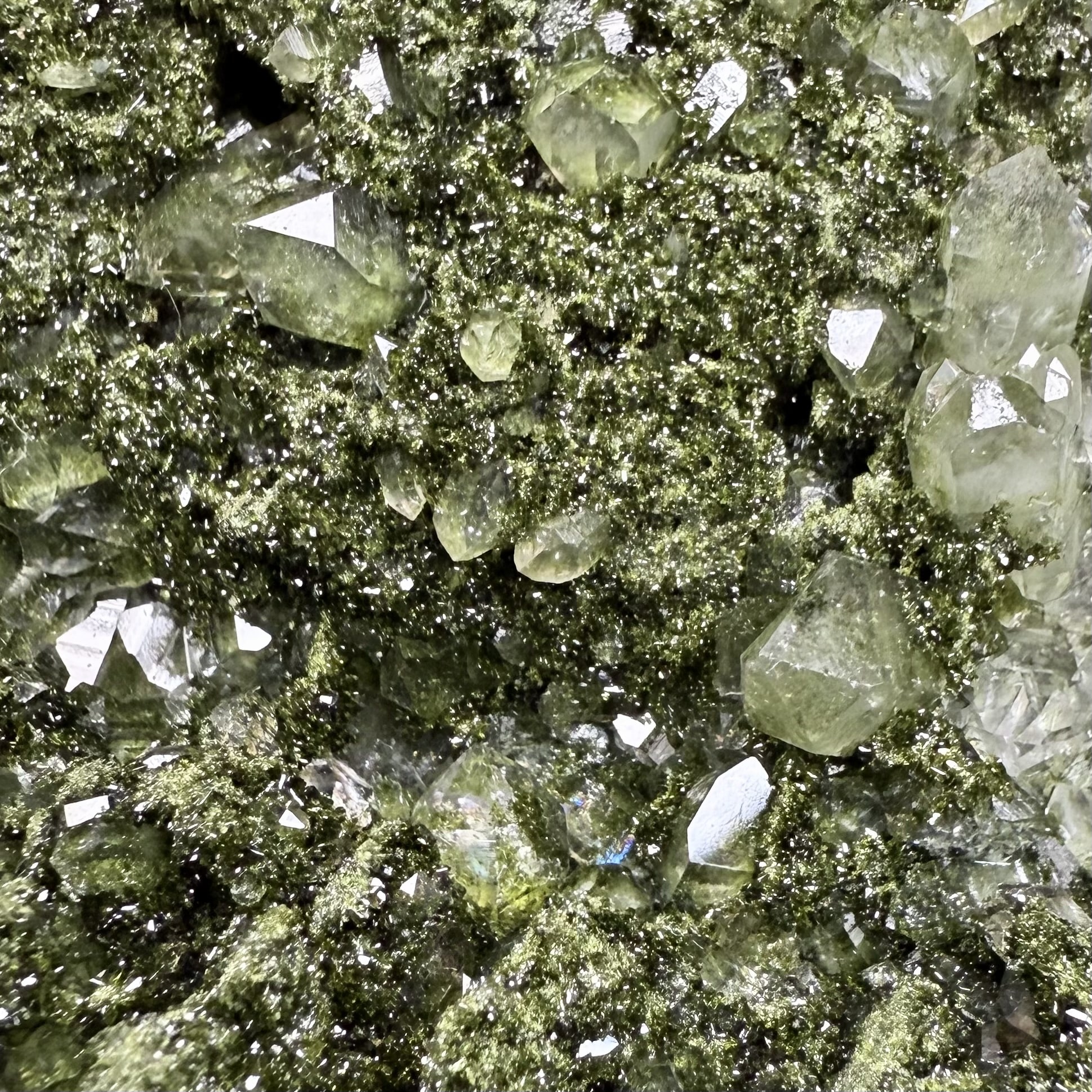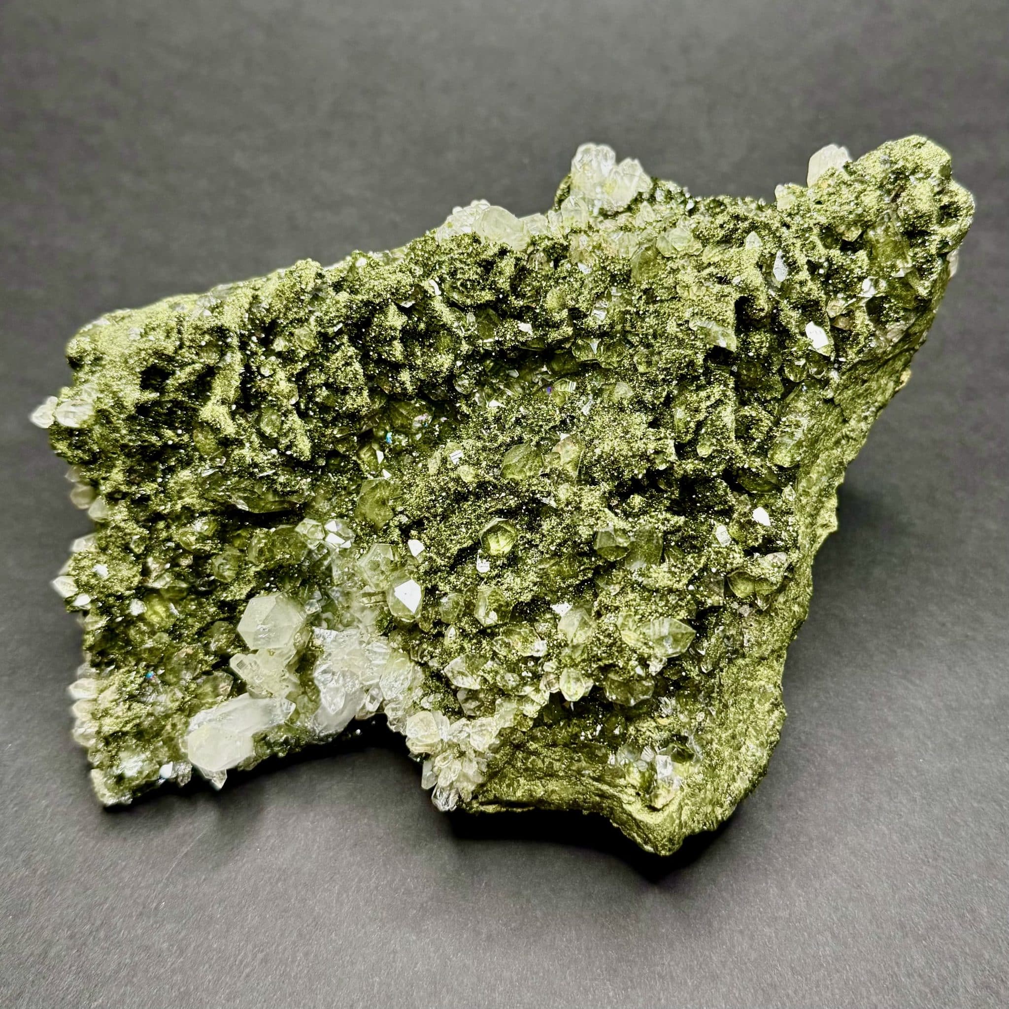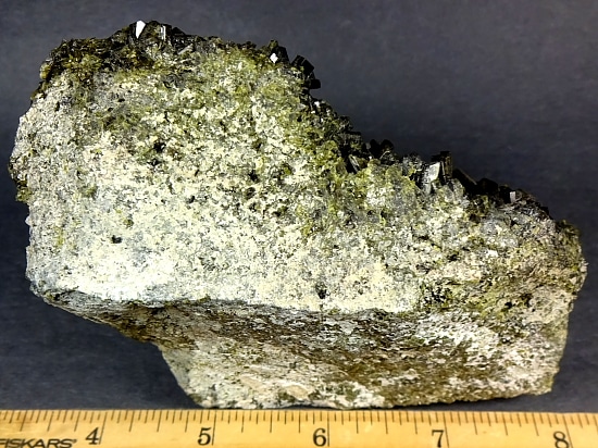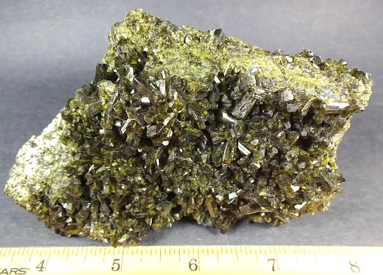 Epidote is an abundant rock-forming mineral, but one of the secondary origin. Many of the characters of the mineral vary with the amount of iron present. Prismatic, columnar crystals, often shiny, finely striated faces. The color is green, gray, brown or nearly black but usually a characteristic shade of yellowish-green or pistachio green.