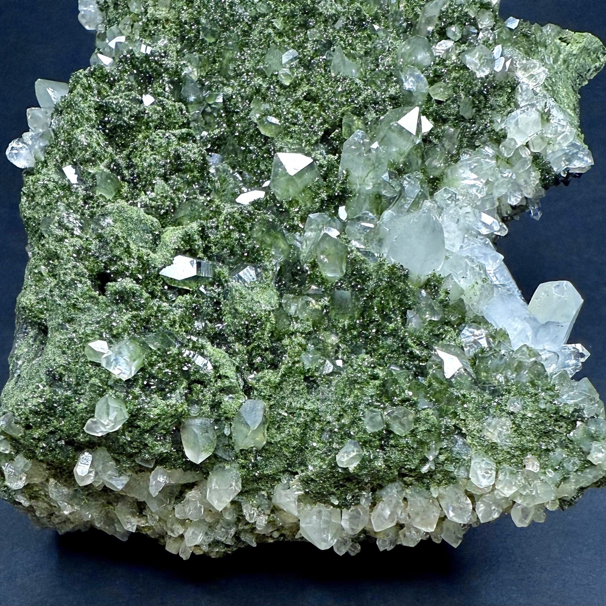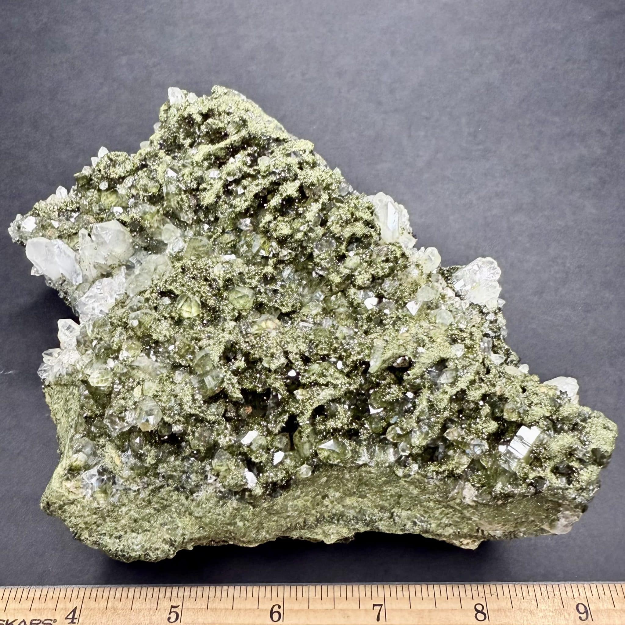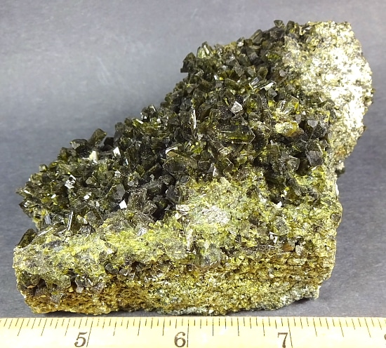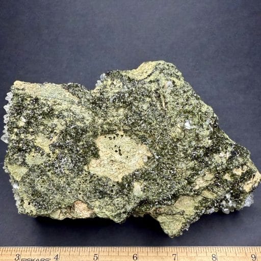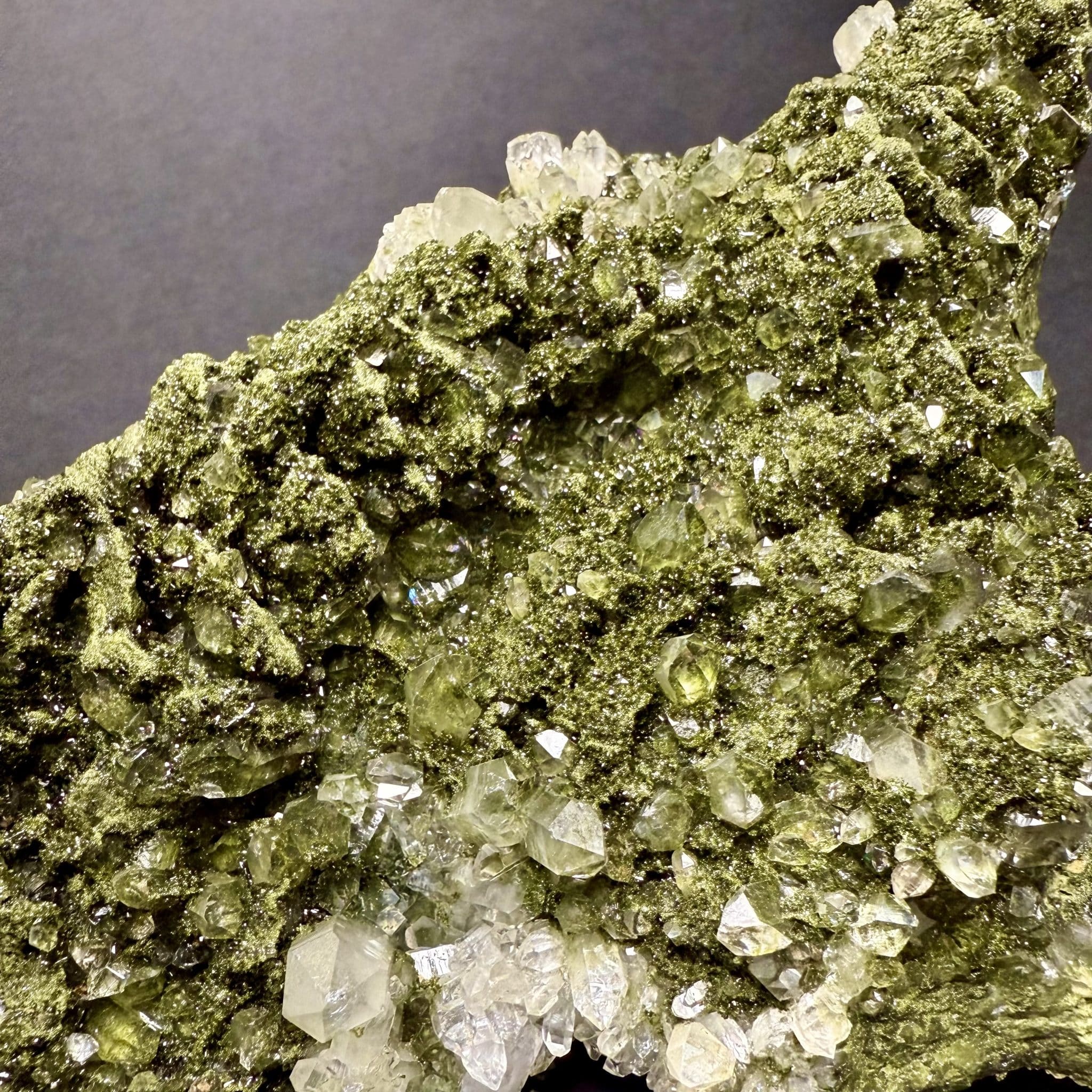 Epidote is an abundant rock-forming mineral, but one of the secondary origin. Many of the characters of the mineral vary with the amount of iron present. Prismatic, columnar crystals, often shiny, finely striated faces. The color is green, gray, brown or nearly black but usually a characteristic shade of yellowish-green or pistachio green.