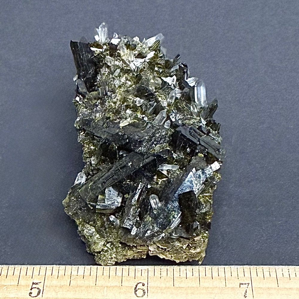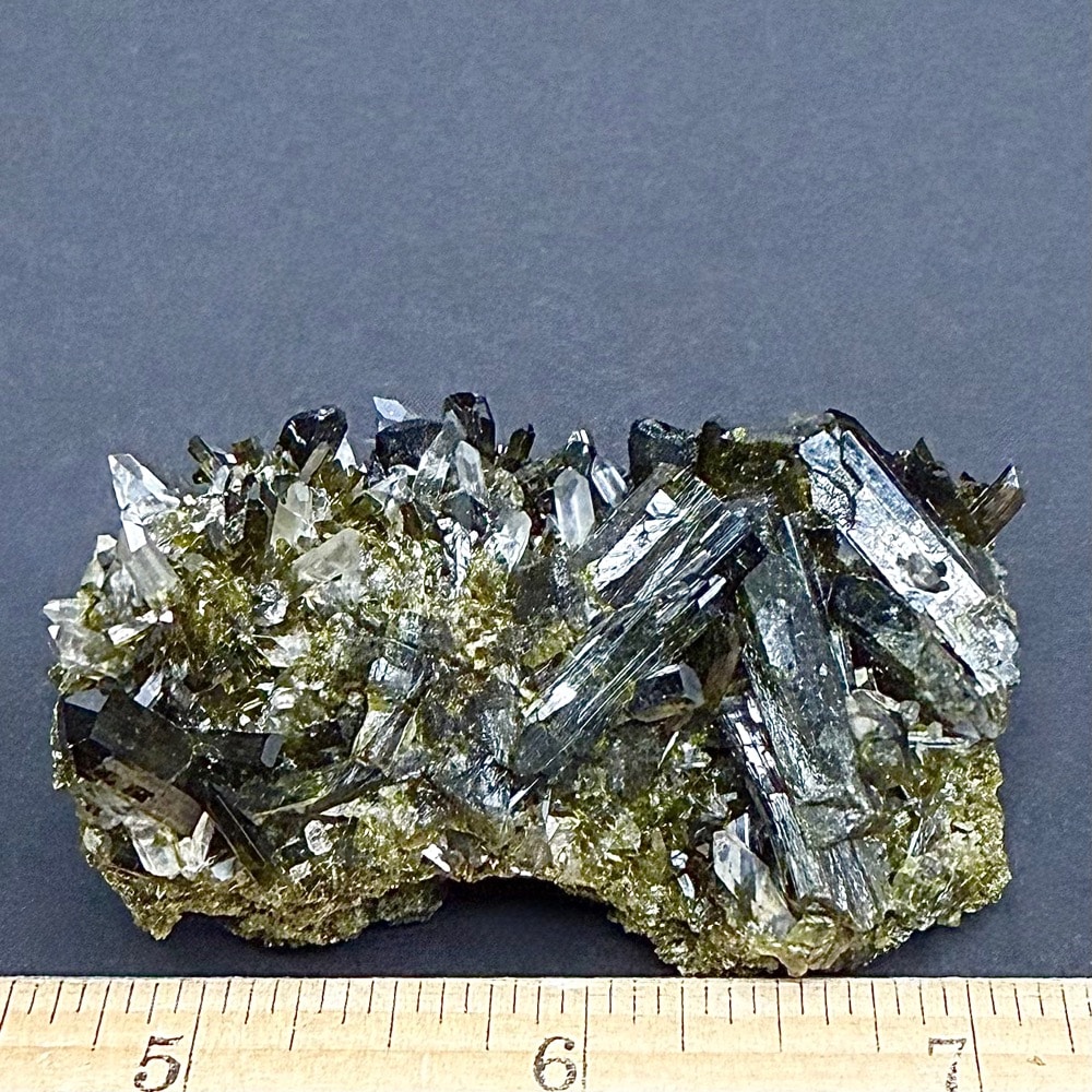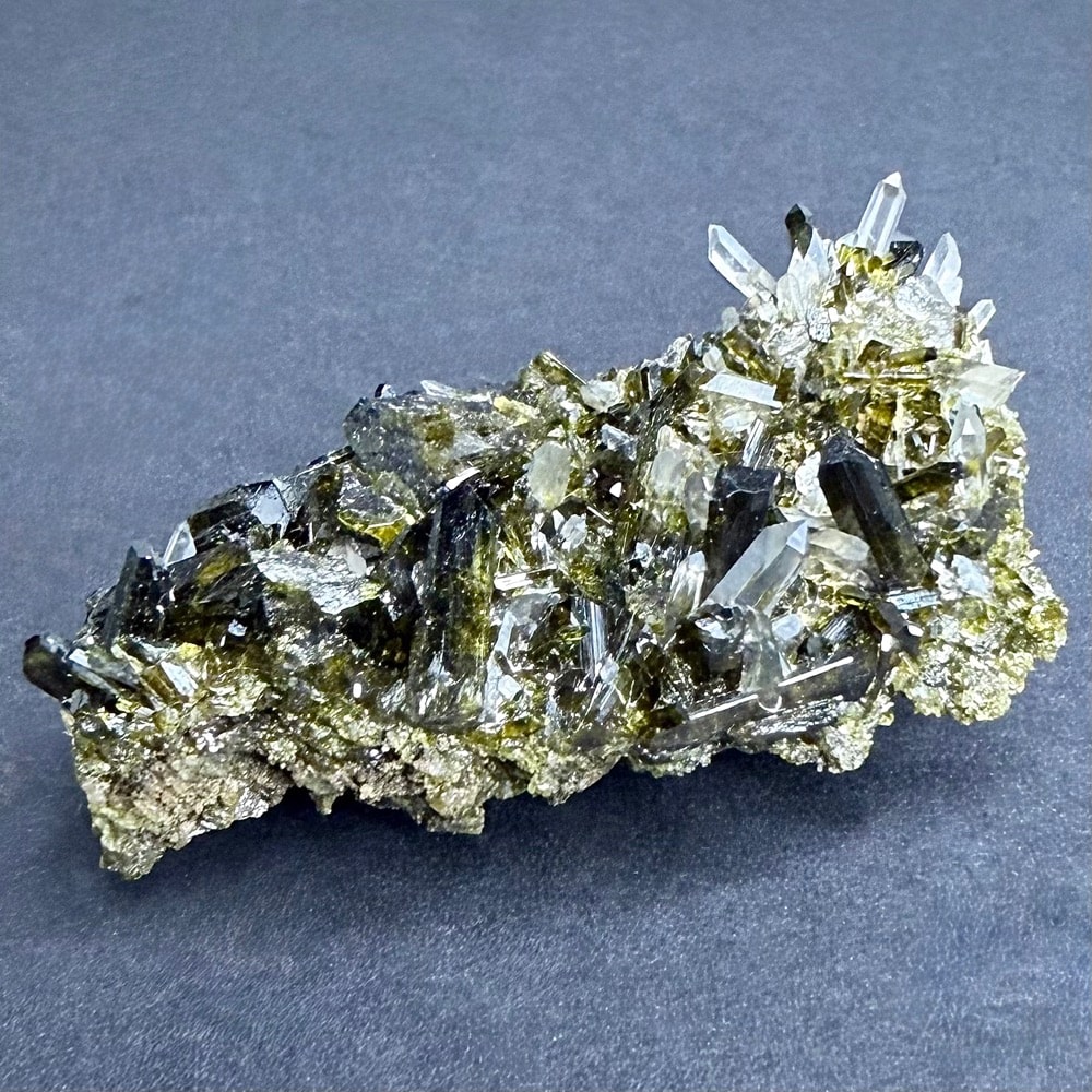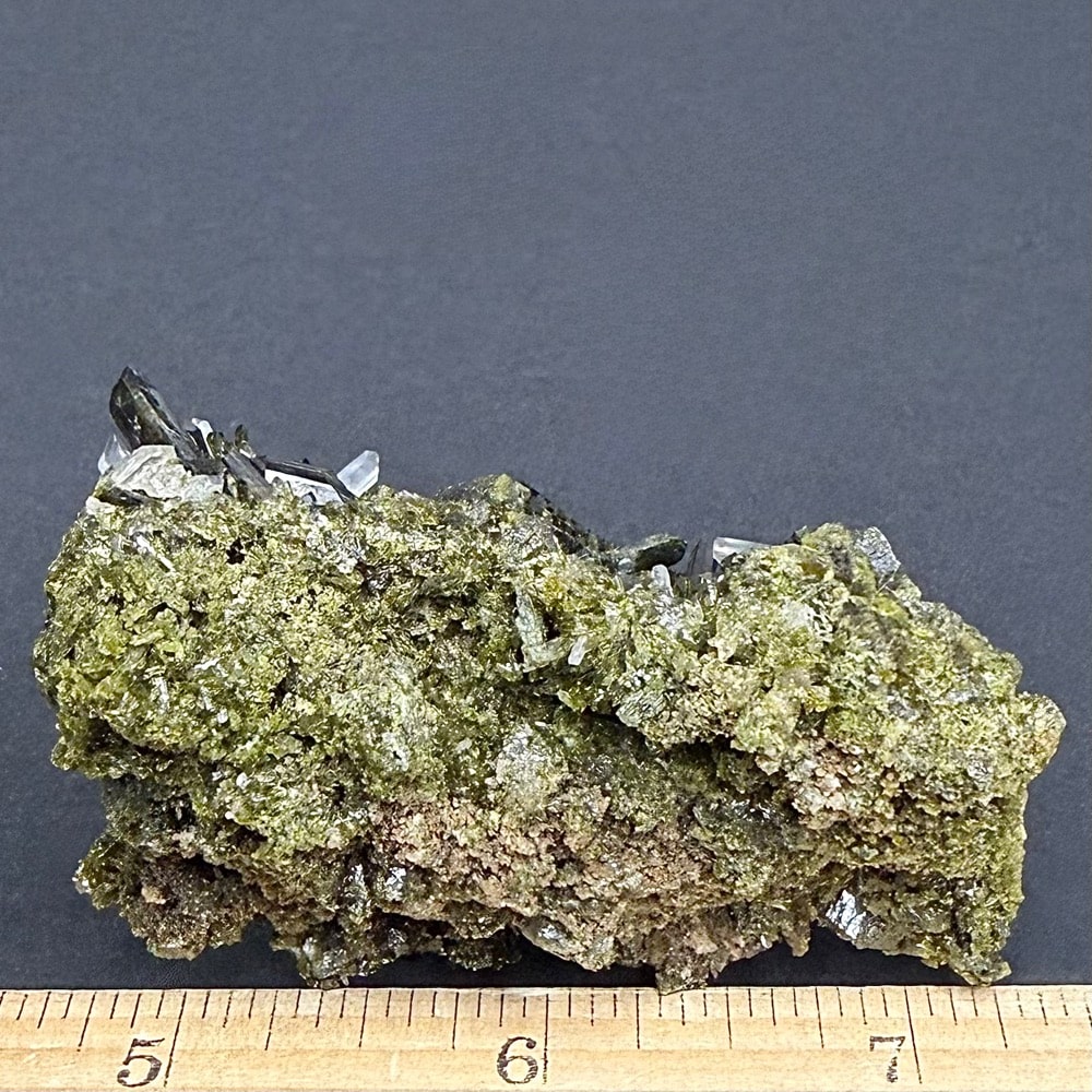 Epidote is an abundant rock-forming mineral, but one of the secondary origin. Many of the characters of the mineral vary with the amount of iron present. Prismatic, columnar crystals, often shiny, finely striated faces. The color is green, gray, brown or nearly black but usually a characteristic shade of yellowish-green or pistachio green.