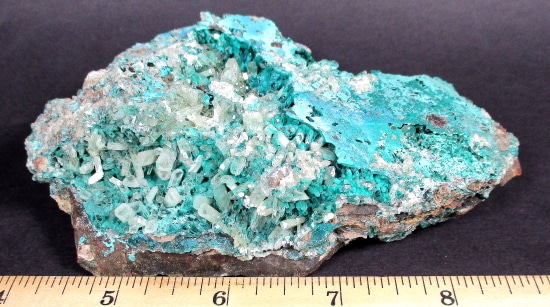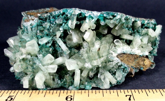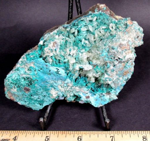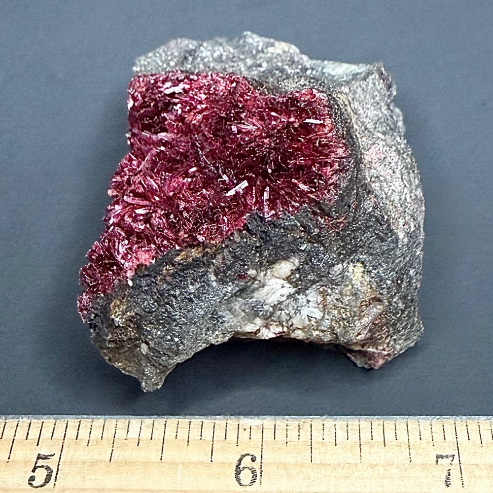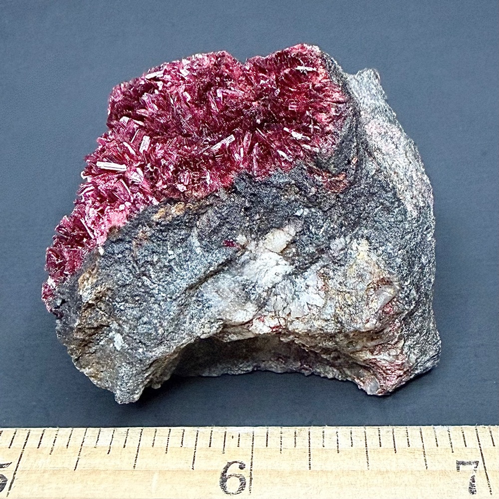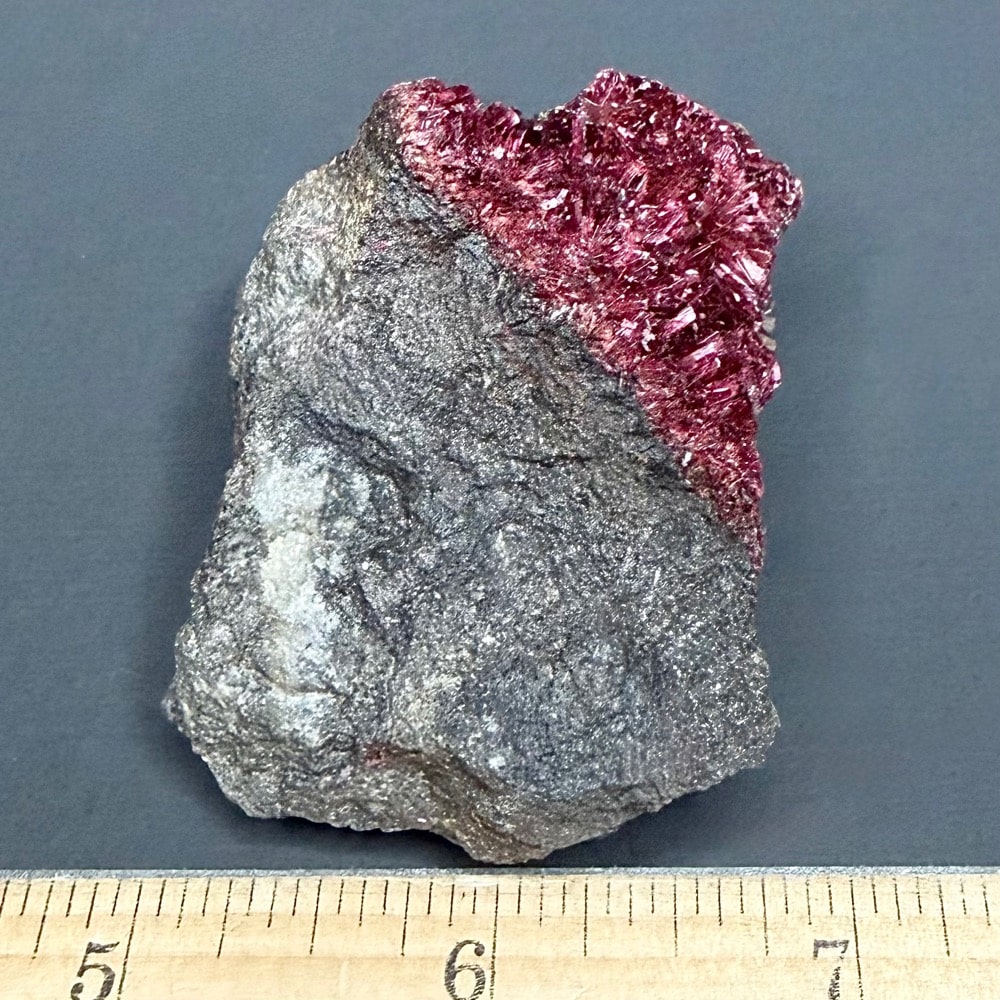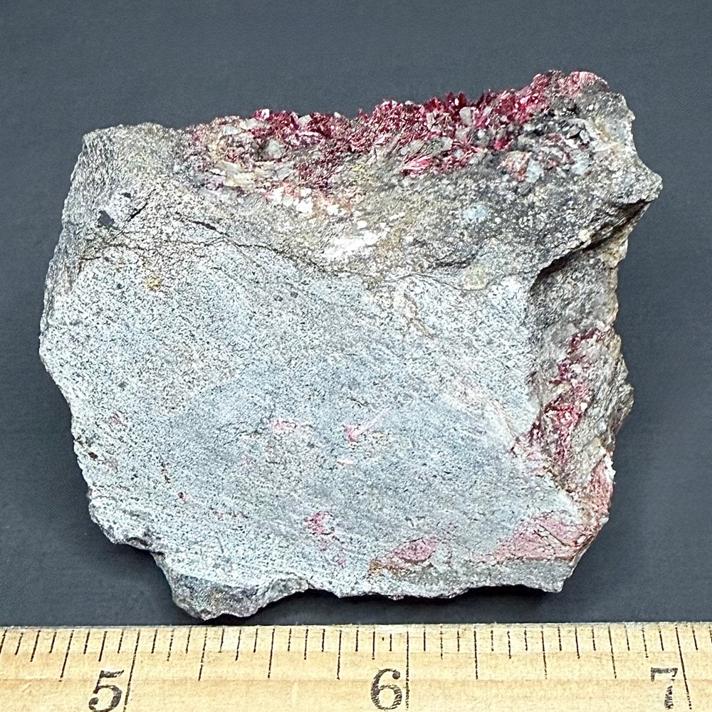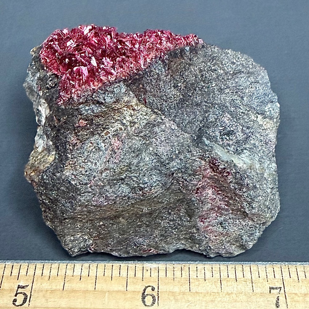Erythrite occurs as a secondary coating on arsenide minerals and is a bright crimson, pink in color. The bright color or “Cobalt Bloom” was used to spot cobalt veins of ore. Most Erythrite is found in the form of crusts but specimens from Morocco have larger crystals of the unique and attractive red-purple color.