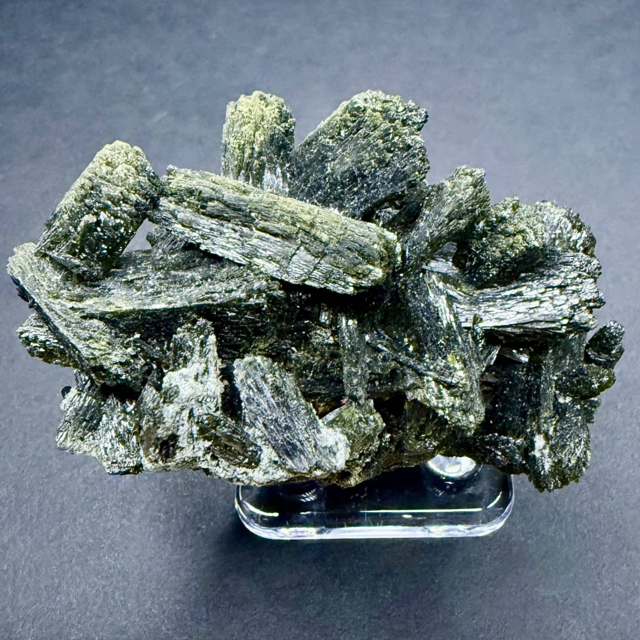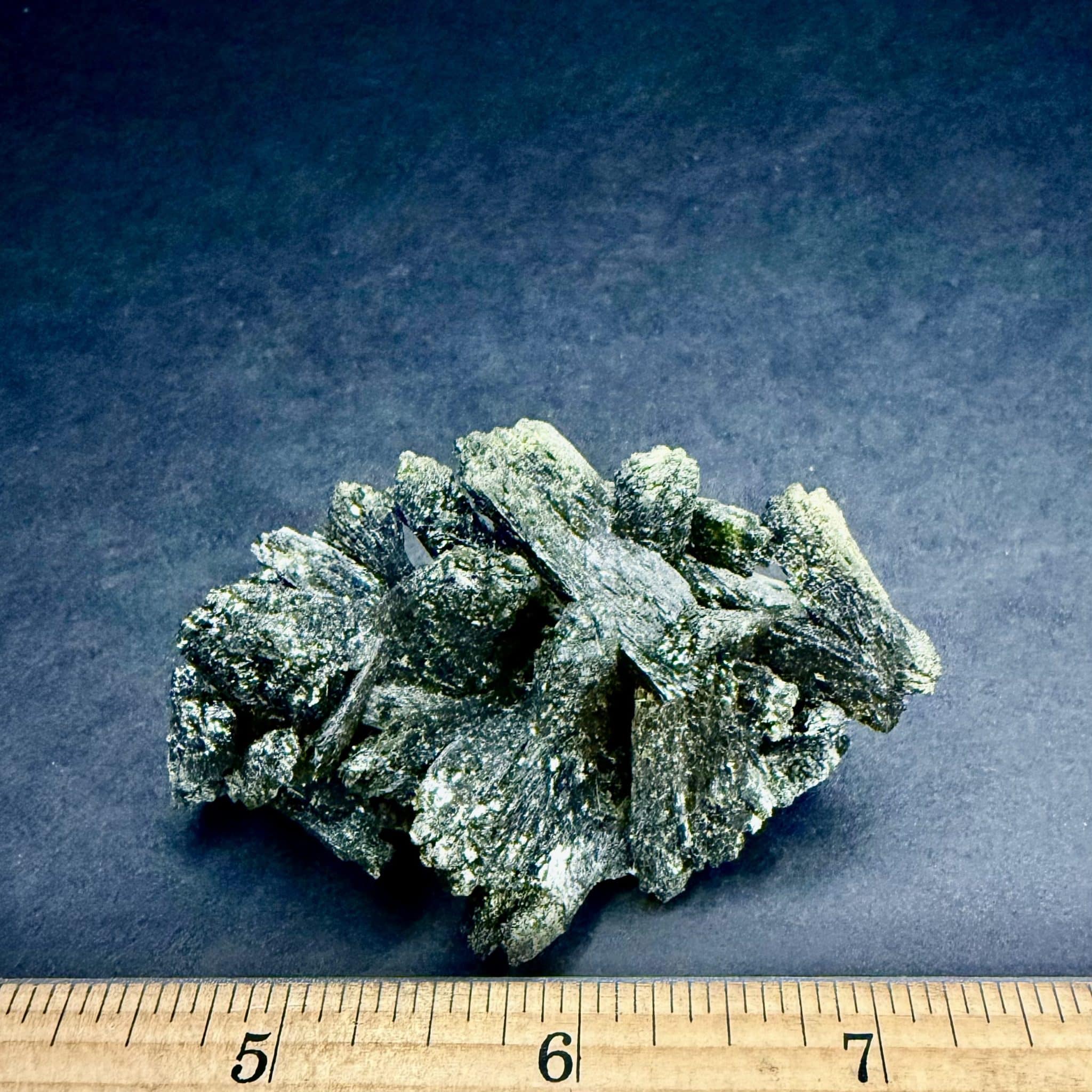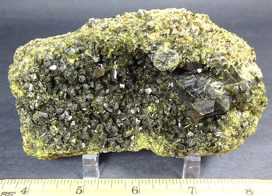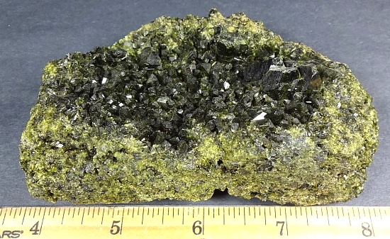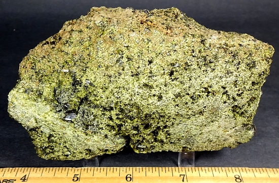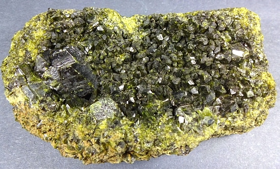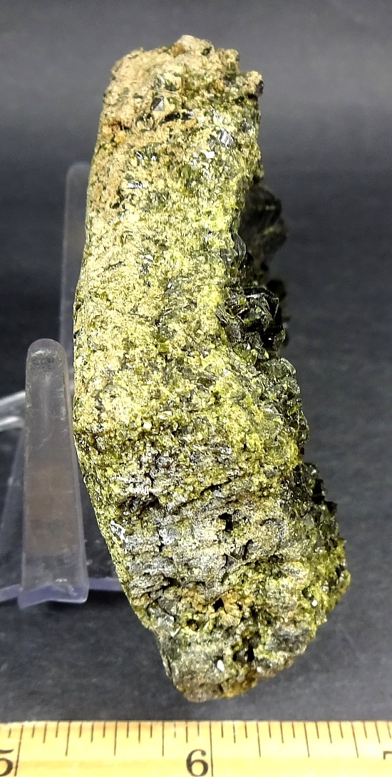 Epidote is an abundant rock-forming mineral, but one of the secondary origin. Many of the characters of the mineral vary with the amount of iron present. Prismatic, columnar crystals, often shiny, finely striated faces. The color is green, gray, brown or nearly black but usually a characteristic shade of yellowish-green or pistachio green.