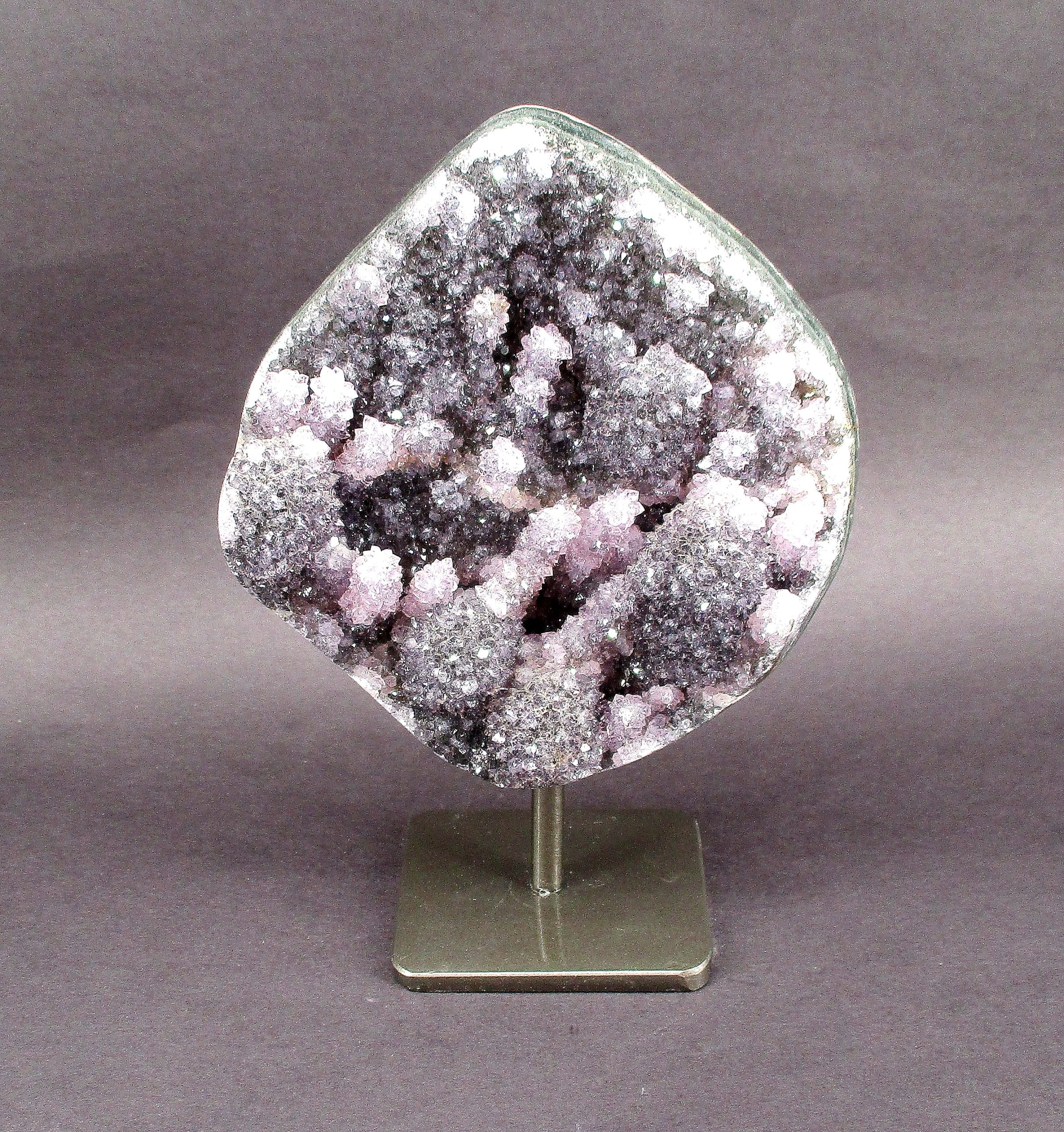 PR1009: Amethyst Geode on a Metal Stand.Locality: Brazil.    Selection: Polished and rough specimen.