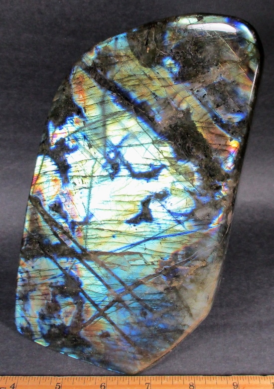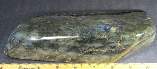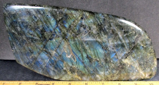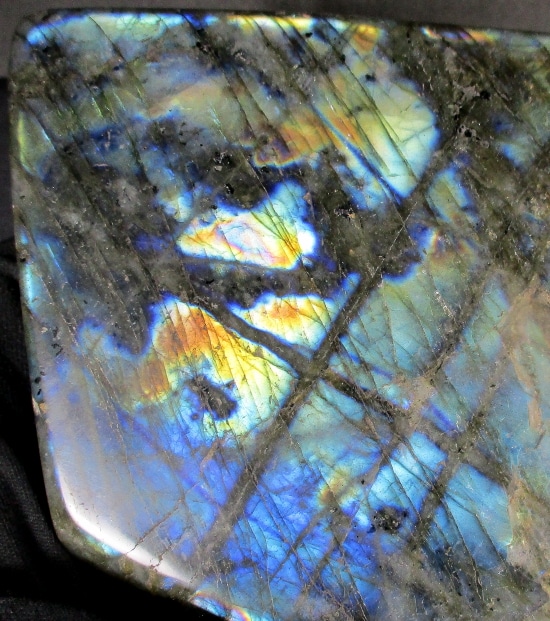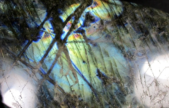Labradorite is a Feldspar mineral that occurs in large Crystal masses in Anorthosite and shows an iridescence or “play of colors.” Gemstone varieties of Labradorite exhibiting a high degree of iridescence are Spectrolite, Moonstone and Sunstone. High quality samples with good iridescent qualities are desired for jewelry.