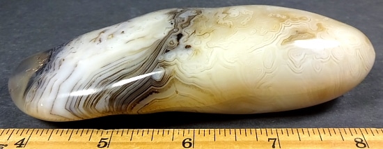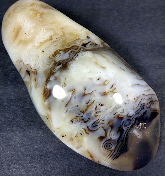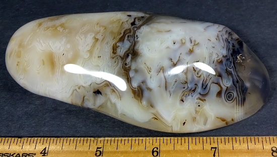 Agate from India comes in a variety of types in Blackskin, Whiteskin or Yellowskin. The most popular are those containing moss. Most of the moss agate, (called suabhaji), comes from the Bud-Kotra area in Morvi in the area around Khambat (“Camaby”) in Gujarat Province, India. They are usually found buried about 2 feet under the surface and must be dug up. When cut and finished they take an excellent polish. The agate is normally clear or clouded with inclusions of dark-green or red-brown moss.