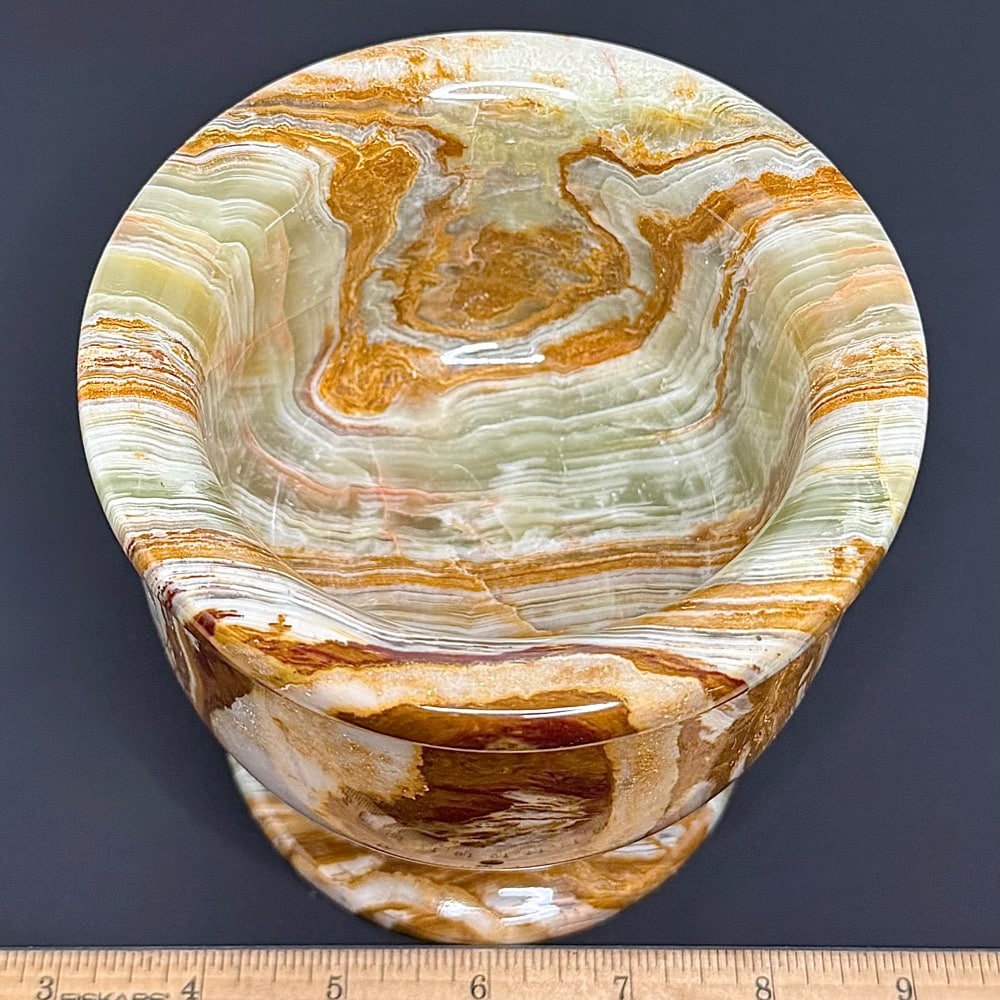 Onyx is a banded variety of Calcite.  The colors of its bands range from white to almost every color except shades of purple, blue and black.  It is used for vases, bowls, beads, cabochons and other items.  This type is found in Mexico and Pakistan and is often carved and polished into various items.  This material is much more readily available and softer than the gemstone commonly called Black Onyx which is a silica gem.
