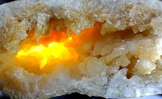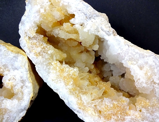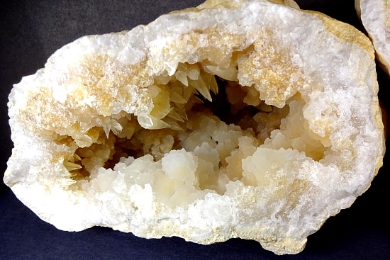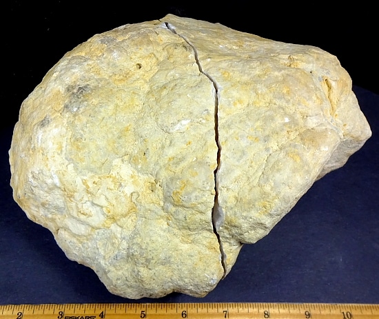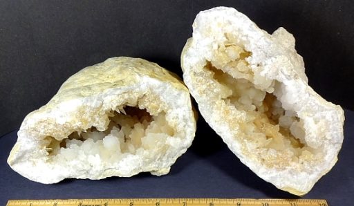 Geodes are geological rock formations which occur in sedimentary and certain volcanic rocks.  They are essentially rock cavities or vugs with internal Crystal formations or concentric banding.  The exterior is generally Limestone while the interior contains Quartz Crystals and/or Chalcedony deposits.  If the Geode is completely filled with Crystal, being solid all the way through, it is then called a nodule.