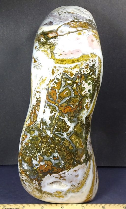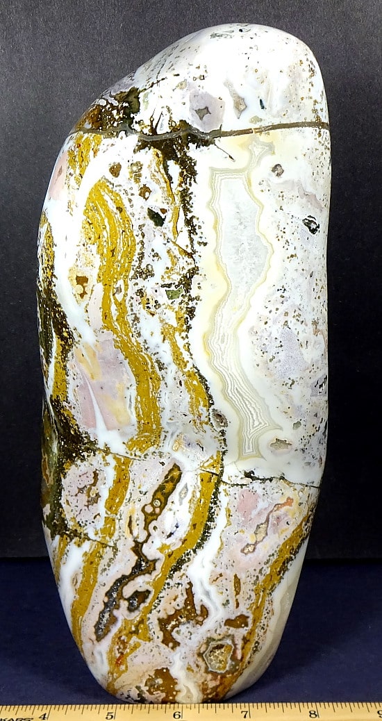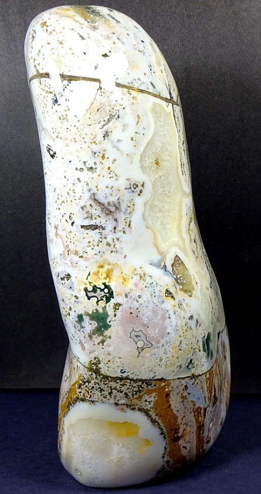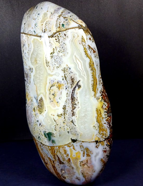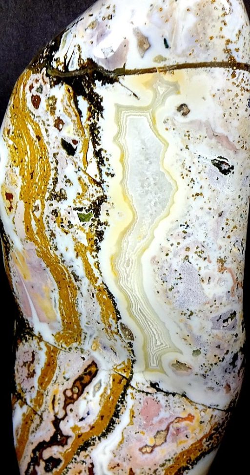 Agates mostly occur as nodules in volcanic rocks or waters containing silica in solution possibly derived from the decomposition of silicates in the lava. The siliceous matter is deposited in regular layers resulting in the banded or striped formation.