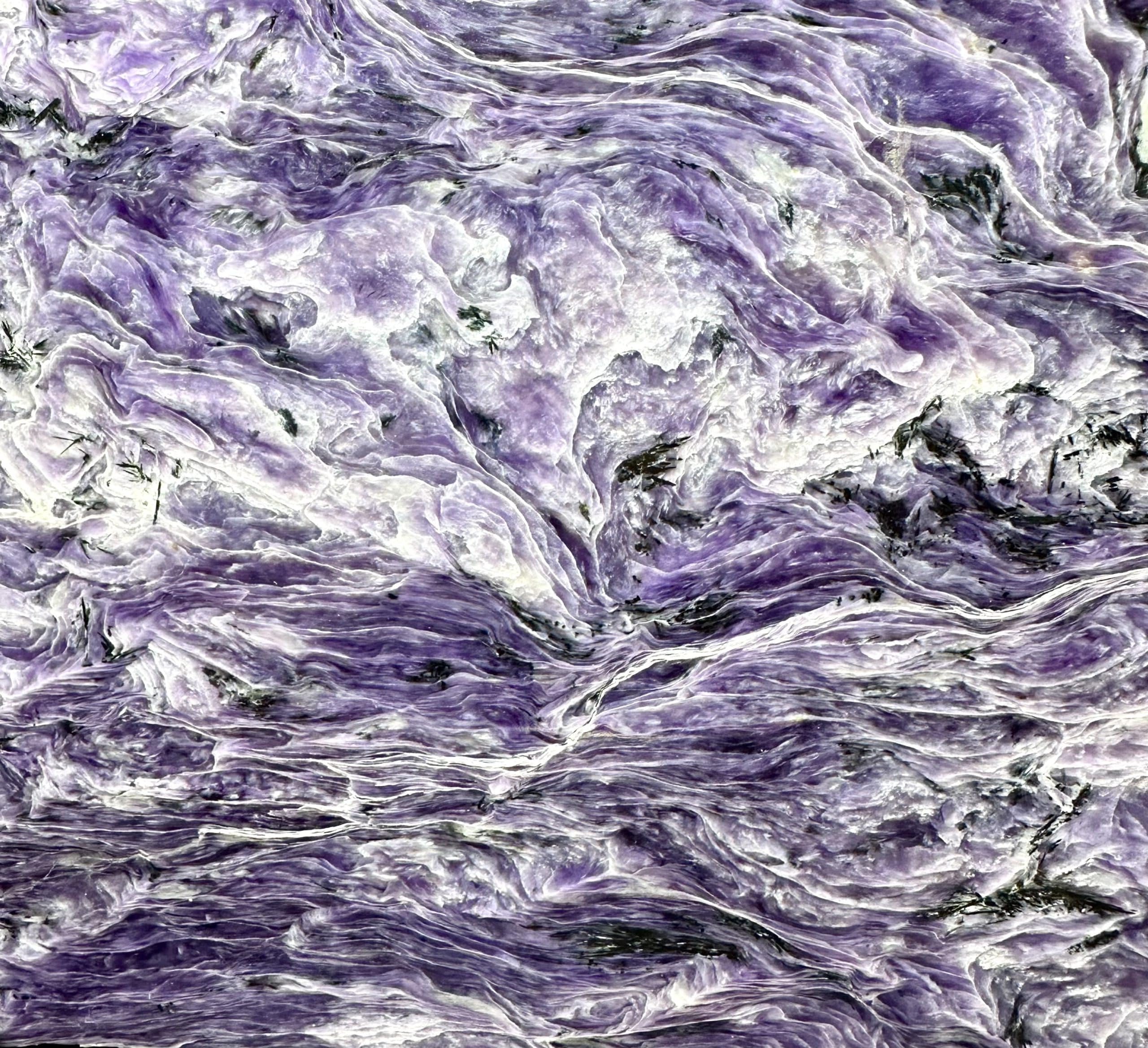 Charoite is newly found mineral, first discovered in the 1940s and described to the world in 1978. It is found only in Siberia, Russia and is a translucent lavender to purple color. Charoite has a swirling, fibrous appearance and is strictly massive in nature. It is used as an ornamental stone and sometimes as a gemstone.