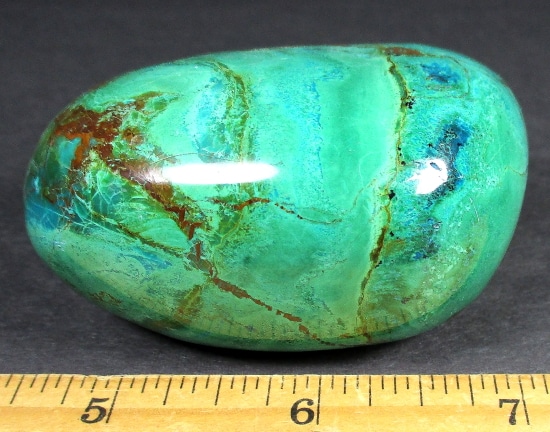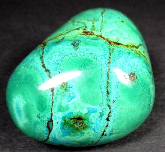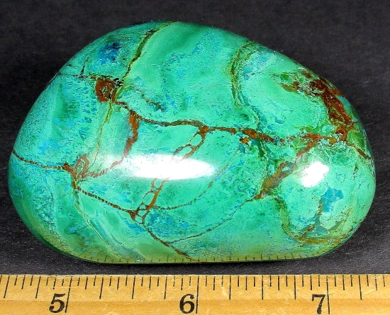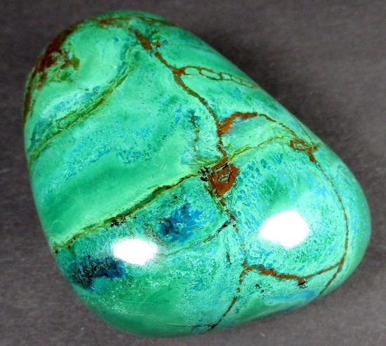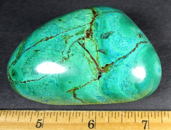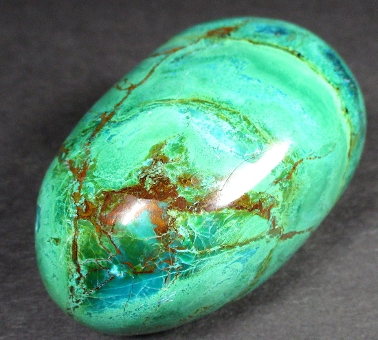 Chrysocolla is of secondary origin and forms in the oxidation zones of copper ore. Some associated minerals are Quartz, Limonite, Azurite, and Malachite and Chrysocolla is often confused with Turquoise as they are similar in color. It gets its name from Greek chrysos “gold” and kolla “glue”. It is known among Native American cultures as a healing stone and said to promote calm and level headedness.